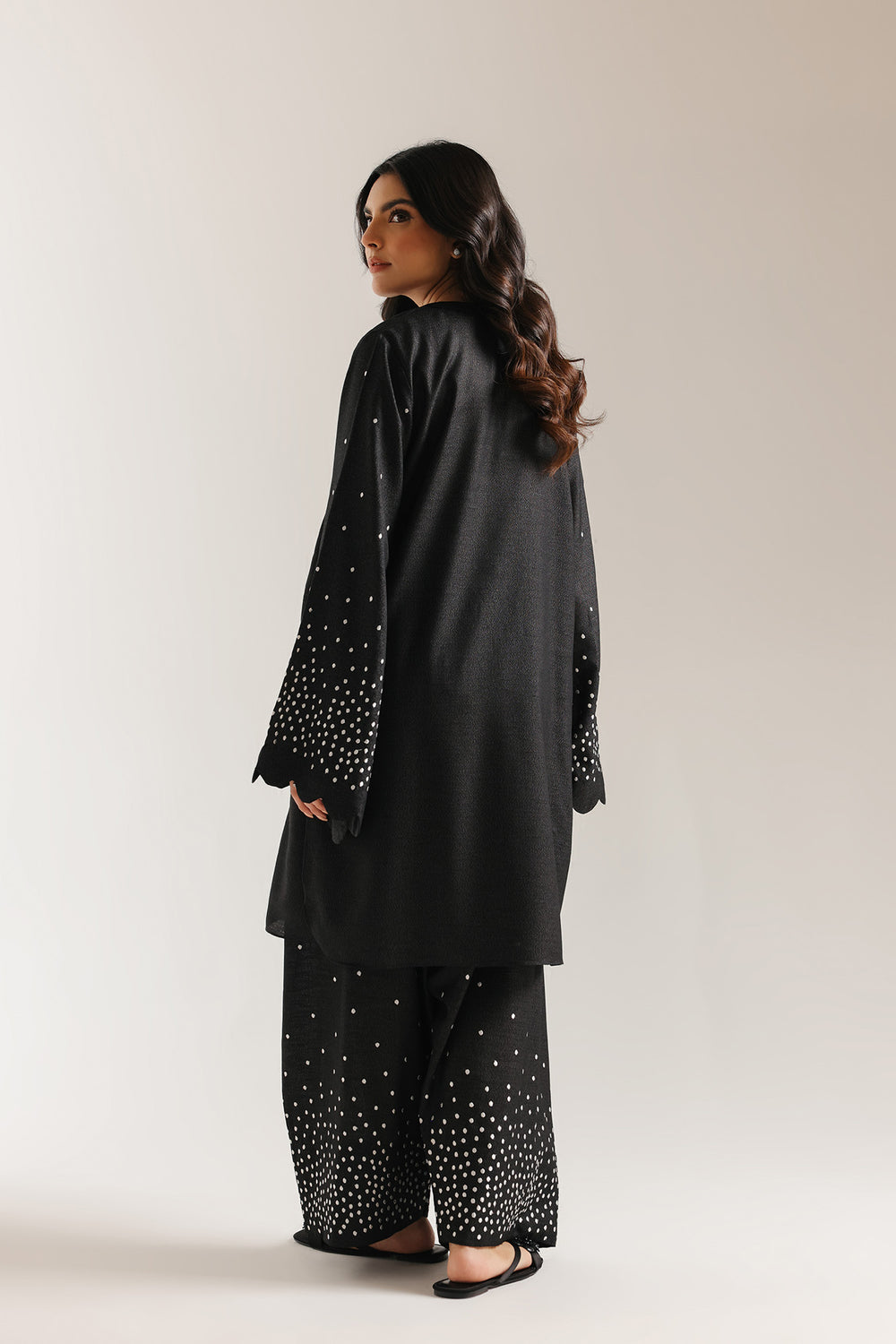 Step into elegance with this stunning black ensemble. The classy shirt showcases a mesmerizing composition beautifully accented with crisp white embroidery at front panel and adorned with small polka dot prints at sleeves in contrasted white hues creating a starry night scene. The matching shalwar completes the set with the same white print detail near the hem. Perfect for evening occasions, this coordinated ensemble combines rich texture and refined style in a timeless black palette.
