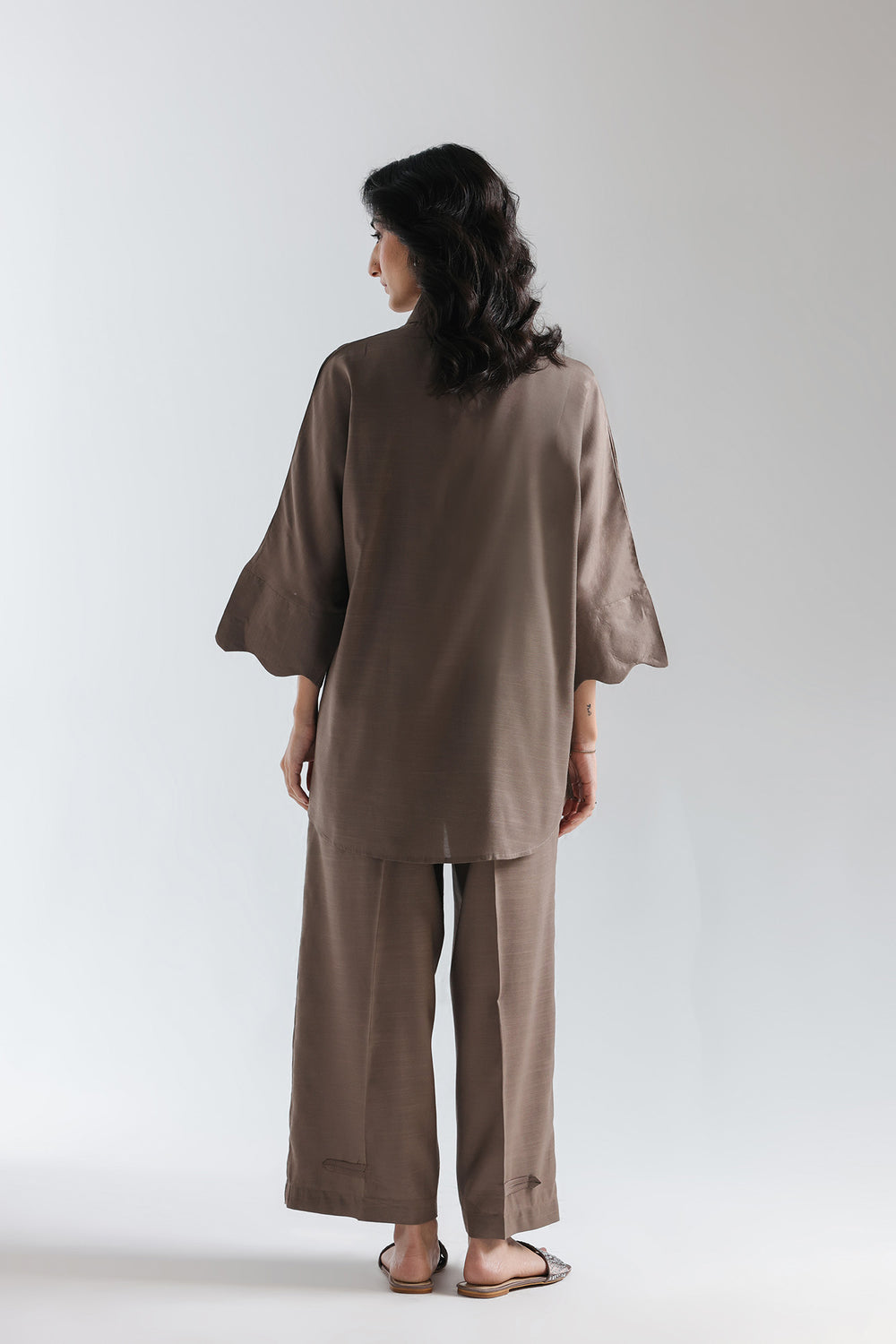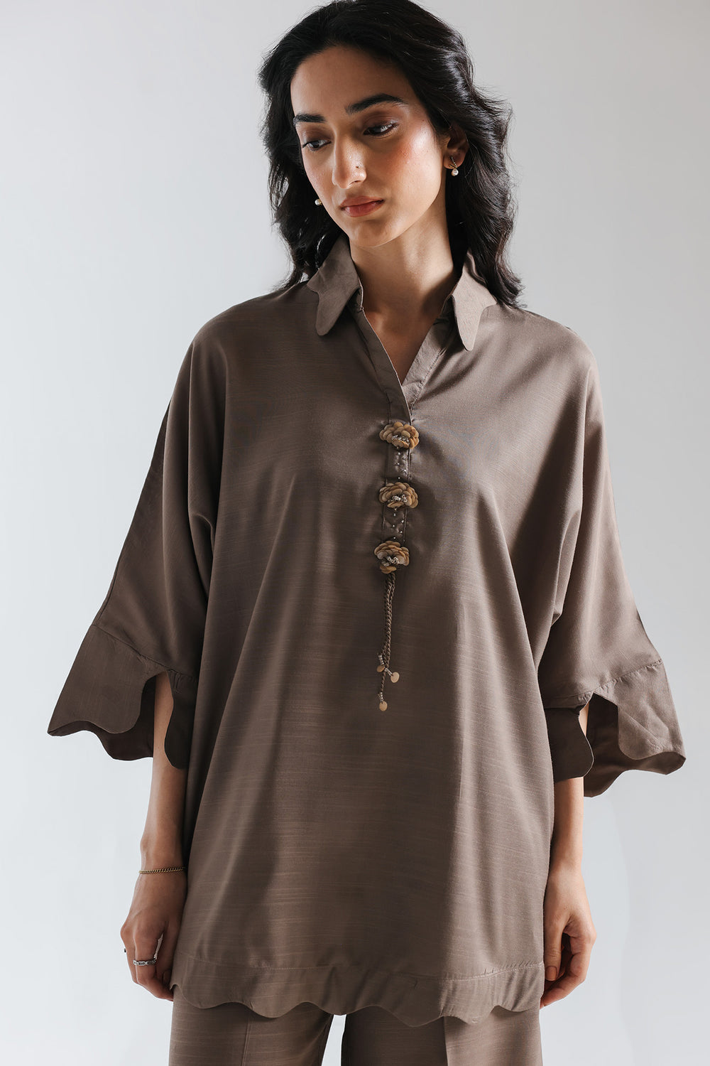 Discover the artisanal charm of this oversized tunic, expertly crafted with traditional detailing. The relaxed A-line silhouette flows gracefully to mid-thigh, anchored by a collared V-neck and decorative wooden button placket. Flared three-quarter sleeves feature signature scalloped edges, with hand-stitched zigzag embroidery. The matching wavy hemline completes this piece with understated elegance. Perfect for those seeking comfort without compromising on cultural craftsmanship and refined style.