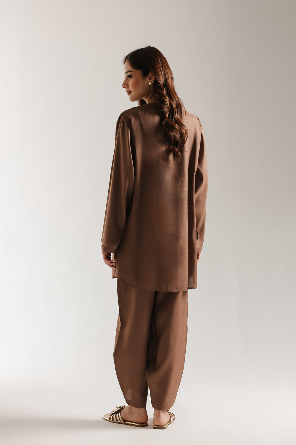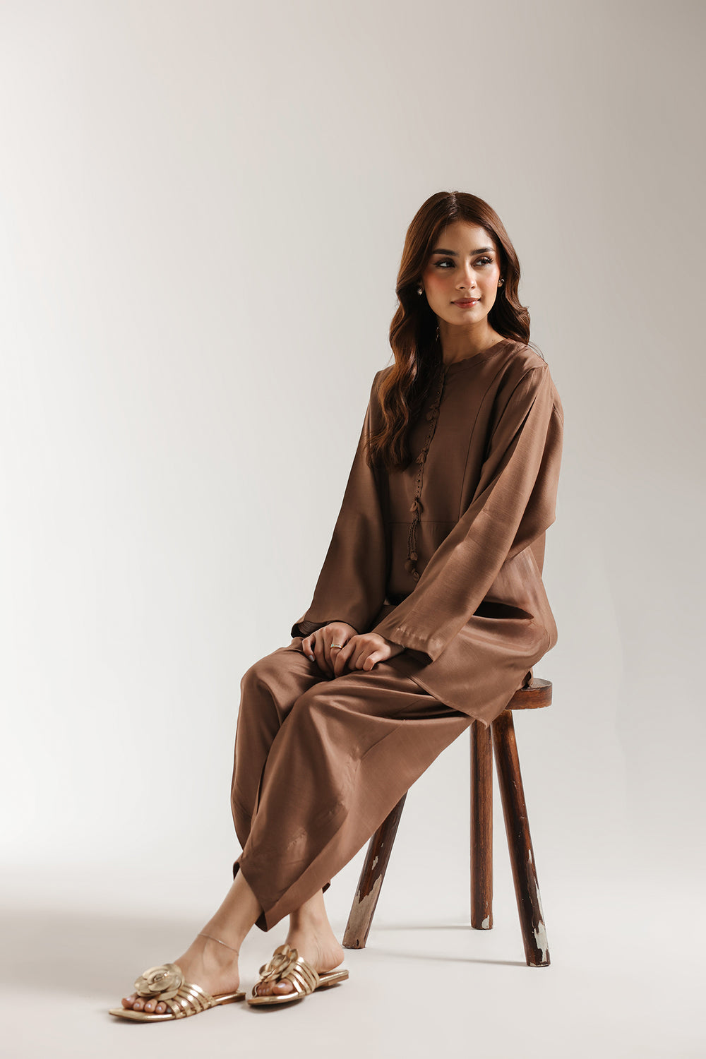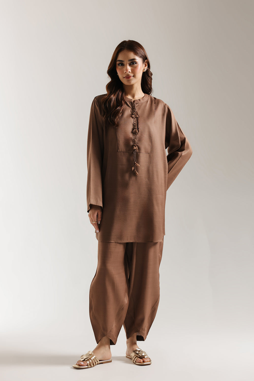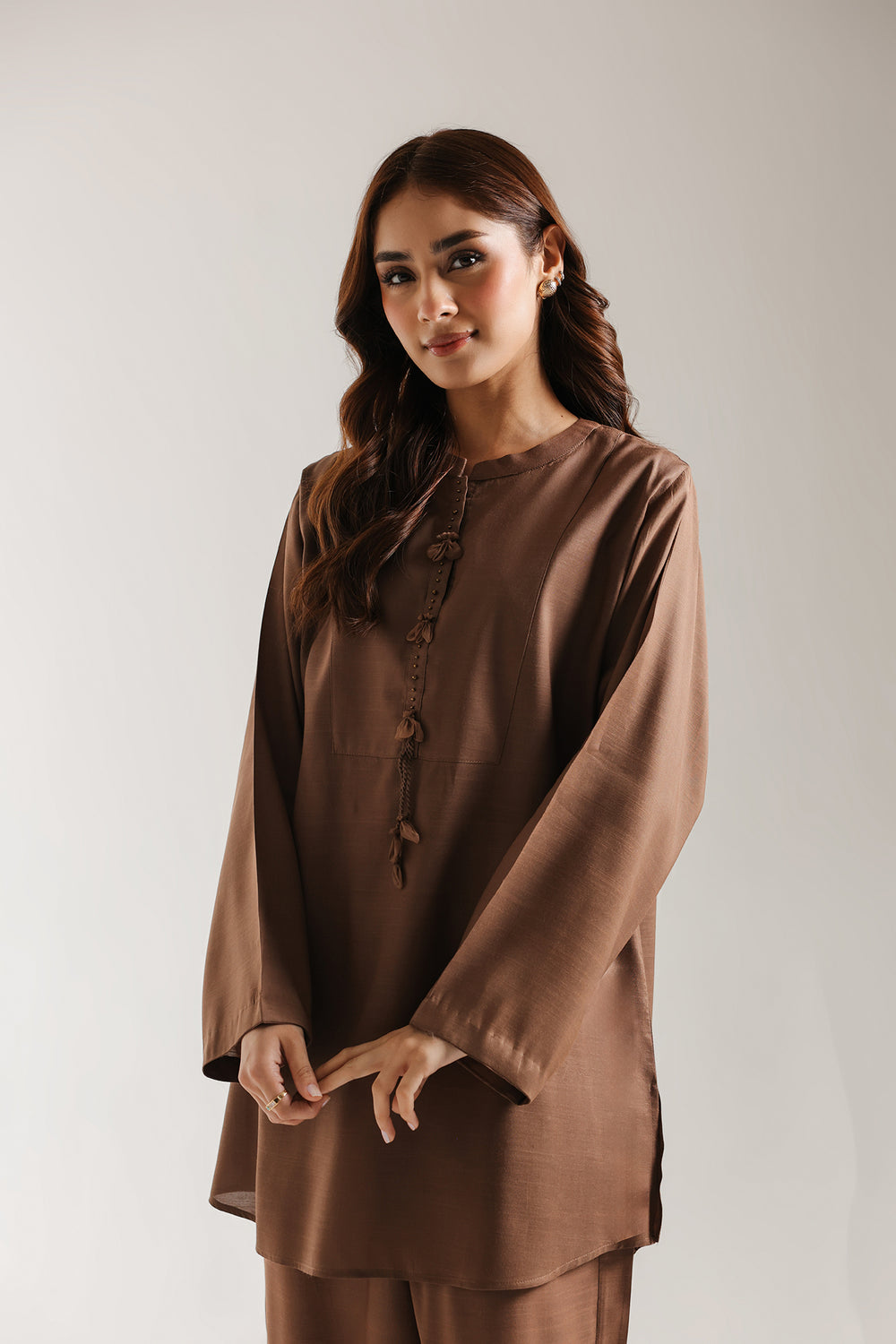 Elegant taupe shade ensemble for women, featuring a flattering front yoke detail and full sleeves. The round neckline offers a classic, comfortable fit perfect for both professional settings and special occasions. This versatile piece combines timeless style with practical design, making it an essential addition to any wardrobe. Paired with a trendy tulip silhouette shalwar, the structured design and quality construction ensure you'll look polished and put-together every time you wear it.