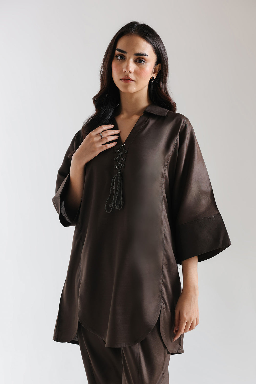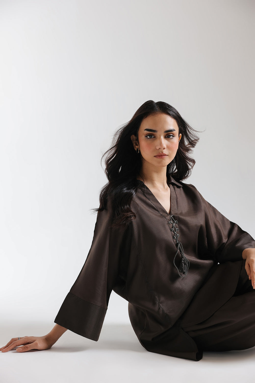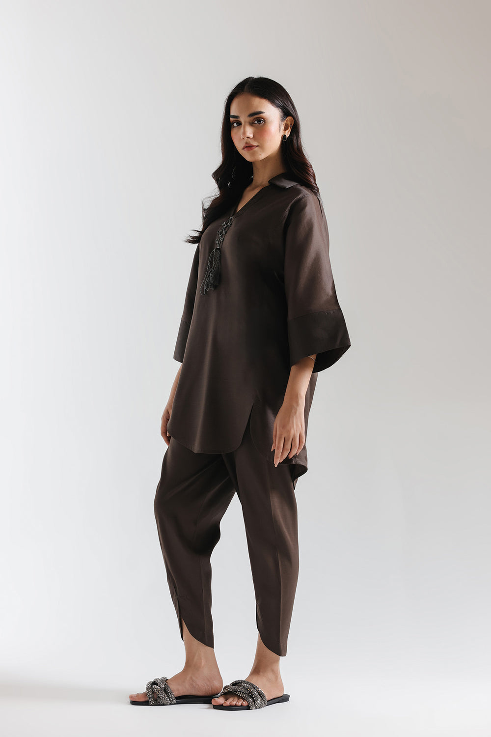 This sophisticated two-piece Eastern ensemble showcases timeless elegance in deep, rich dark brown. The tunic-style top features a refined V-neck with a delicate spread collar, accented by an intricate laced-up closure in contrasting dark tones. Dramatic bell sleeves in three-quarter length create movement and visual interest, finished with defined cuffs. The asymmetrical hemline gracefully curves around the upper thigh, offering a modern silhouette while honoring traditional design. Paired with matching trousers, this printed suit combines classic Eastern aesthetics with contemporary styling, perfect for both formal occasions and elevated everyday wear.