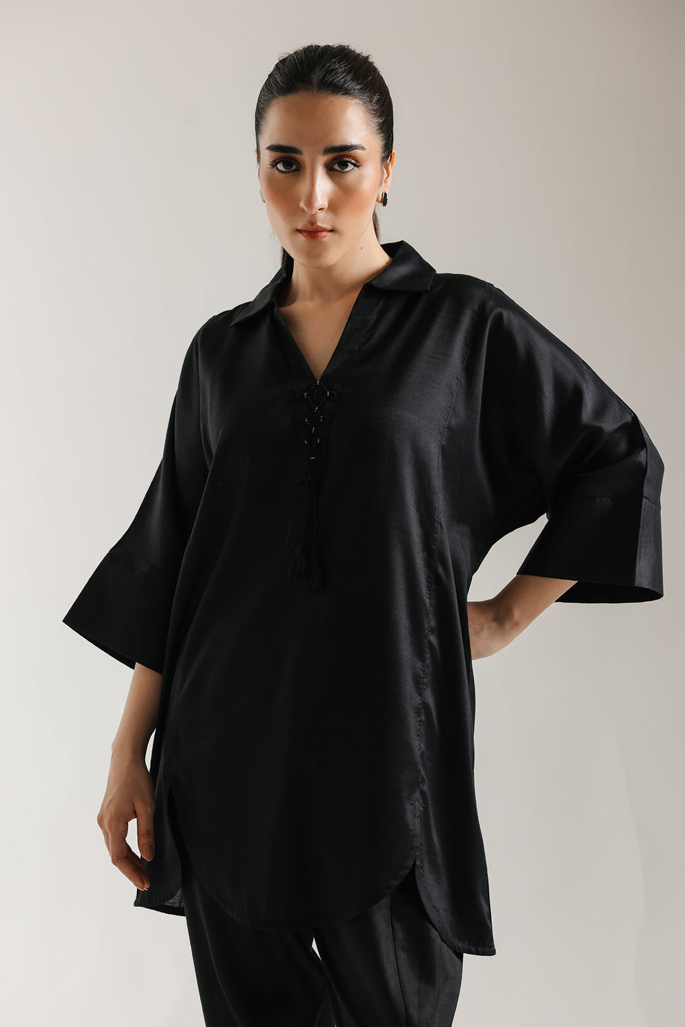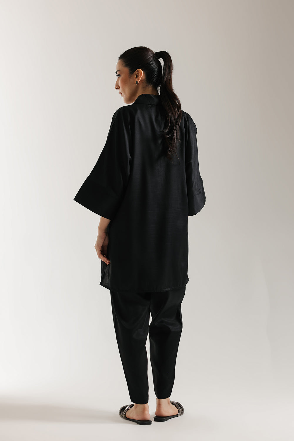 Elevate your everyday wardrobe with this sophisticated solid suit, expertly designed for the modern woman. The black short kurta features a refined round hem and graceful quarter bell sleeves that balance contemporary silhouette with traditional elegance. Paired with a coordinating shalwar, this ensemble delivers versatile styling for casual gatherings and office wear. The thoughtful sleeve design adds movement and dimension, while the printed detailing brings visual interest to your look.