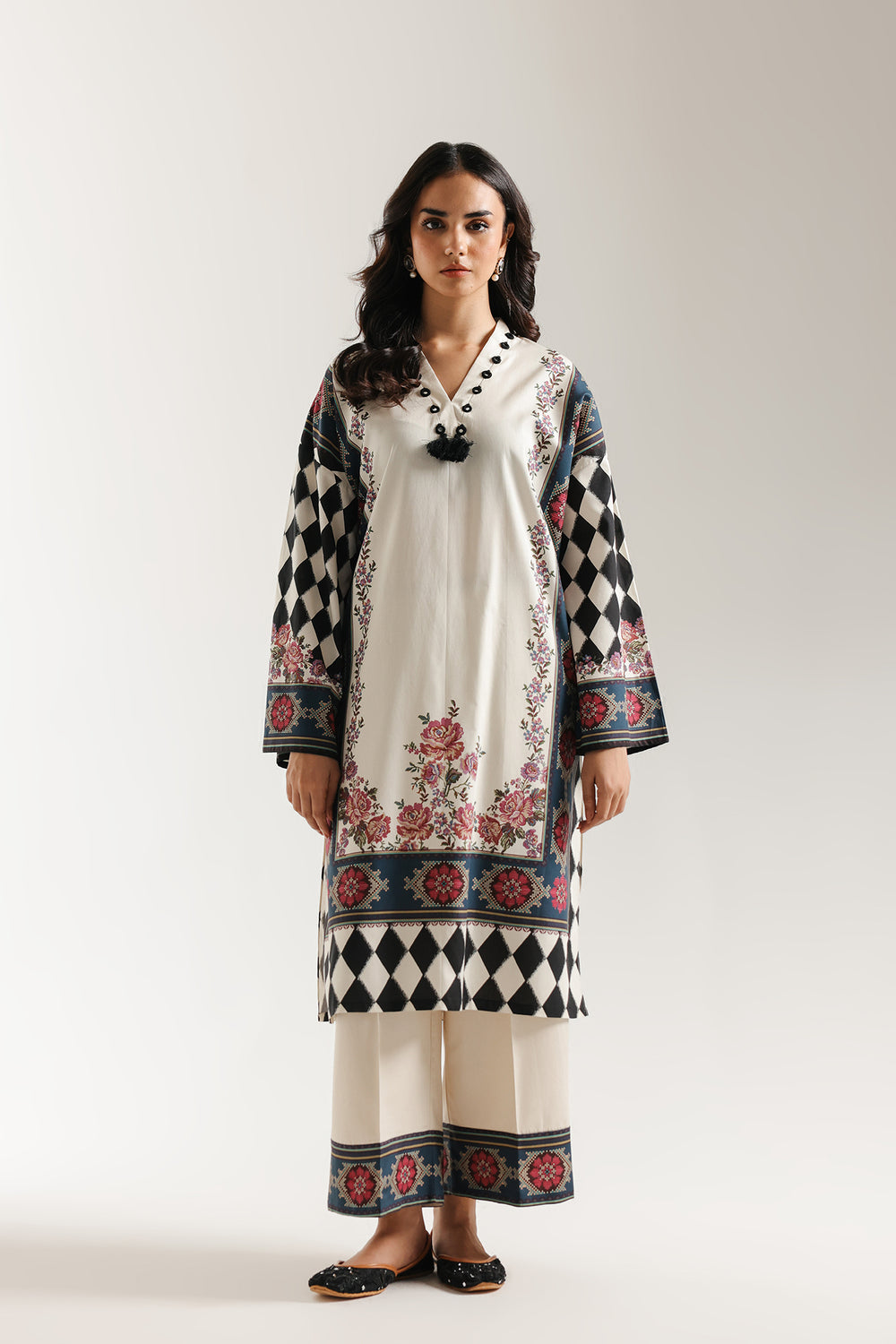 Make a striking statement with this stunning printed suit, which boldly combines traditional motifs with graphic modern elements. The straight-cut kurta features a beautiful off-white canvas with a vibrant floral wreath print across the front and hem in shades of pink, red, and blue. This romantic print is sharply contrasted by a bold black and white harlequin diamond pattern that frames the sides and wide sleeves. The ensemble is perfectly completed with tailored off-white trouser that feature a coordinating geometric and floral border print at the hem, creating an unforgettable, high-impact look.