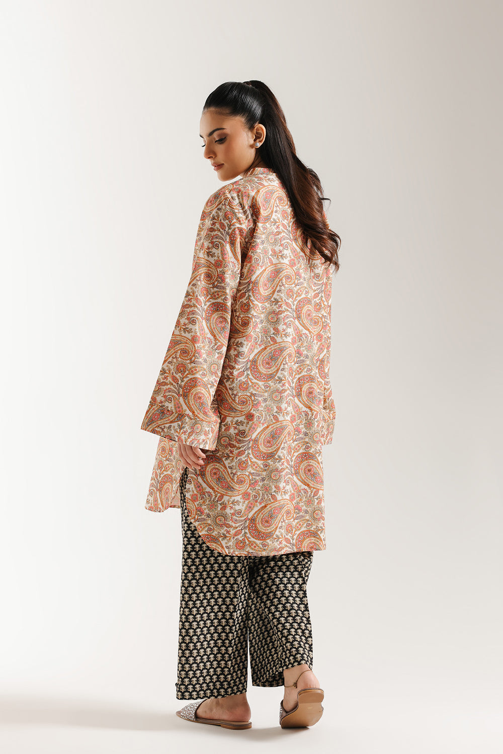 Cannel effortless charm with this sophisticated beige and terracotta printed suit.The ensemble features a shirt in a light beige base, completely covered in an intricate all-over paisley print in warm shades of terracotta, blush, and light green. The shirt has a relaxed fit with a split mandarin collar and dramatic, flared kaftan-style sleeves. This bold top is perfectly contrasted with wide-leg palazzo trouser featuring a fine black and white geometric block print. The mix of traditional motifs and contrasting prints makes this a distinctive and modern statement piece for any occasion.