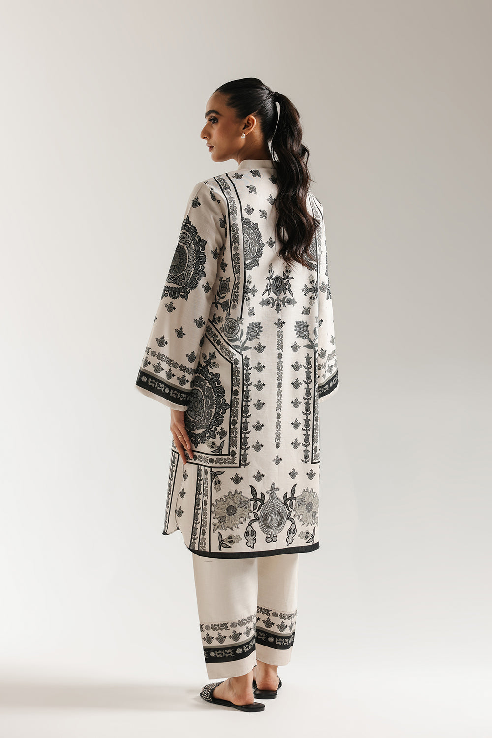 Elevate your everyday style with this striking monochrome printed suit. The straight-cut kurti is rendered in an off-white fabric and features a detailed black and grey print in intricate traditional and stylized floral patterns across the front, back, and sleeves. The elegant band collar and button placket add structure to the fluid design. The ensemble is completed by coordinating shalwar with a matching bold printed border at the hem, creating a sophisticated and timeless look.