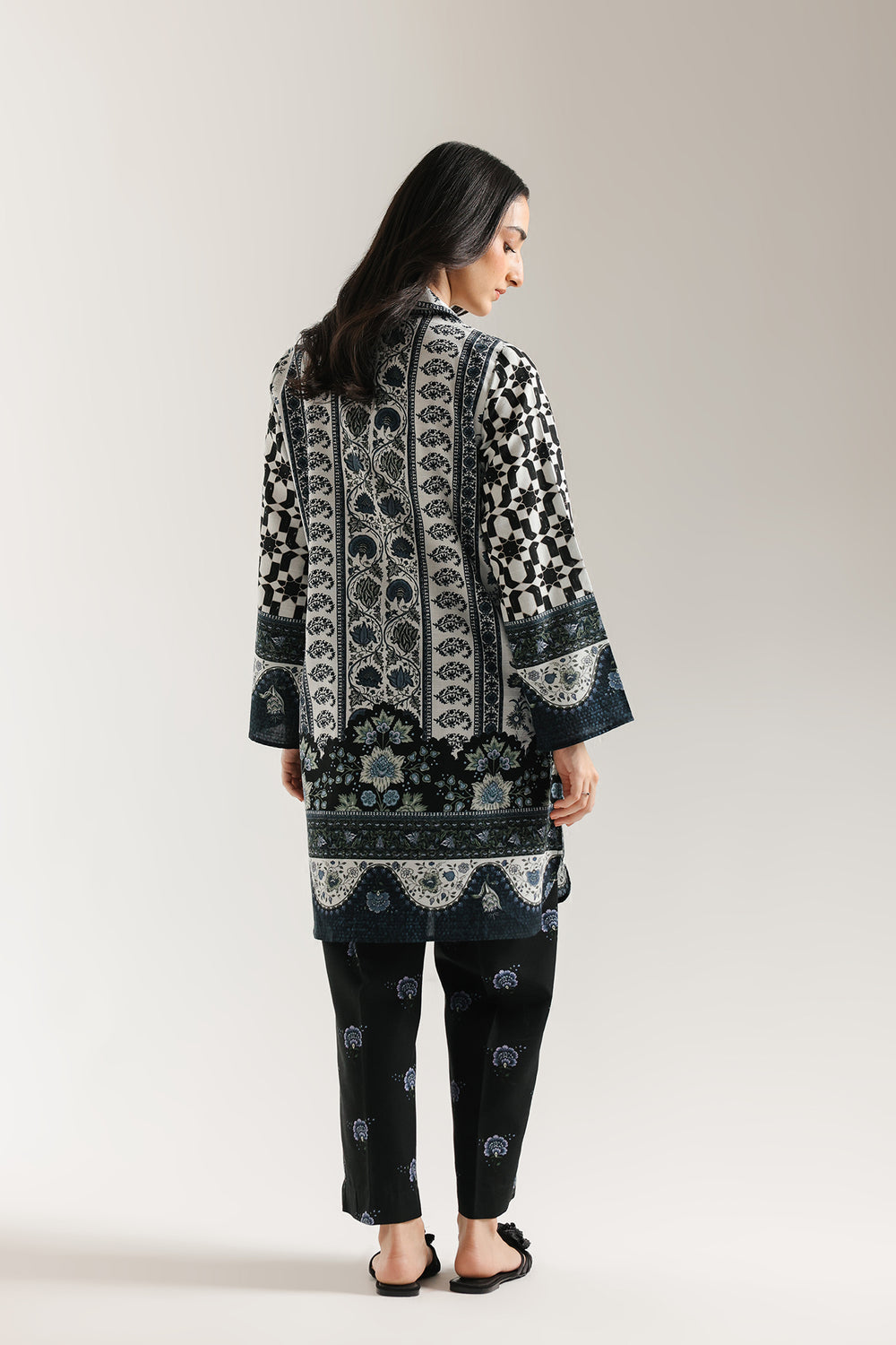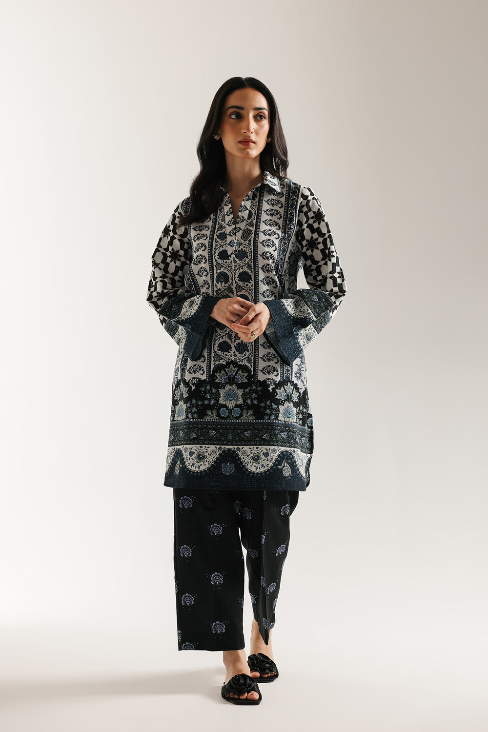 Unveil a sophisticated blend of patterns with this captivating printed suit. The straight-cut kurta is a study in monochrome and deep blue, featuring a complex print that combines traditional ornamental and floral motifs with modern geometric elements, particularly on the collar and cuffs. The rich design covers the entirety of the top, which has a classic shirt collar and V slit. The ensemble is elegantly completed with black trouser that feature a subtle, coordinating floral print near the hem, creating a dark, refined, and artistic look.