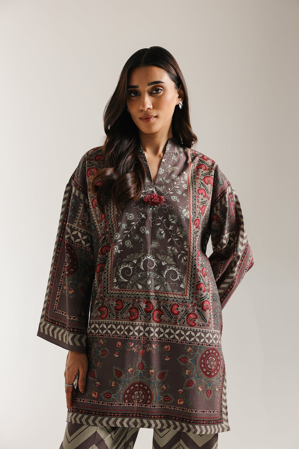 Embrace unique, fusion style with this richly patterned taupe and grey printed suit. The short, straight-cut kurta features a beautiful traditional motif print in earthy shades of taupe, deep red, and muted green. The design includes a subtle V-slit neckline and a band collar. The top is dramatically contrasted by the tailored trousers, which showcase a bold, contemporary chevron or zig-zag stripe pattern in alternating shades of taupe and dusty green. This striking mix of ethnic and modern geometric prints makes for a sophisticated and eye-catching ensemble.