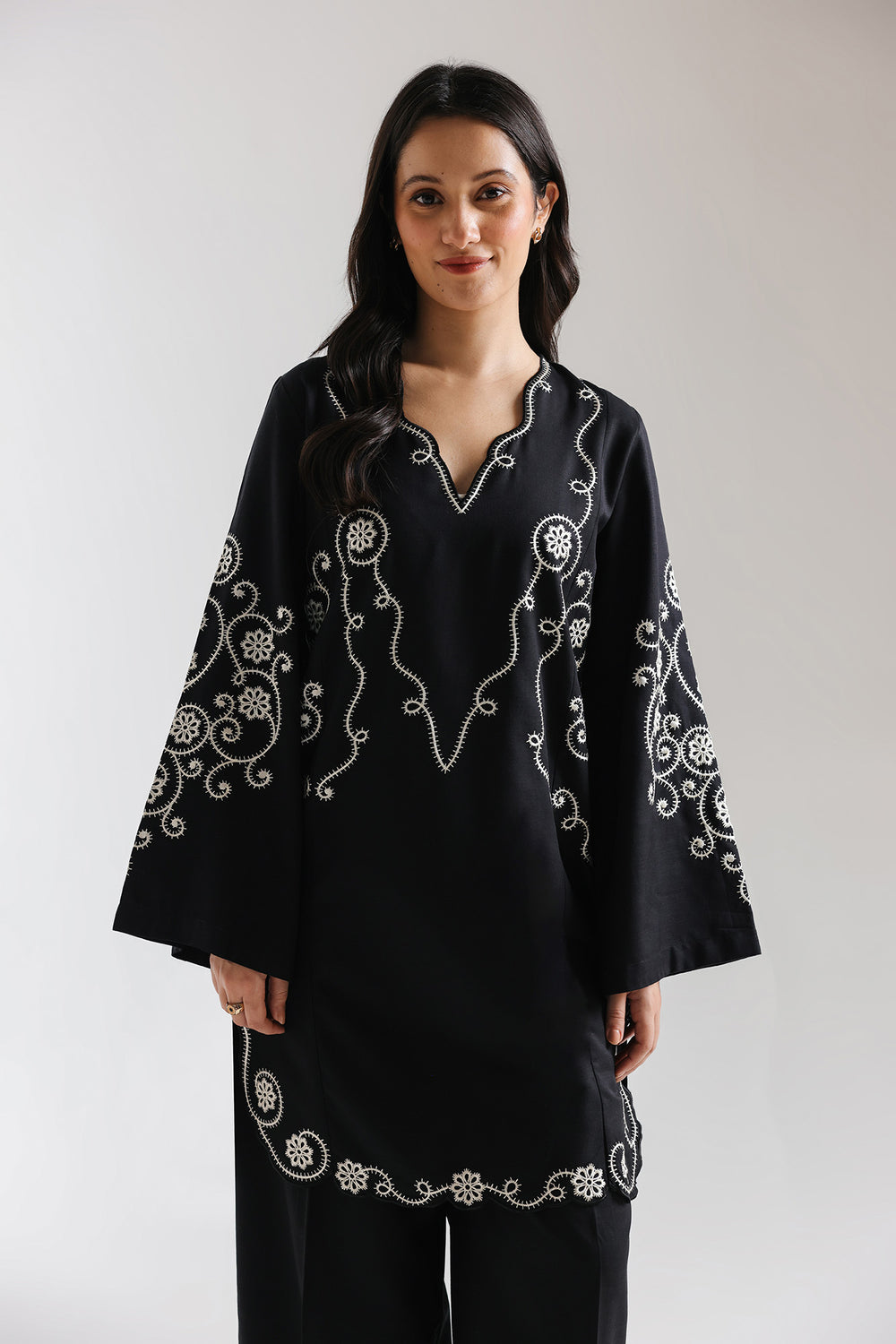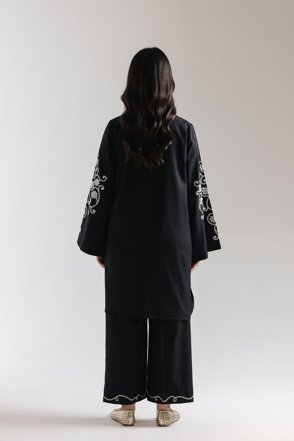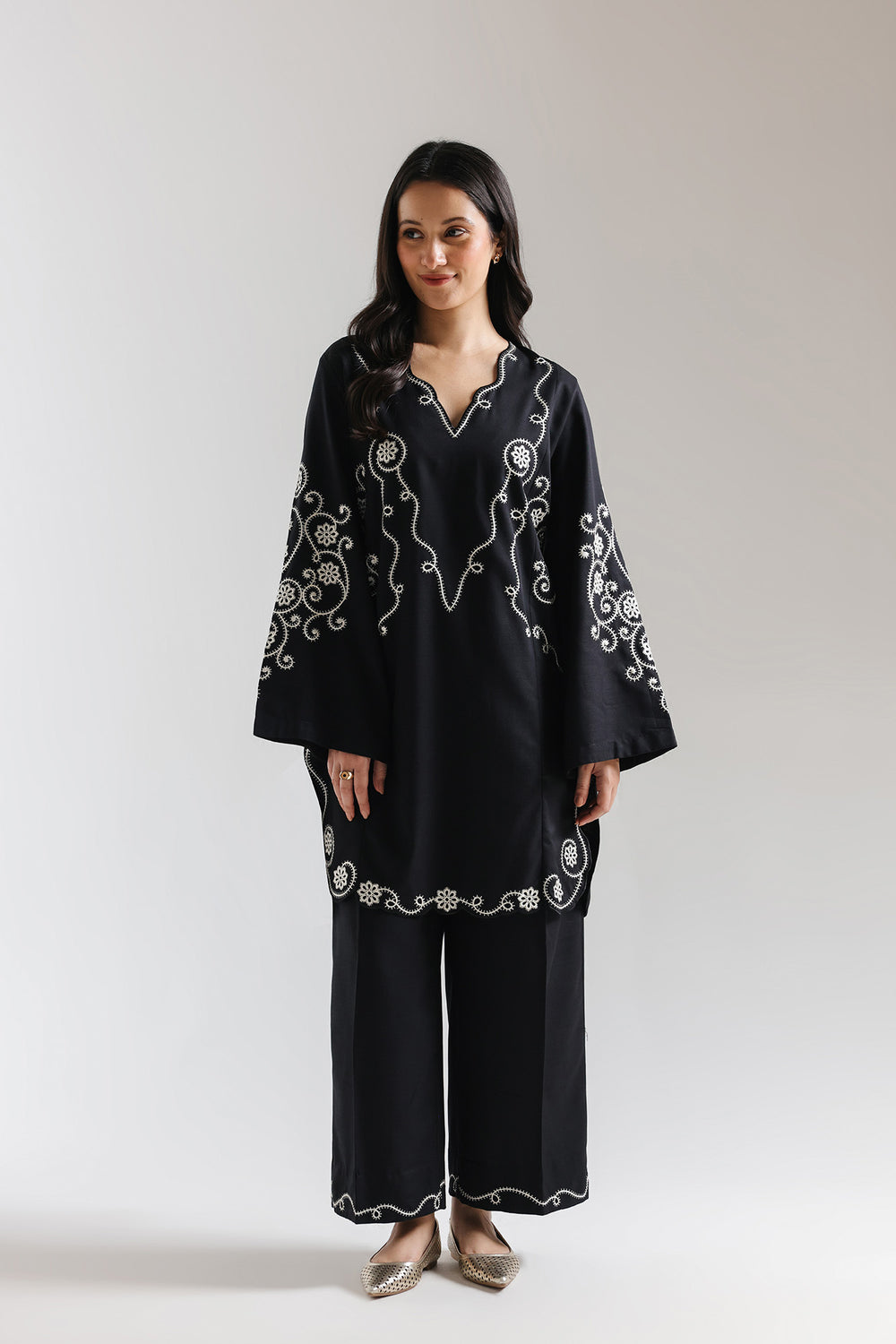 An expertly crafted embroidered suit embodies elegance. This black V-neck shirt features an intricate white embroidery. Paired with contemporary culotte trousers, this outfit offers the perfect blend of timeless artistry and today's fashion. Ideal for special events, formal gatherings, or any occasion where you want to look polished and confident.