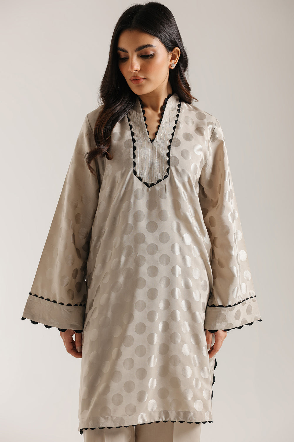 Elevate your style with the intricate design of this chic embroidered suit. This sleek ensemble features a medium-length kurti and matching trousers, both crafted in a sophisticated Avue fabric. The shirt is beautifully adorned with fine embroidery, creating an illusion of texture and shine. The kurti features a smart V-neckline with a band collar. The coordinating shalwar features subtle matching embroidery along the hem, completing a gracefully detailed and contemporary monotone look.