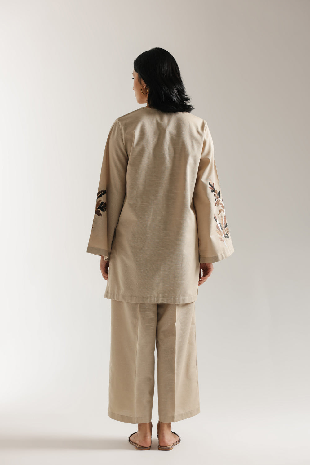 Envelop yourself in understated sophistication with this beautifully balanced embroidered suit. This striking ensemble features a short kurti and wide-leg trouser crafted from a smooth, luxurious solid beige fabric. The shirt is elegantly detailed with tonal self-embroidery in an intricate floral and geometric pattern that descends from the slit-neckline, creating a traditional, ornate yoke and a patterned border along the hem. The wide sleeves feature a complementary embroidered motif near the cuff. The coordinating trousers feature the same self-embroidery along the wide hem, tying the monochrome look together with texture and refined artistry. This suit is a timeless and elegant choice for any polished daytime event.