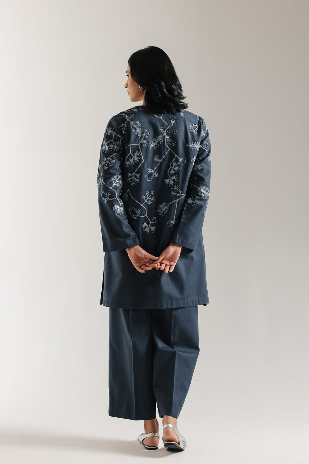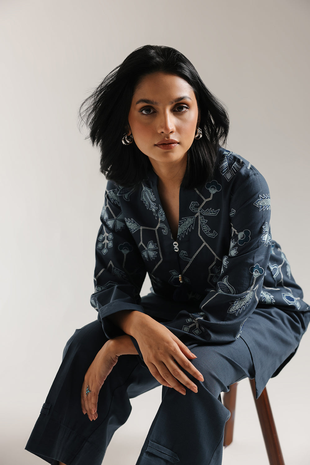 Discover timeless sophistication with this embroidered suit that seamlessly marries traditional craftsmanship with contemporary design. The beautiful peacock blue shirt features meticulously detailed floral embroidery in deep and light blue and white, creating an elegant visual narrative across the front panel. A refined round neckline with a delicate slit provides modern flair while maintaining classic proportions. Paired with generously cut wide-leg trousers, this ensemble delivers both comfort and refined style. Perfect for celebrations, formal gatherings, or elevated everyday wear.