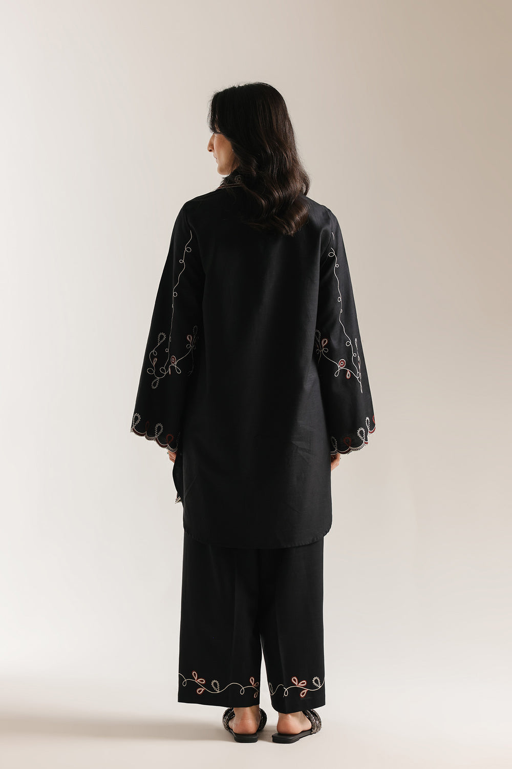 This elegant embroidered suit brings together traditional craftsmanship and modern style. Featuring beautiful white and maroon red embroidery with abstract designs on a deep black base, the outfit showcases intricate embroidery in every detail. The shirt stands out with its delicate scalloped sleeves opening, while the carefully stitched patterns honor authentic heritage techniques. Paired with a contemporary culotte trouser, this outfit offers the perfect blend of timeless artistry and today's fashion. Ideal for special events, formal gatherings, or any occasion where you want to look polished and confident.