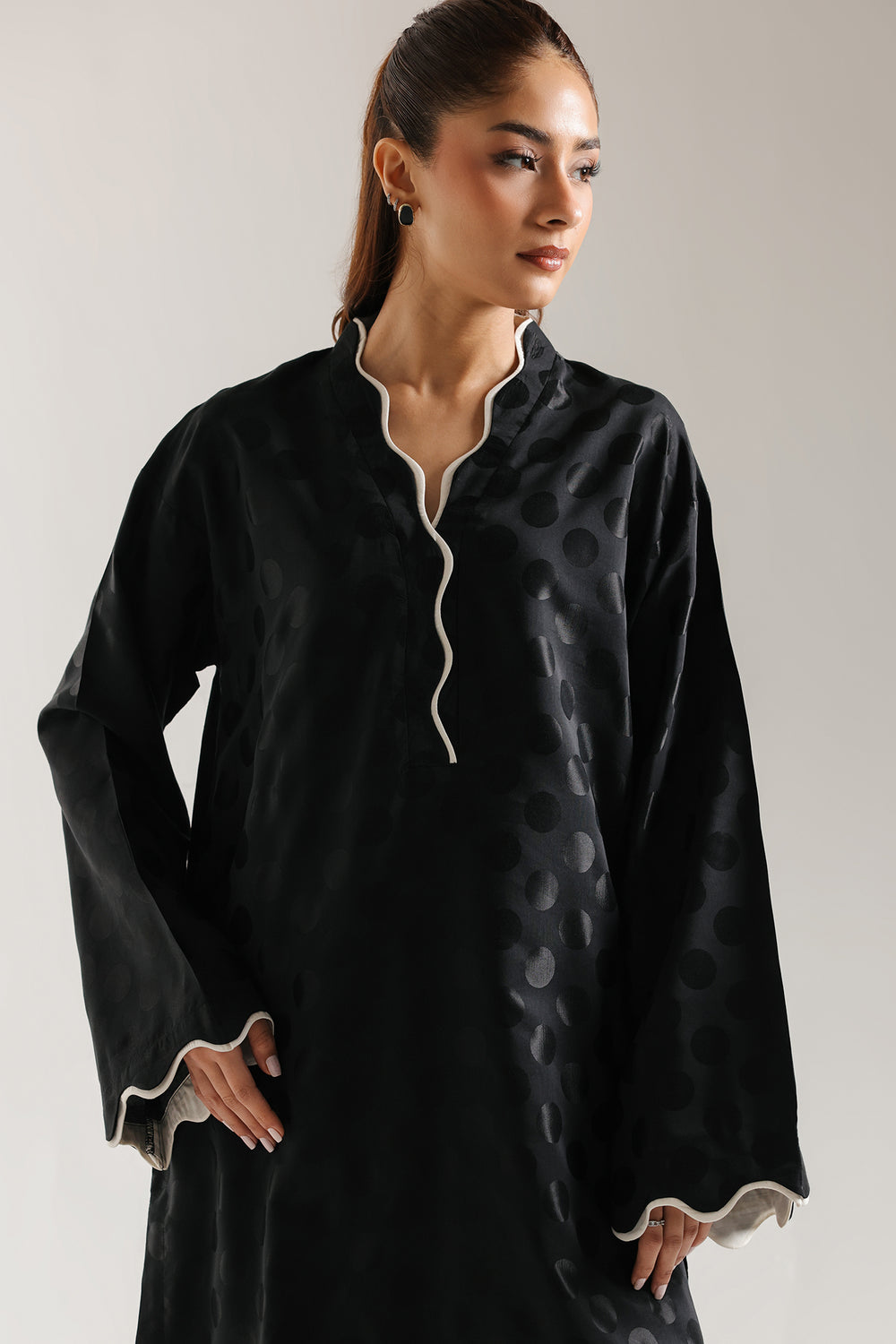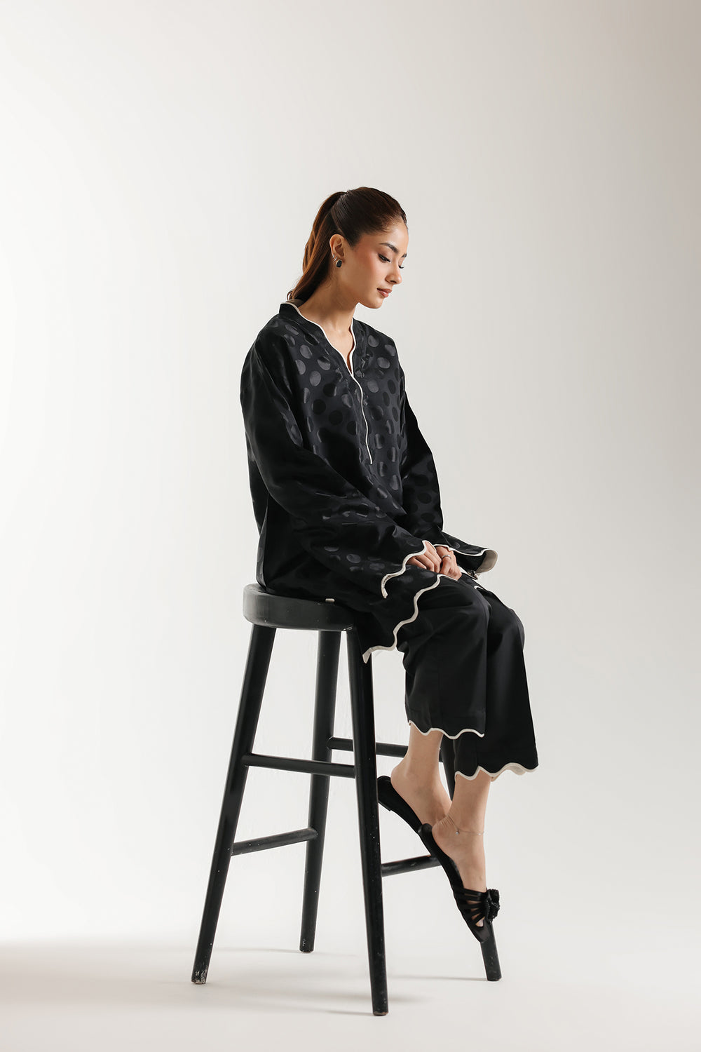 Elevate your wardrobe with this sophisticated embroidered suit featuring a striking polka dot pattern in black on black with a subtle shimmer. The design showcases full bell sleeves that add graceful movement and a flattering V-neckline for refined elegance. Paired with tailored straight trousers, this ensemble delivers a polished, contemporary look perfect for both formal occasions and upscale casual settings. The intricate embroidery and lustrous finish create visual depth and dimension, making this piece a standout addition to your collection.