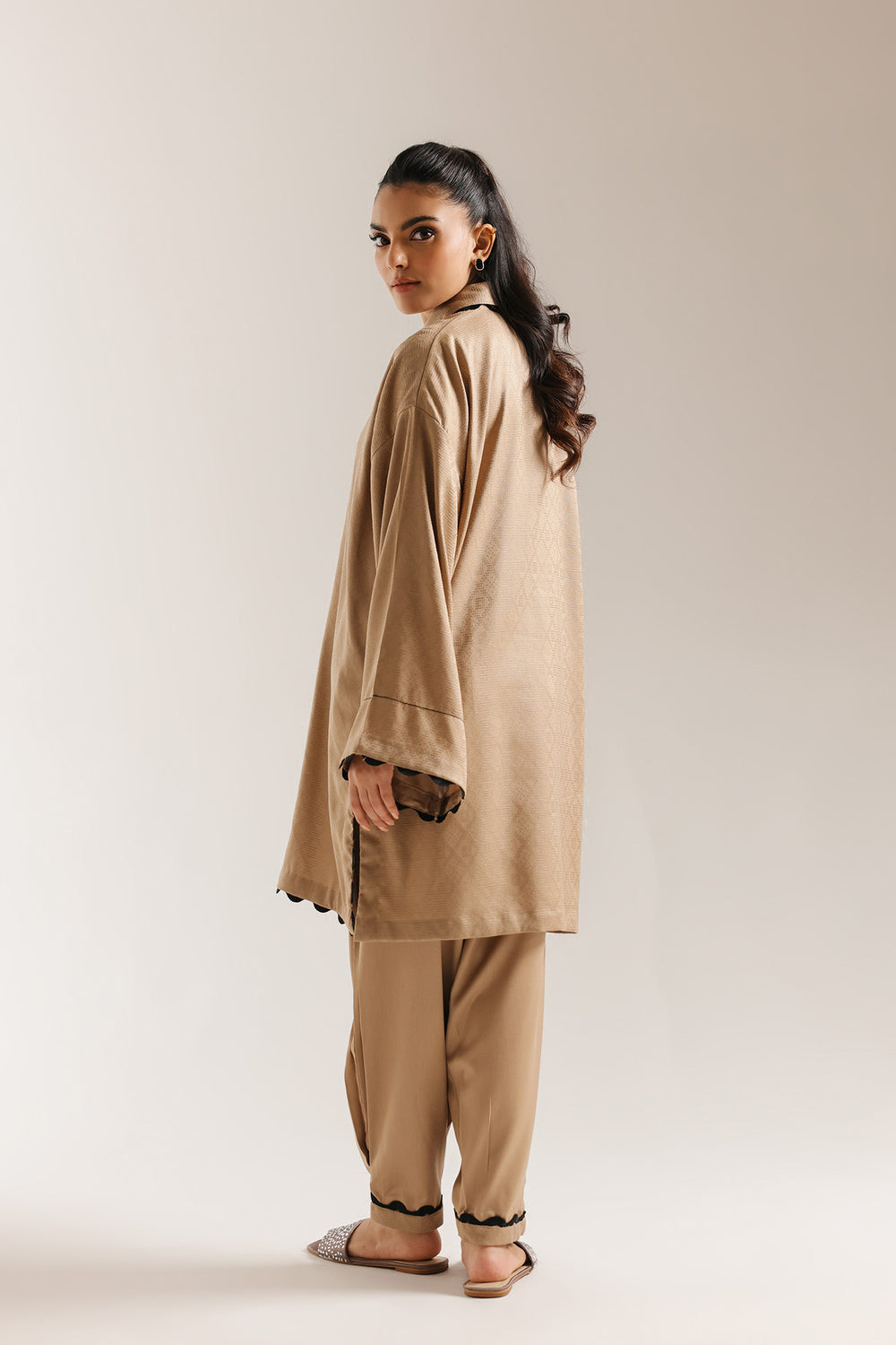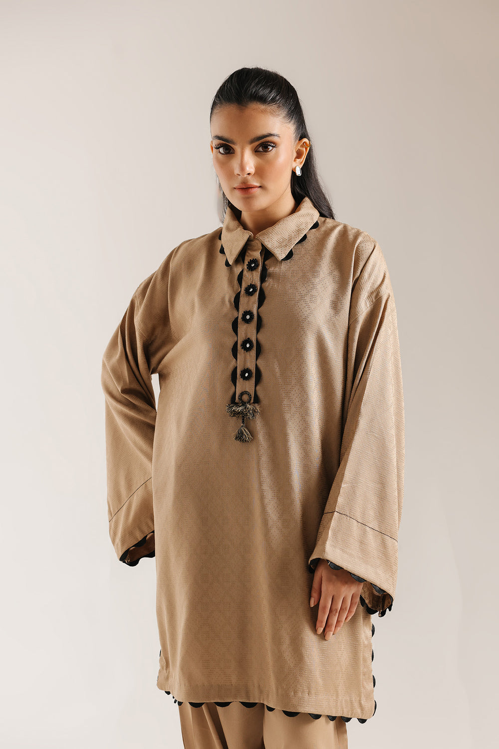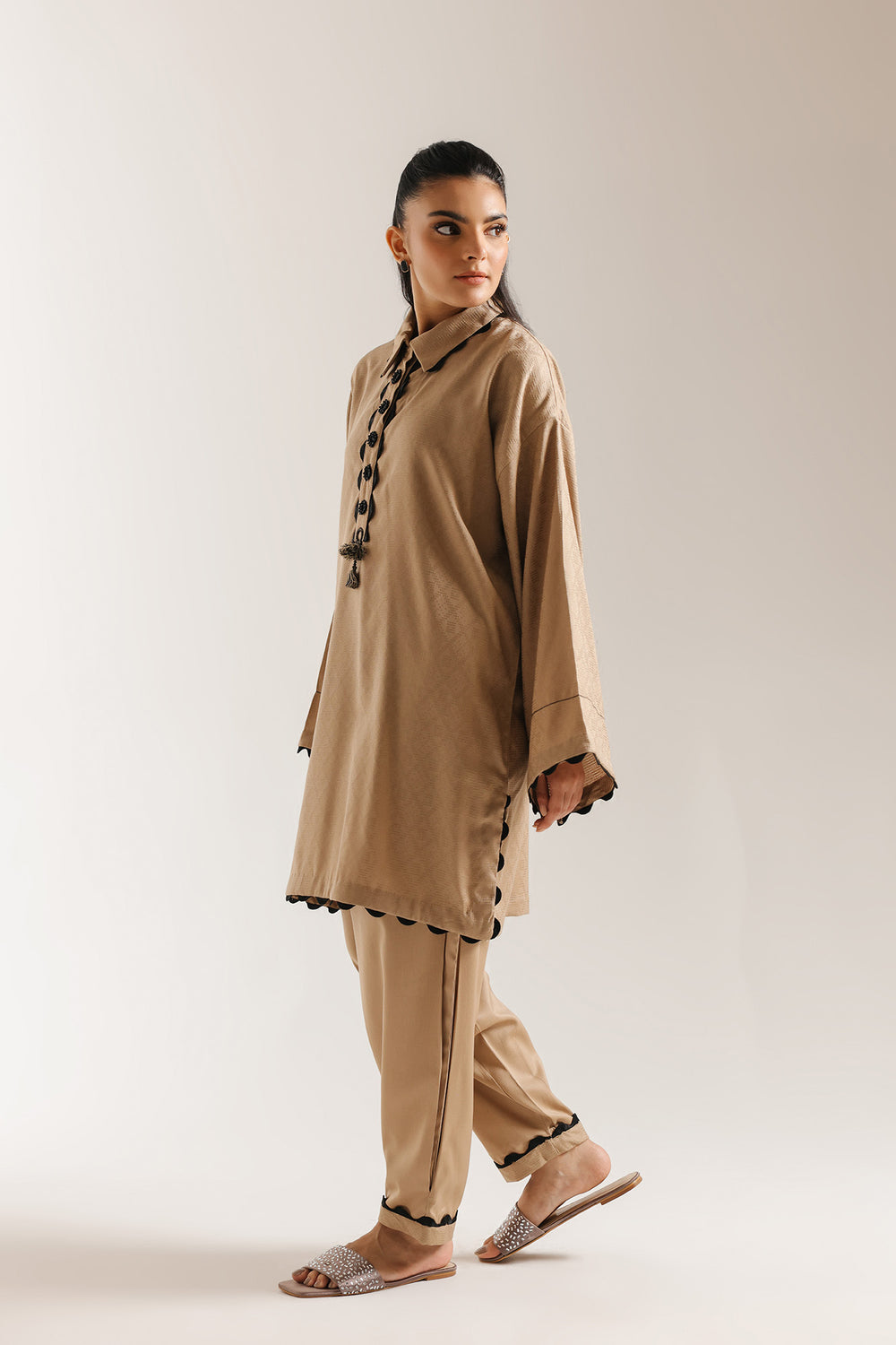 Elevate your wardrobe with this sophisticated embroidered two-piece set, featuring a loose-fit kurta crafted from subtly textured fabric, anchored by a collared neckline and striking black circular embroidery on the placket with delicate tasseled ties. Full-length sleeves showcase matching black embroidered edging, creating a refined contrast that extends to the straight-cut trousers' hem for seamless coordination. This contemporary ensemble strikes the perfect balance between traditional craftsmanship and modern minimalism, ideal for those who appreciate quality tailoring and timeless design.
