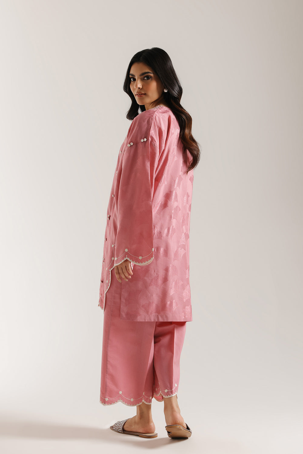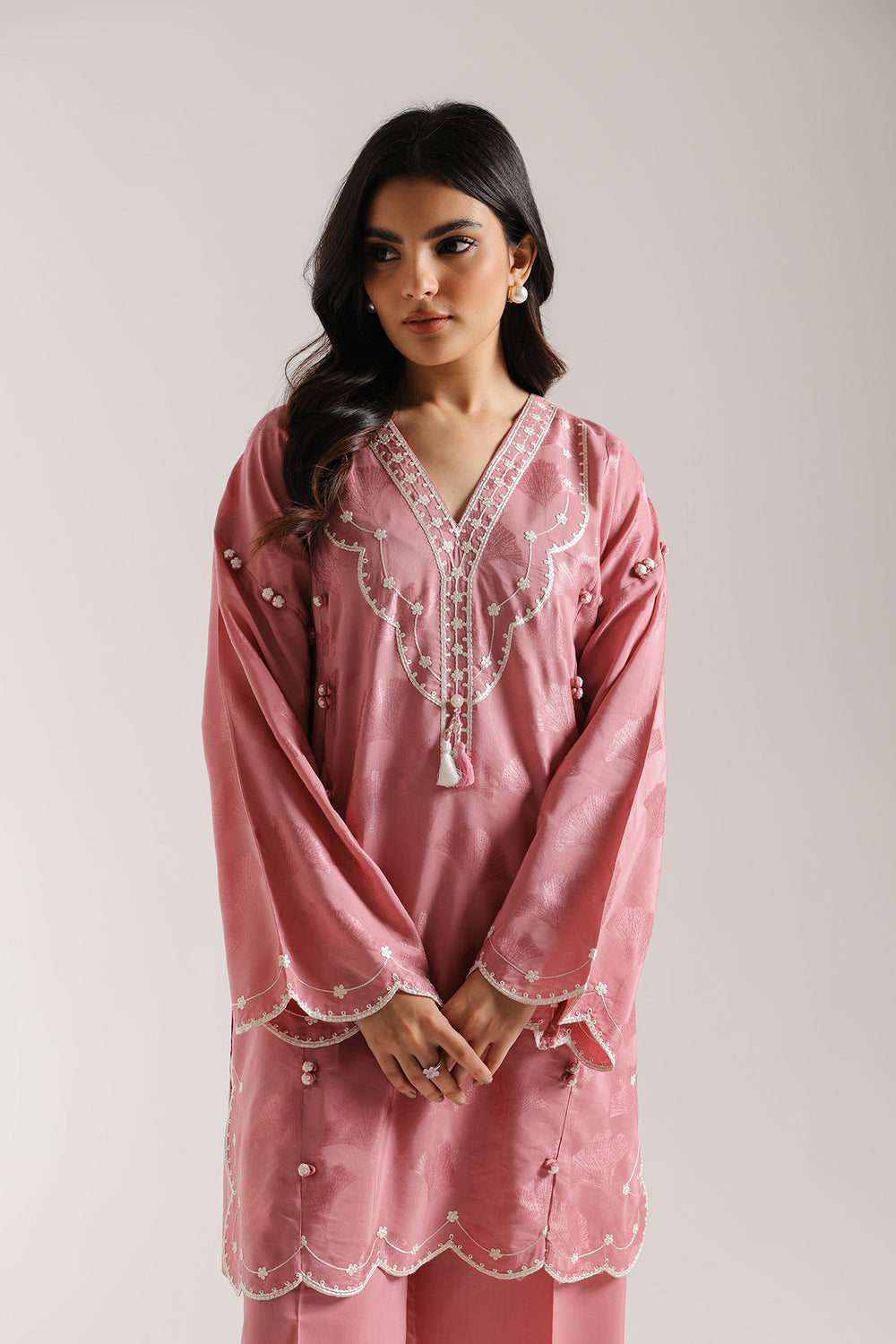 Elevate your wardrobe with this striking embroidered suit featuring a vibrant pink V-neck shirt adorned with intricate embroidery work. The delicate scalloped hem sleeves add refined detail, while the coordinating wide-leg culotte trousers provide a contemporary silhouette and comfort. Perfect for festive occasions or elevated everyday wear, this two-piece ensemble combines tradition with modern styling. The breathable fabric ensures all-day wearability, making it an essential addition to your ethnic collection.