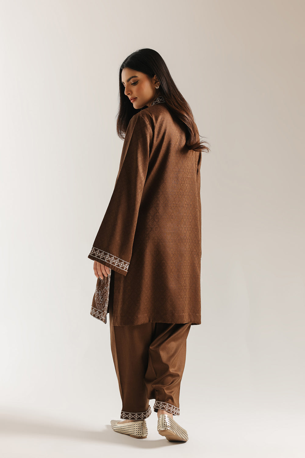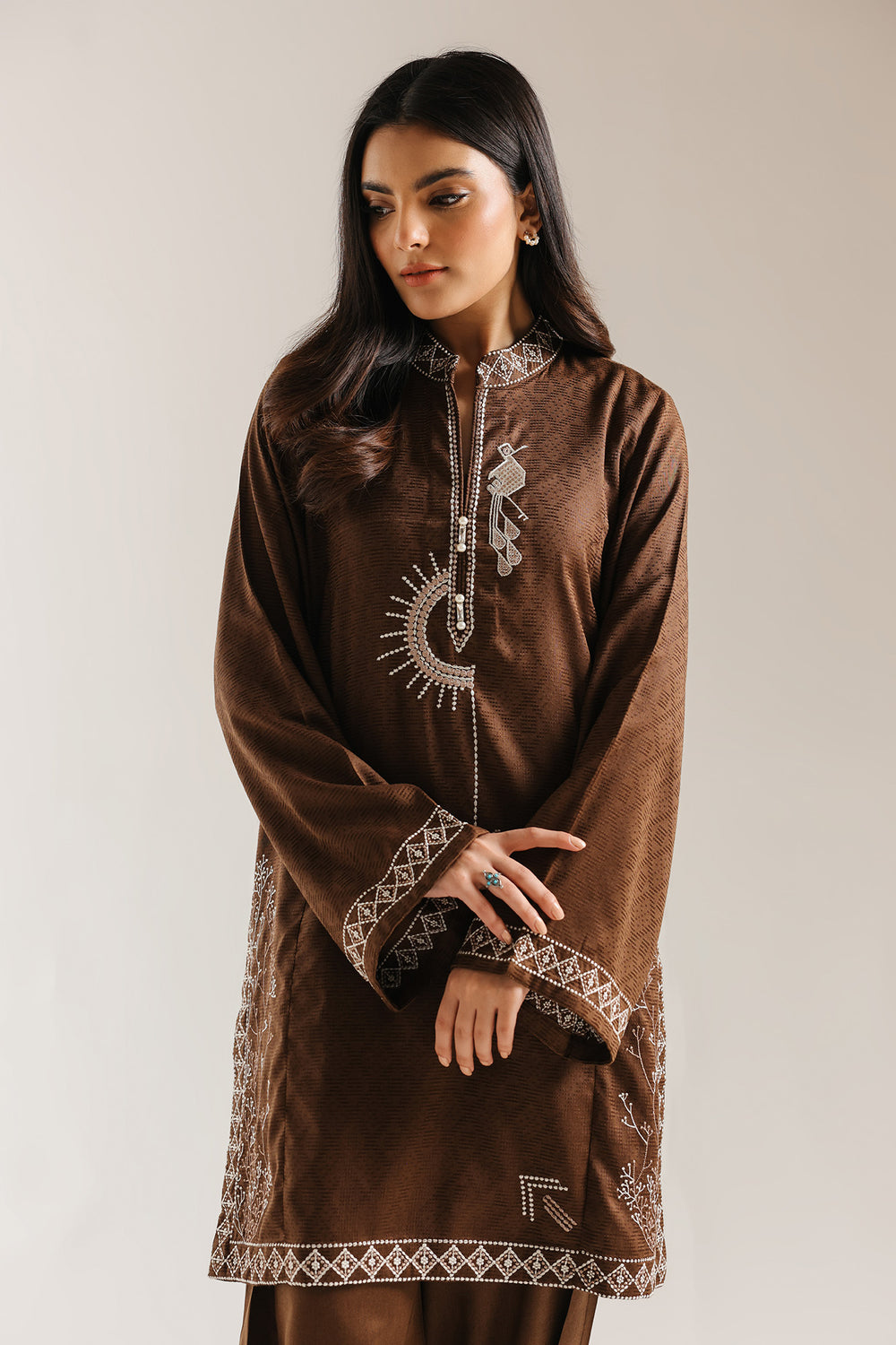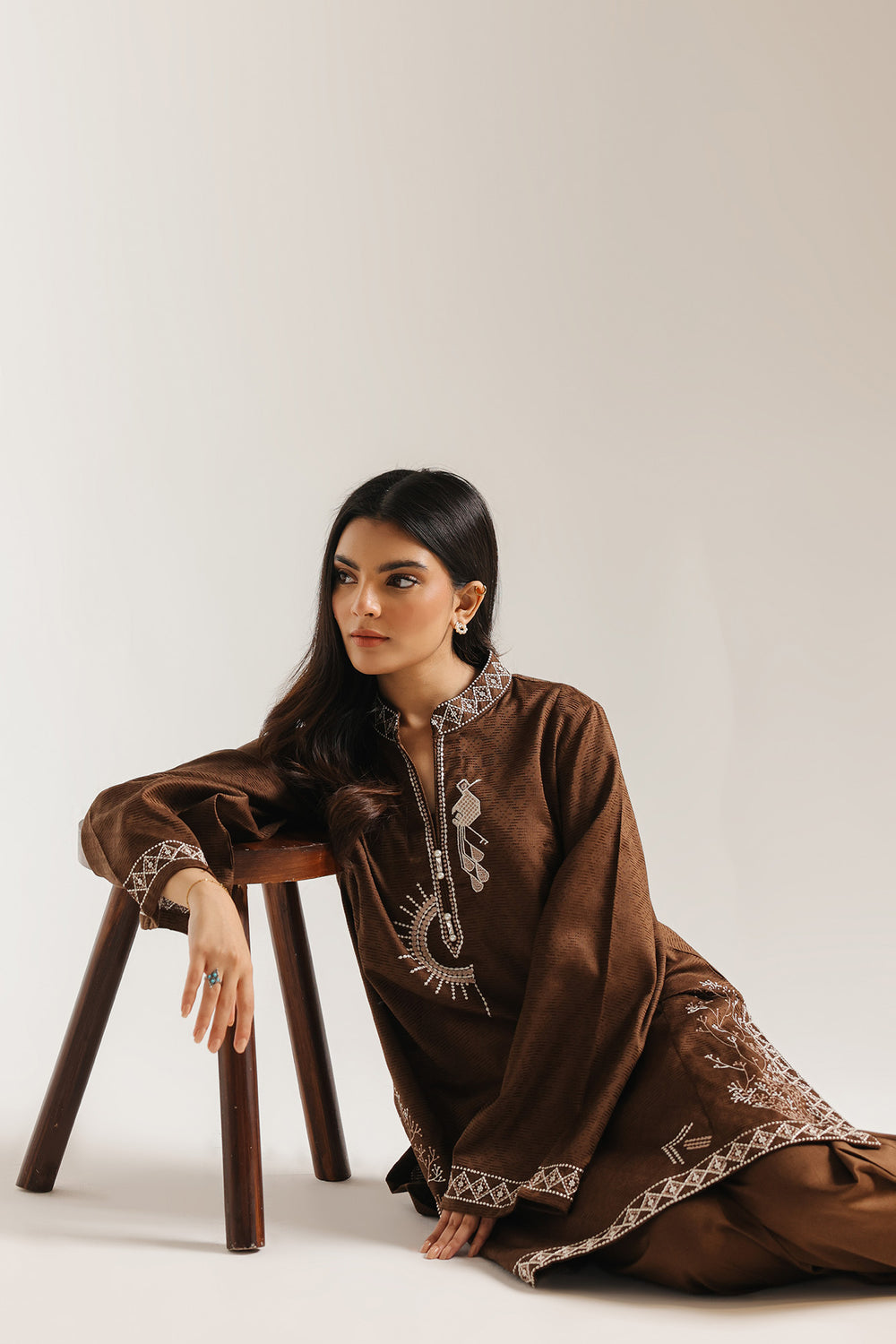 Embrace refined elegance with this striking golden brown embroidered suit, where contemporary design meets traditional craftsmanship. The straight-cut kurta features a luxurious brown fabric adorned with pristine white and brown thread embroidery, showcasing intricate geometric and stylized birds motifs along the ban neckline, front hem, and flared sleeves. Paired with slouchy pleated trousers in matching brown color, this ensemble delivers a sophisticated, coordinated aesthetic that commands attention. Perfect for those seeking a powerful yet graceful statement piece that balances modern silhouettes with timeless embroidered detailing.
