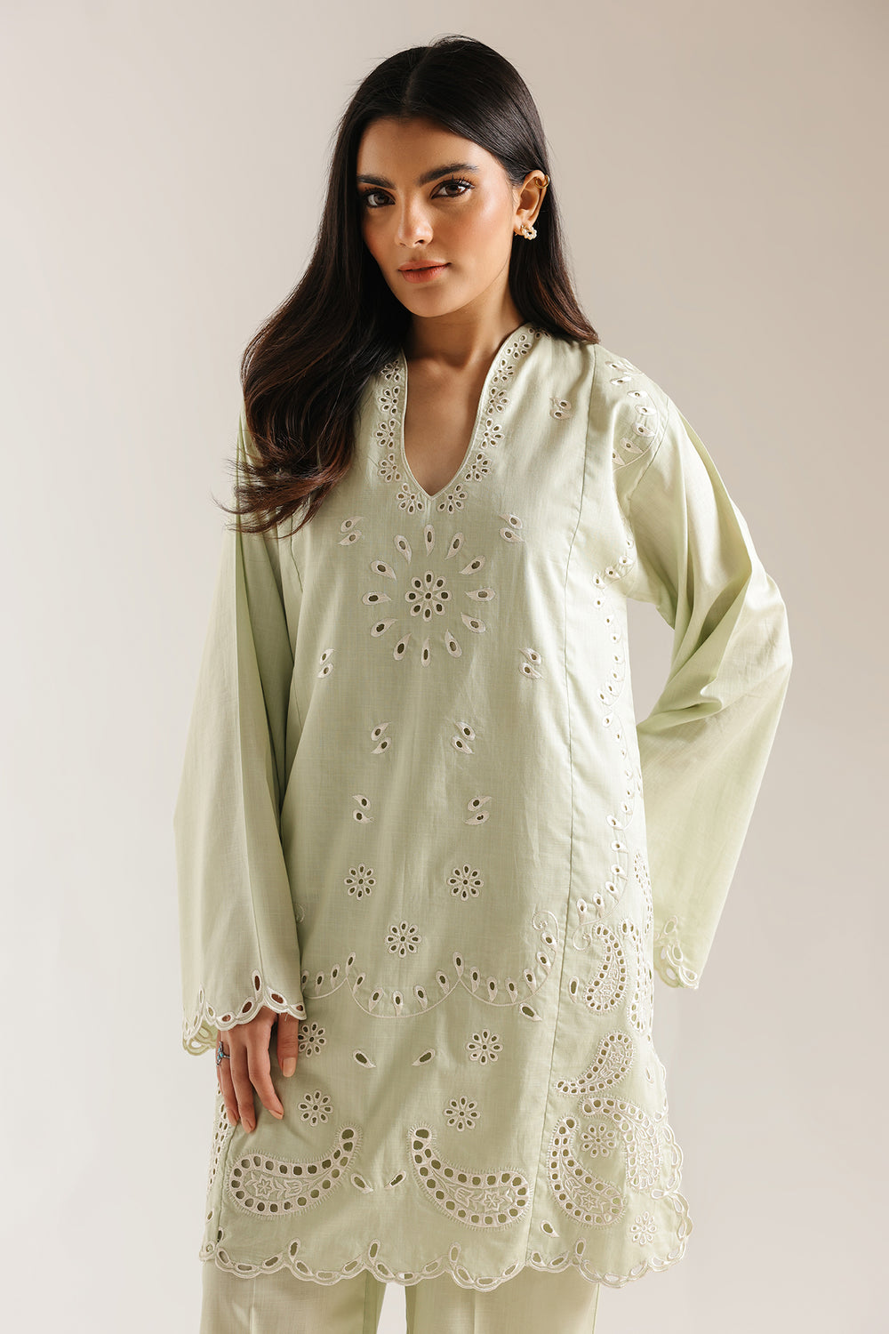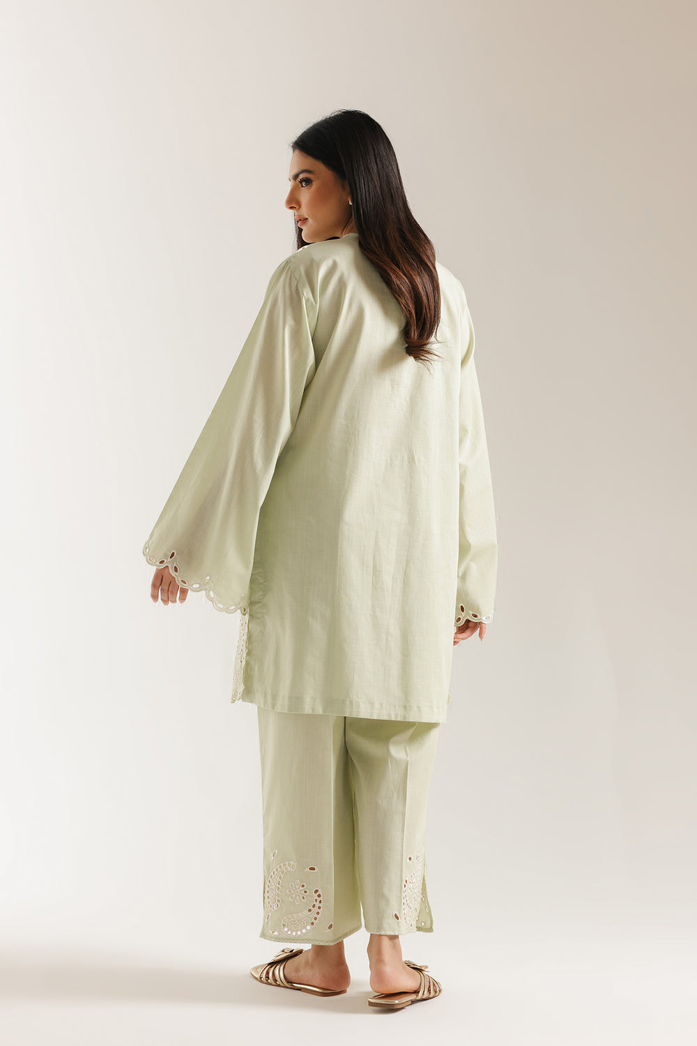 Experience the breath of fresh, seasonal elegance with this ethereal two-piece ensemble, rendered in a soft pistachio green that radiates a serene and sophisticated charm. The long shirt is a masterclass in tonal artistry, featuring a refined U-neckline that leads into a bodice adorned with delicate white floral sprigs and traditional sunburst motifs. The true highlight of this design is the intricate schiffli-style cutwork that creates a beautiful play of light and shadow across the fabric. A dramatic scalloped hemline and wide statement sleeves are both finished with elaborate lace-style embroidery and heritage paisley cutouts, lending the silhouette a luxurious, weighted finish. The ensemble is beautifully balanced by matching trouser, which feature coordinating floral cutwork at the ankles for a polished, head-to-toe aesthetic. Effortlessly chic and airy, this suit is the premier choice for garden brunches or festive daytime celebrations.