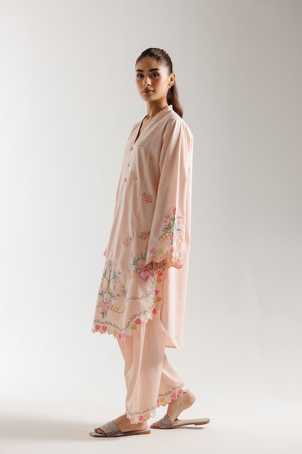 Introduce delicate luminosity to your wardrobe with this graceful pale coral embroidered suit. The loose fit kurta is crafted from a smooth pastel fabric and features a subtle V-neckline, while the wide sleeves and hem are enhanced with fine floral embroidery and elegant scalloped cutwork detailing. Paired with a matching pale coral shalwar, finished with coordinating embroidery near the scalloped hem, this ensemble creates a fresh, feminine, and beautifully cohesive traditional look.