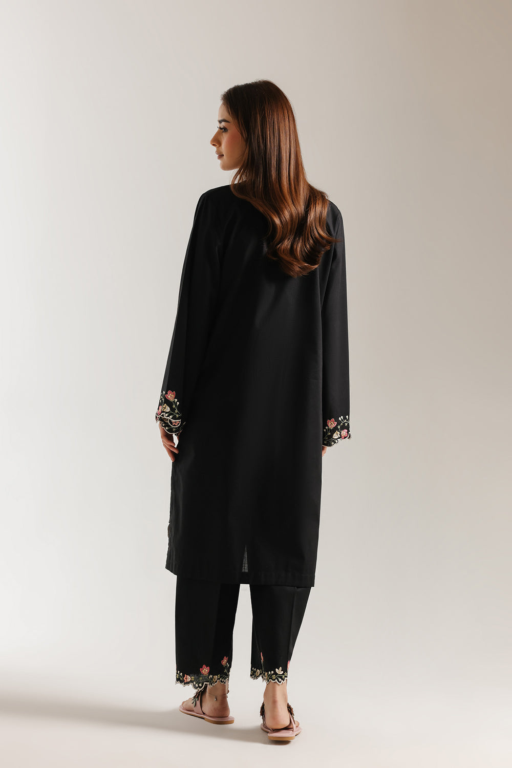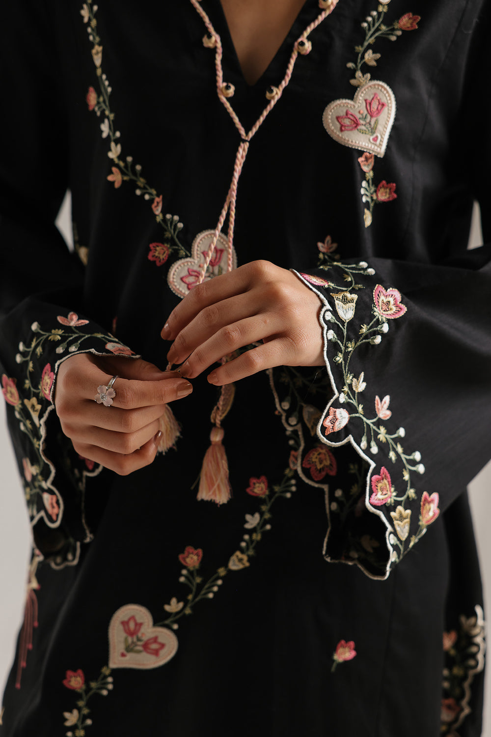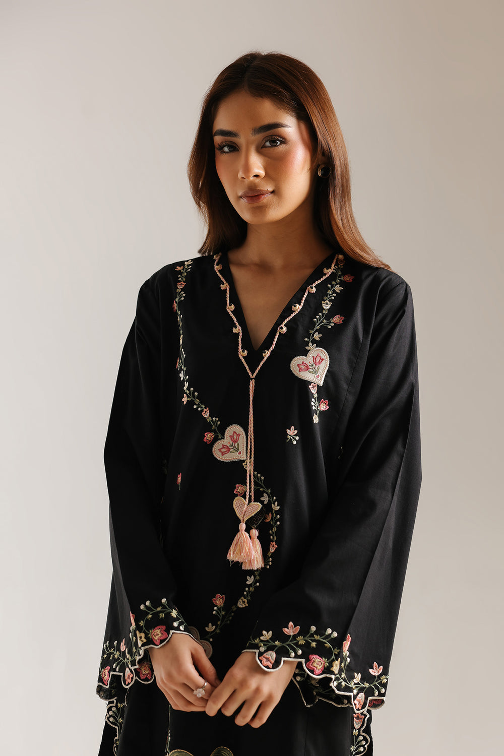 Embrace a whimsical yet sophisticated aesthetic with this black two-piece set, designed to tell a story through its intricate details. The straight-fit shirt features a soft V-neckline adorned with a delicate pink tassel, leading the eye to a charming array of embroidered hearts, winding floral vines, and even a tropical palm motif. These colorful accents are mirrored on the wide sleeves and the scalloped hemline, which is finished with beautiful floral needlework. Paired with matching straight-cut trousers that feature an equally detailed embroidered border, this ensemble is the perfect choice for when you want a look that feels artistic, feminine, and full of personality.