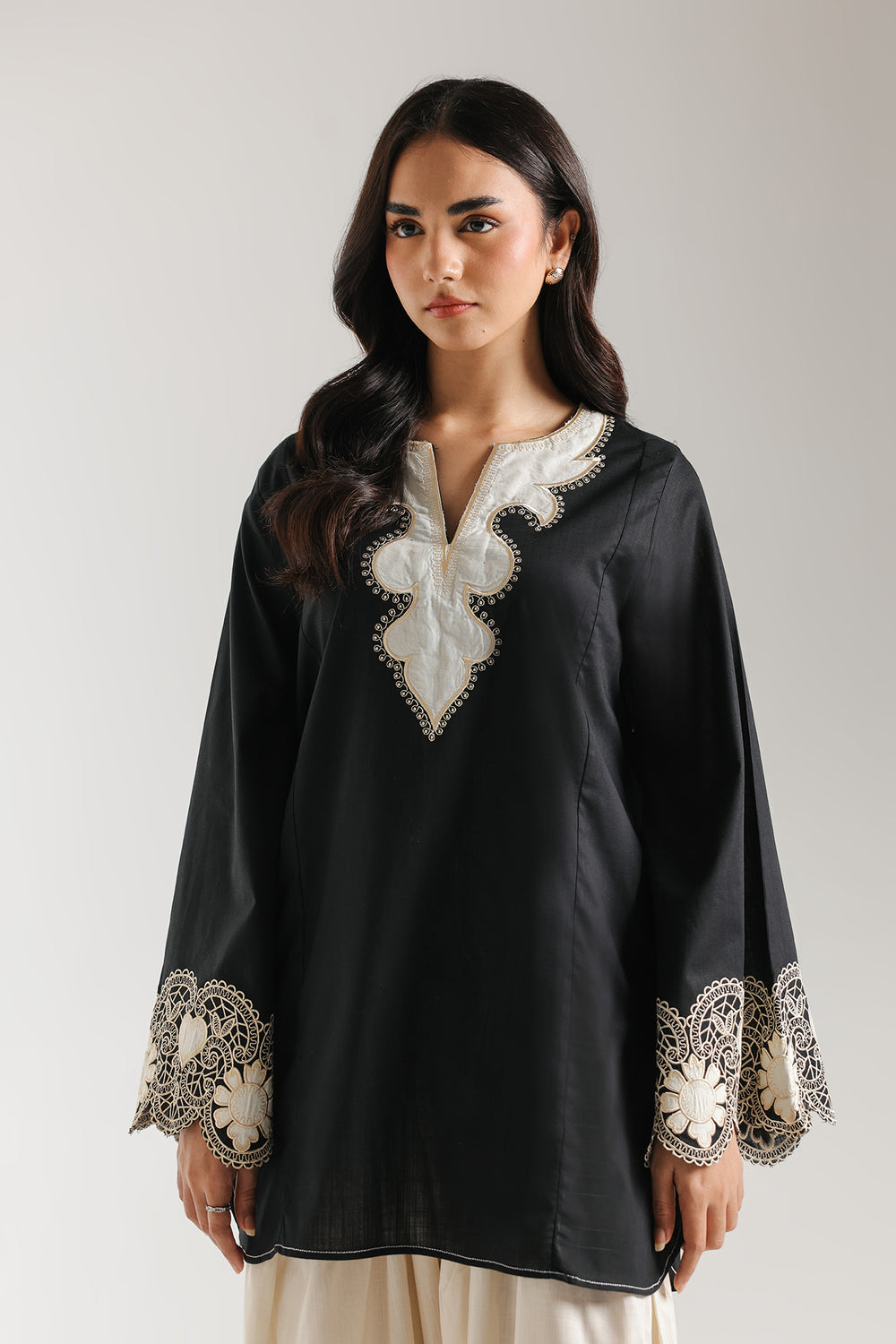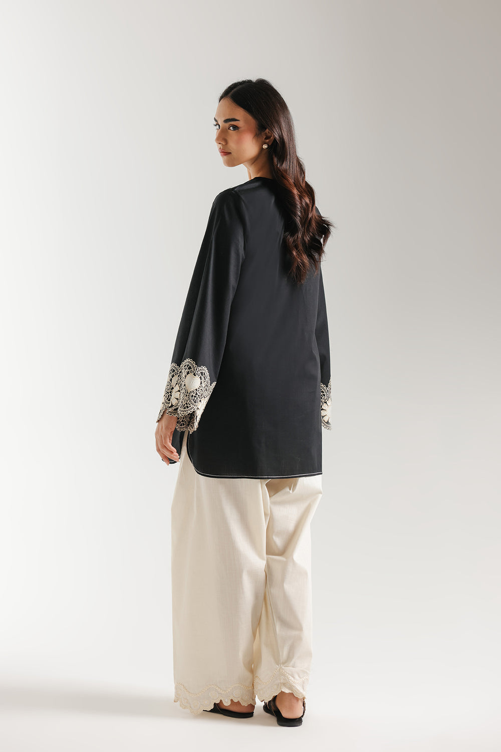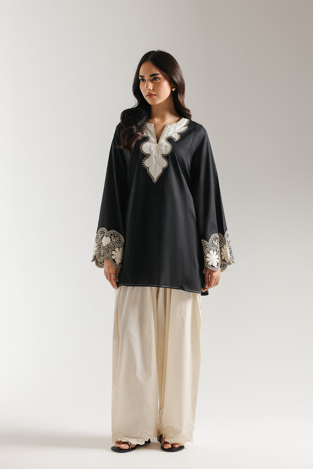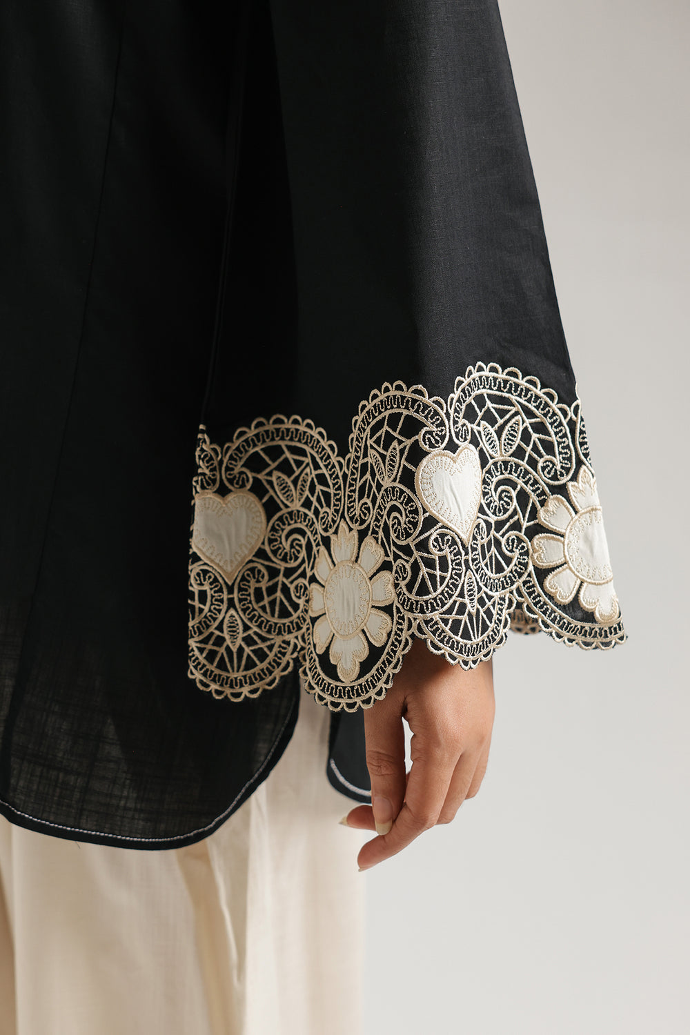 Embrace a classic and striking look with this black two-piece suit, featuring intricate ivory lace-like embroidery. The shirt is designed with a deep V-neckline framed by an ornate, scalloped ivory border that adds a bold and feminine contrast to the dark fabric. This delicate craftsmanship is mirrored on the flared sleeves, which showcase broad, openwork embroidered cuffs with large floral motifs. The ensemble is paired with voluminous ivory shalwar, featuring a matching scalloped lace border at the hem for a cohesive and polished finish.
