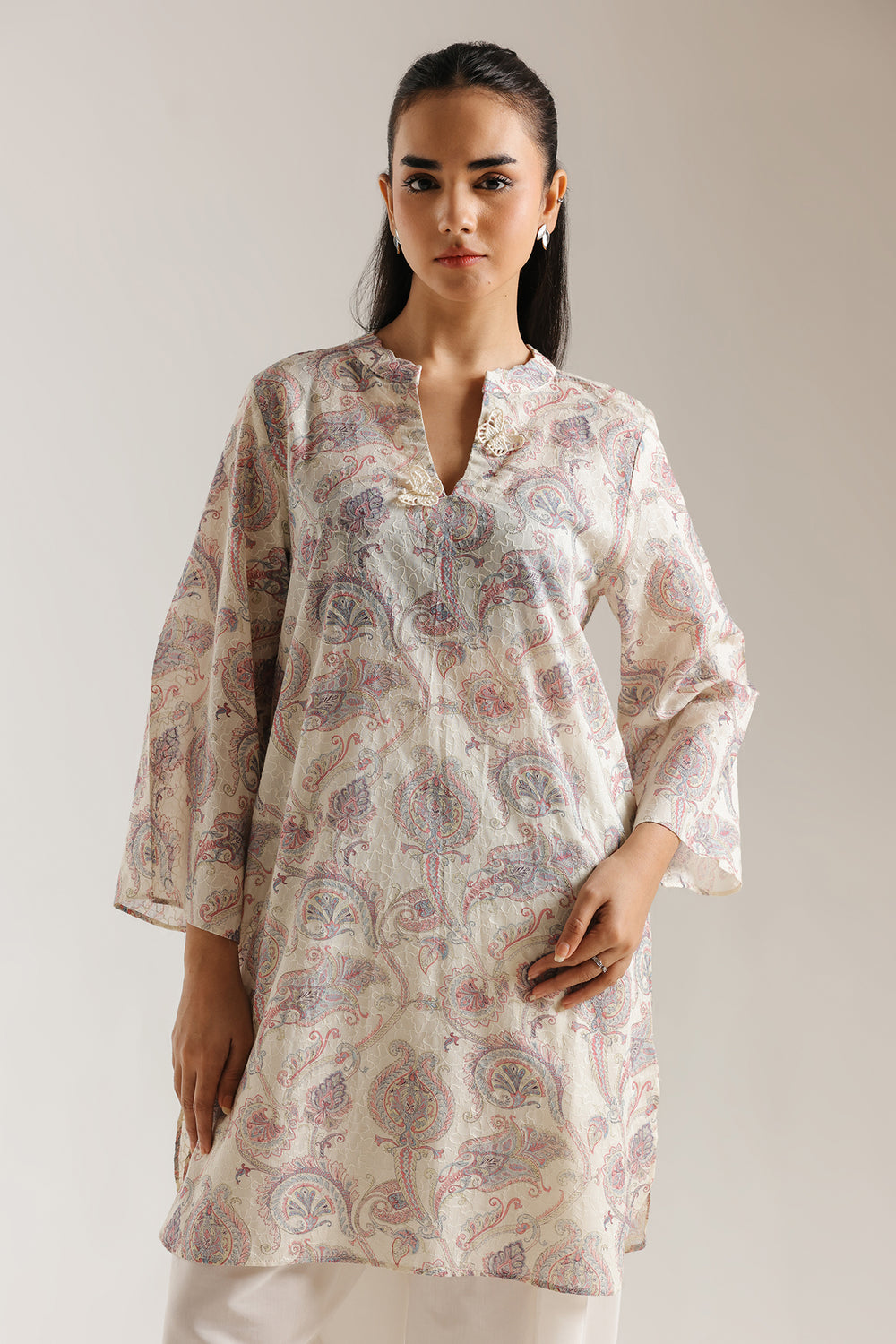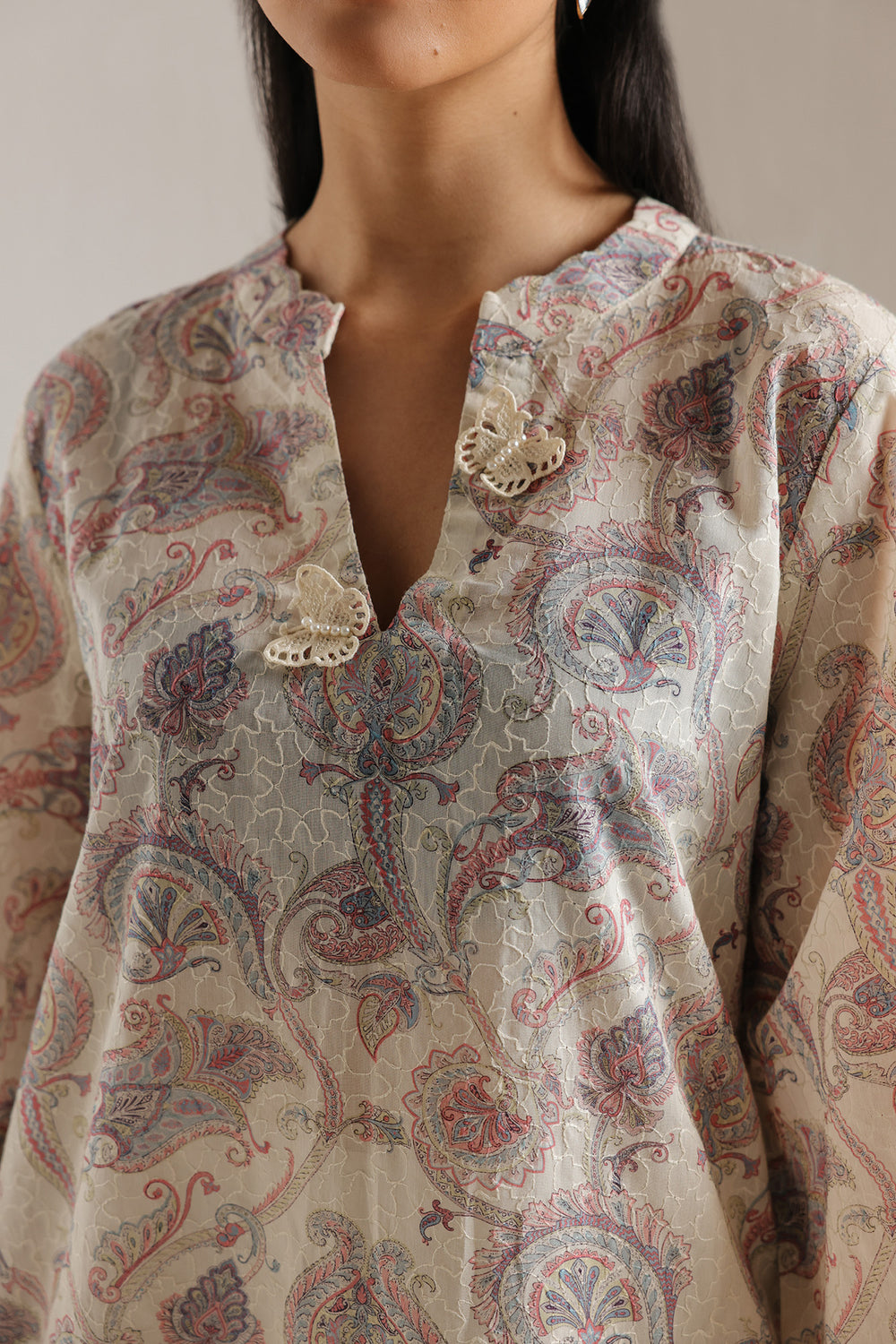 Exude an air of timeless grace with this ethereal two-piece ensemble, rendered in a delicate ivory porcelain hue that serves as a serene canvas for intricate heritage artistry. The shirt is crafted from a subtly embroidered fabric, featuring a sophisticated split V-neckline adorned with dainty floral appliqués at the collar. The look is harmoniously completed with voluminous white wide-leg shalwar, featuring a stunning scalloped lace border at the ankles and delicate pearl-style embellishments for a polished, feminine finish. Refined and deeply artisanal, this suit is the premier choice for those seeking a look of understated, classic luxury.