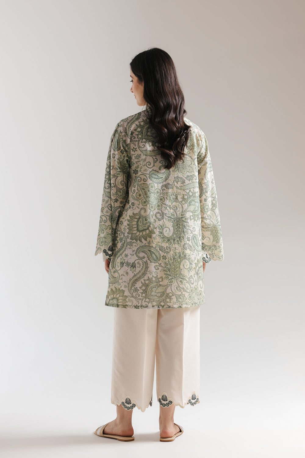 Embrace an effortlessly polished and modern look with this elegant embroidered suit. Crafted from premium lawn schiffle fabric, the ensemble features a kurti paired with contrasting culotte trousers for a refined silhouette. The shirt is adorned with tonal ivory and green thread embroidery, forming stylised floral and geometric motifs along the hem and sleeves. A contemporary V-neckline with a front split and button detailing adds a modern touch, while the off-white culotte trousers are finished with a delicate embroidered border at the hem. Blending comfort with textured artistry, this suit is perfect for elevated everyday wear and sophisticated occasions.