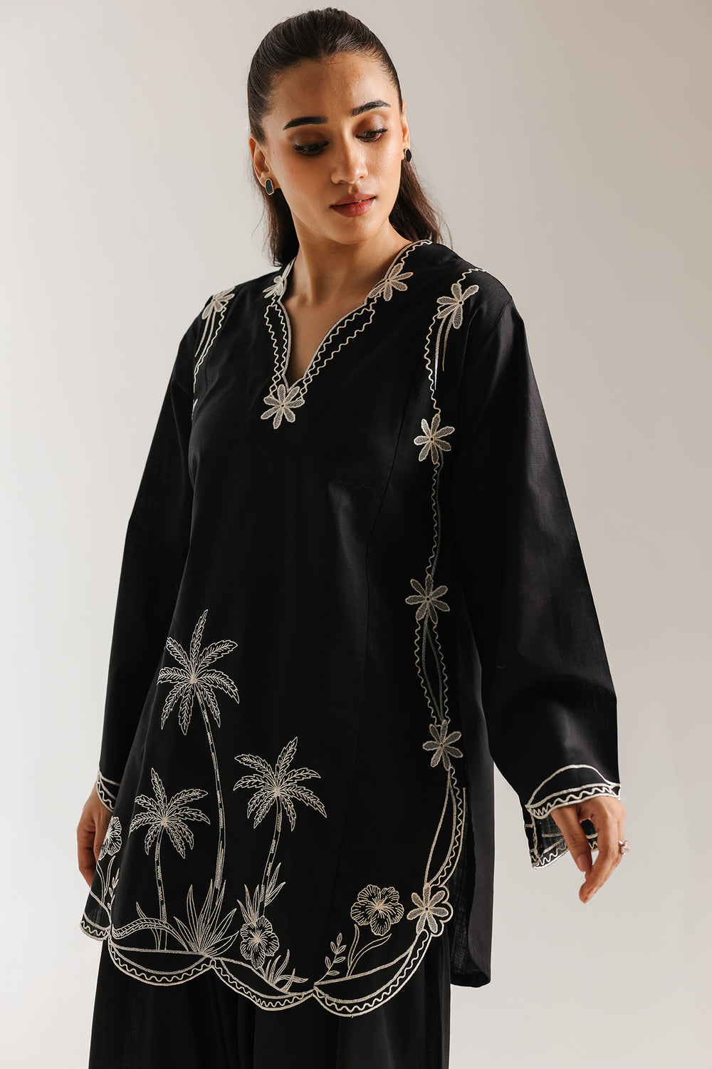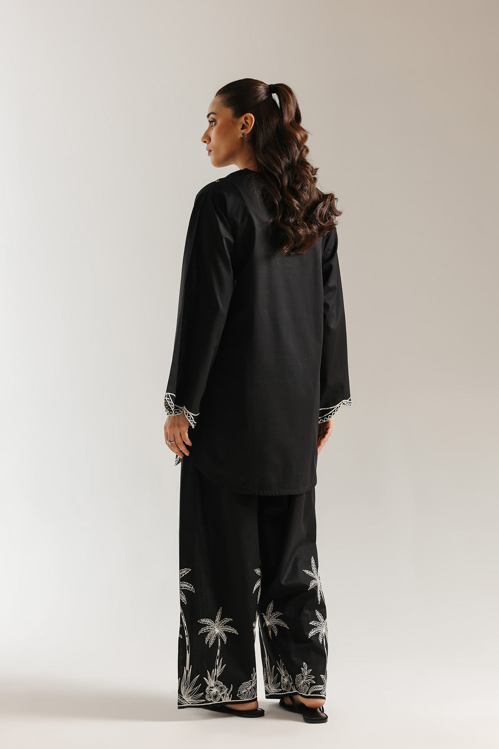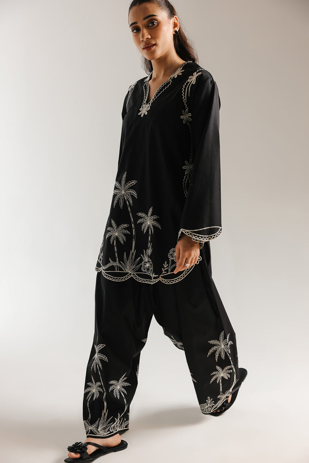This refined embroidered suit beautifully blends time-honoured craftsmanship with contemporary style. Set against a striking black base, the shirt features delicate white botanical embroidery that highlights its intricate detailing. Elegant scalloped edging adds a refined finish, while the carefully executed embroidery reflects true artisanal heritage. Paired with a modern wide-leg shalwar, accented with matching embroidery near the hem, the ensemble creates a balanced and polished silhouette. Perfect for formal occasions, milestone celebrations, or moments that call for a confident and distinguished look.