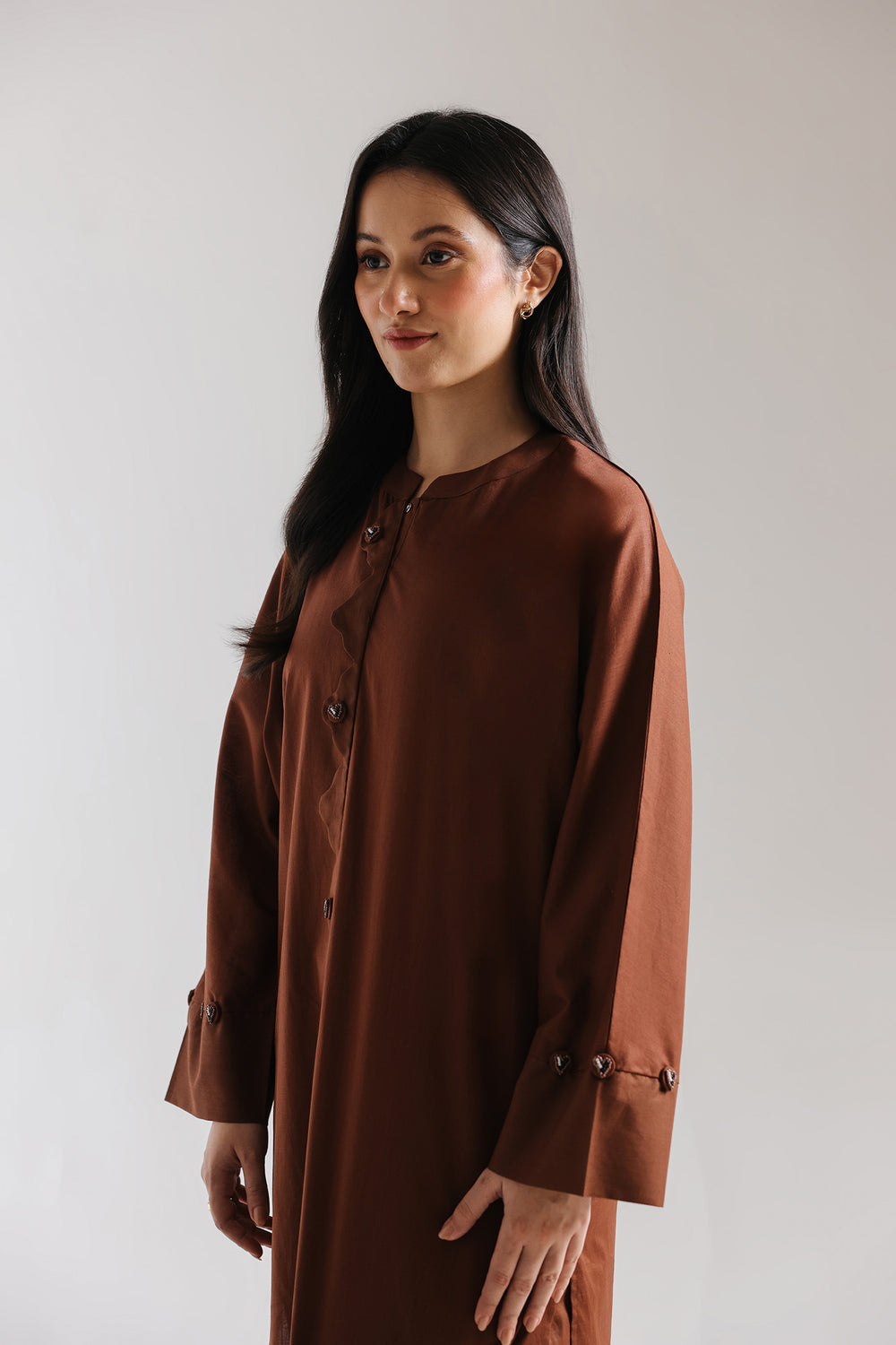 This striking embroidered suit is in a rich, deep rust-brown palette. the ensemble exudes understated sophistication. The boxy shirt features relaxed, dropped shoulders and a refined band collar, complemented by a full-length front placket with coordinating visible buttons that add architectural interest. The coordinating shalwar maintains the same earthy tone, offering comfortable volume with a refined silhouette.
