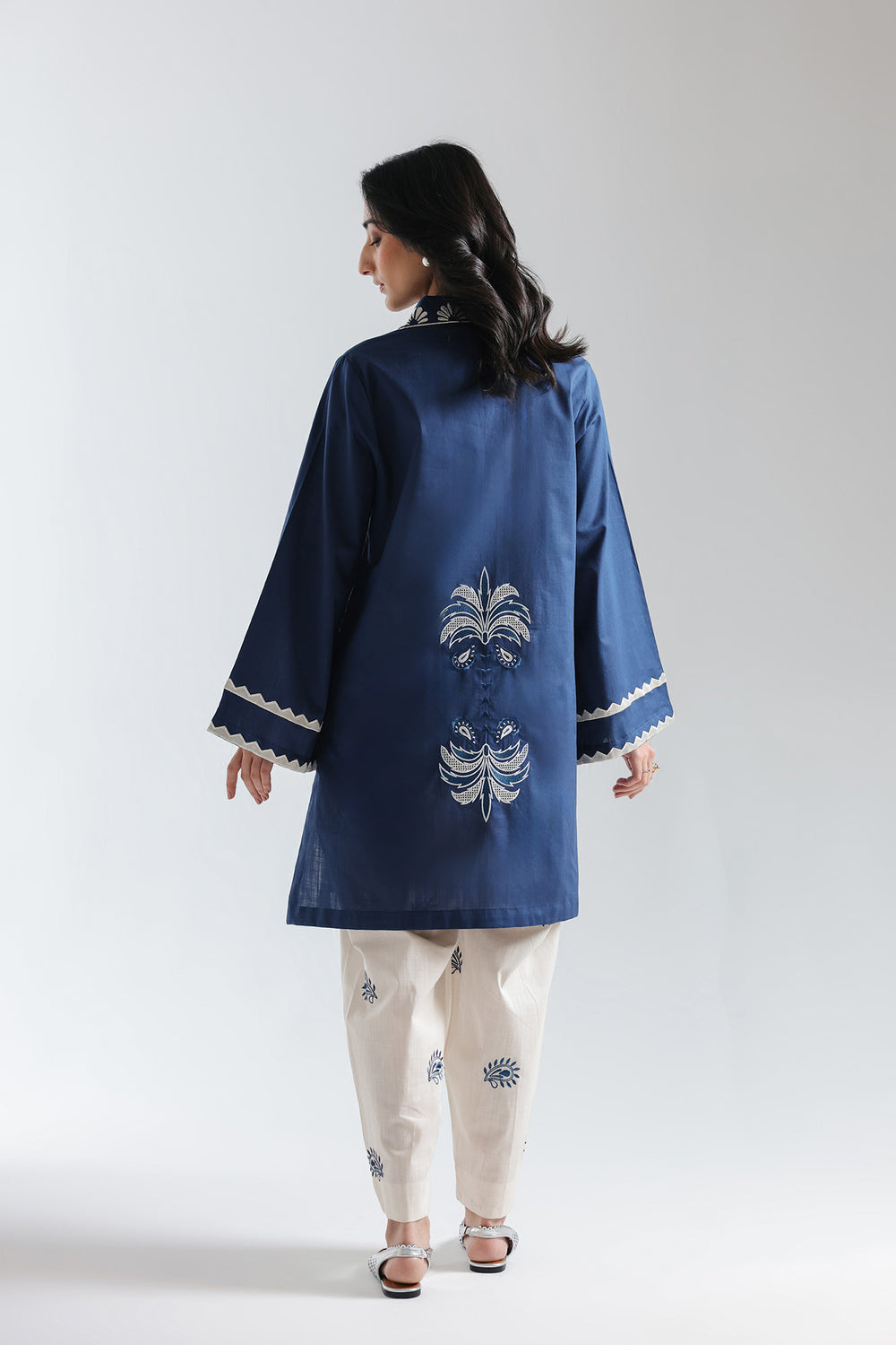 Envelop yourself in the delicate artistry of this serene embroidered suit. The rich blue kurta is beautifully adorned with traditional floral and botanical embroidery flowing along the front, creating a refined yet graceful appeal. Designed with a relaxed silhouette, it features a split V-neckline finished with subtle button details and delicate floral embroidery on the collar. The look is completed with a tailored straight-fit white shalwar, highlighted with an all-over blue print, adding a refreshing contrast. Together, the ensemble strikes a perfect balance of lightness and elegance, making it ideal for refined daywear or special occasions.