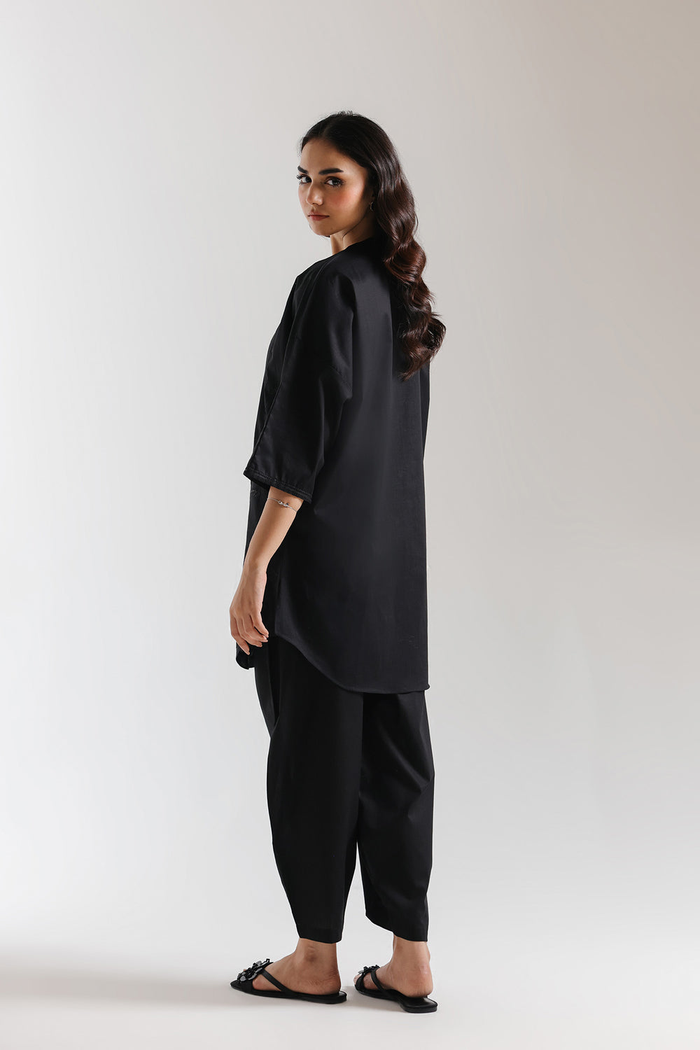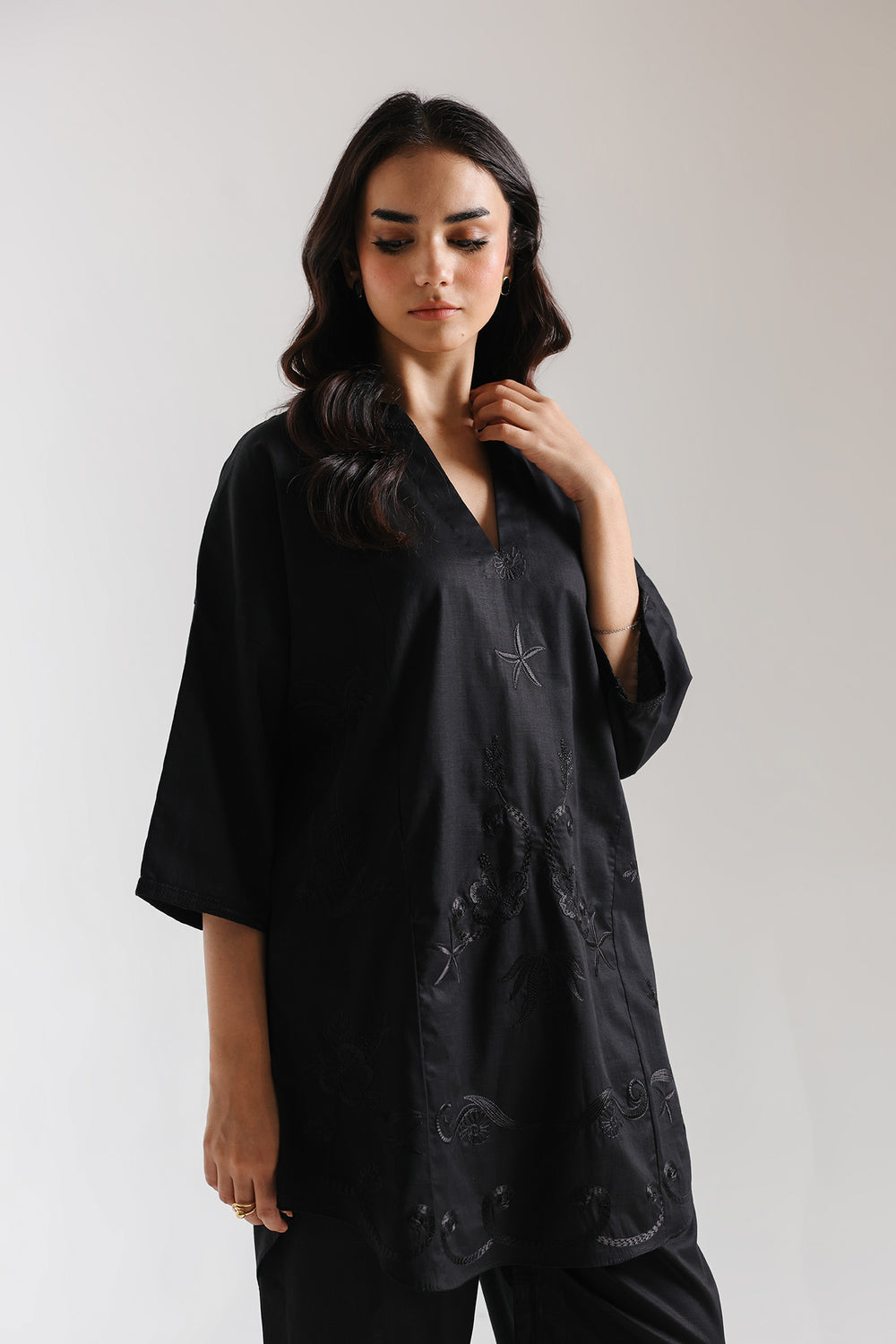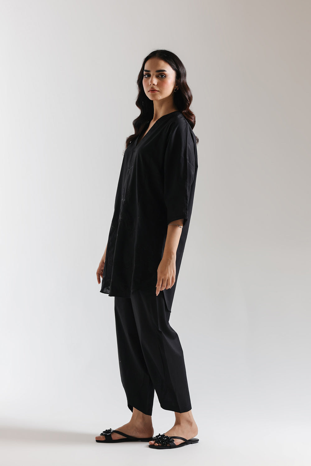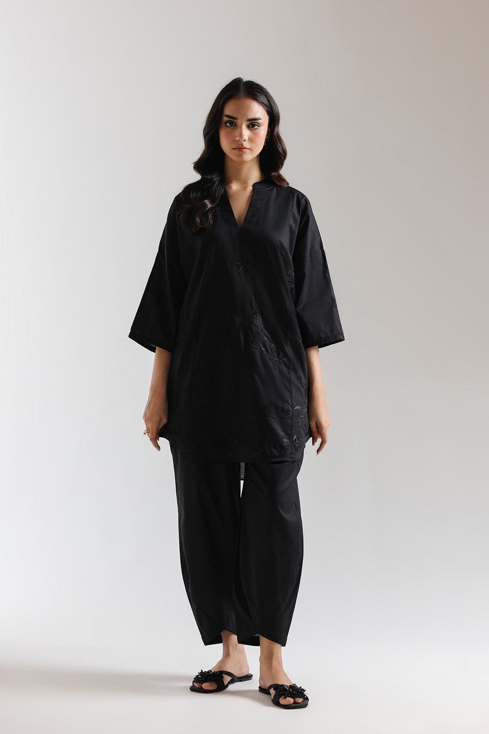 This exquisite embroidered suit seamlessly merges heritage craftsmanship with contemporary design. The black ensemble showcases intricate tonal floral embroidery, a testament to generations of skilled artisanal work. The shirt features a modern loose-fit silhouette with dropped shoulders, creating an effortlessly elegant drape. Paired with a tulip-cut shalwar, this piece strikes the perfect balance between traditional sophistication and current style. Versatile enough for casual gatherings yet refined for special occasions, this suit is an investment in timeless elegance that celebrates cultural artistry.
