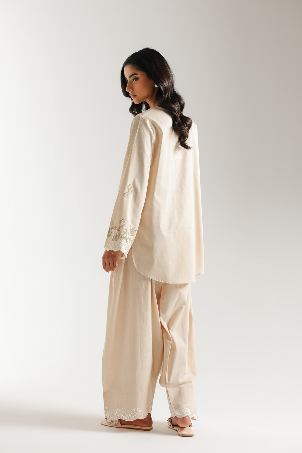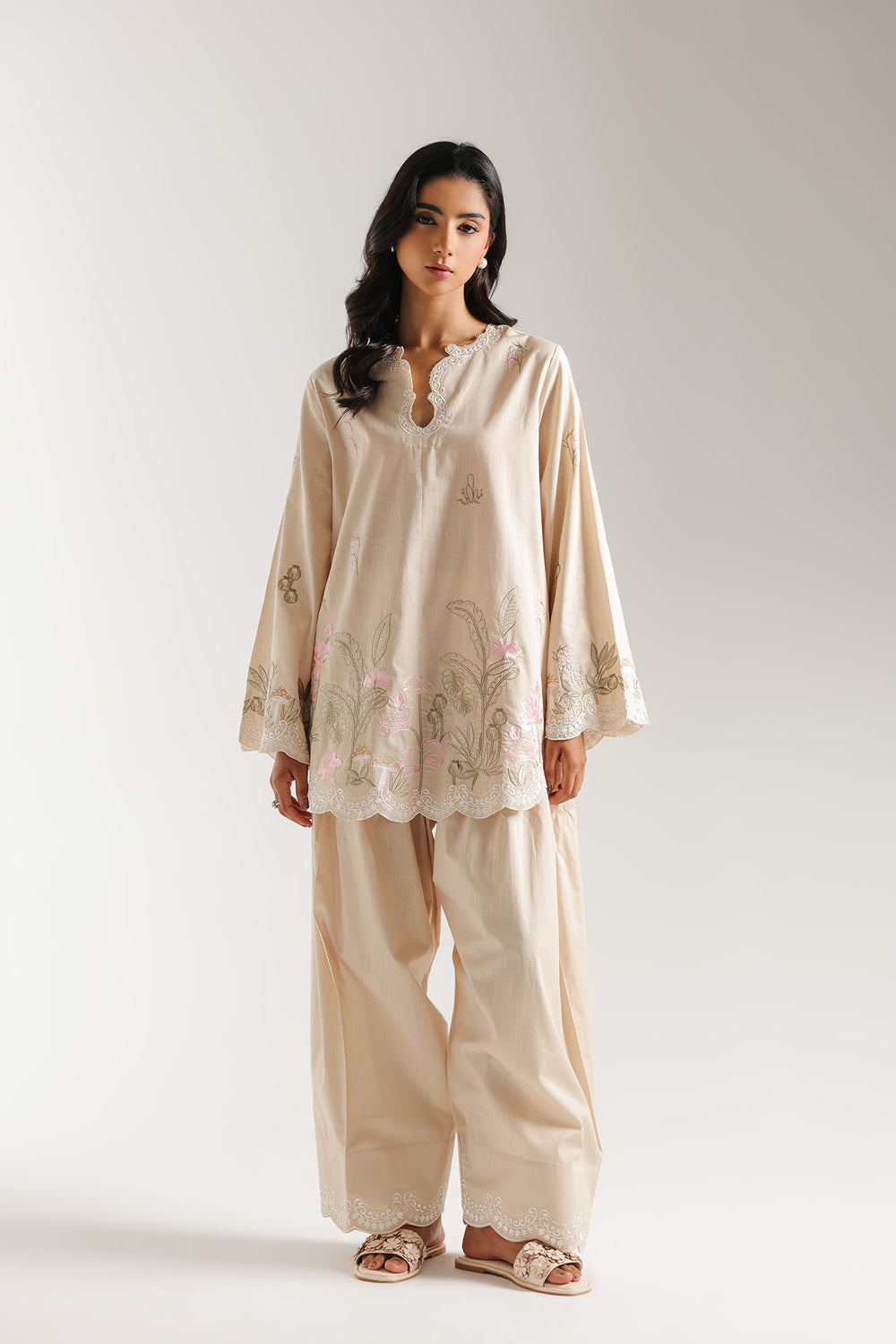 Radiate subtle elegance with this monochromatic two-piece suit, beautifully detailed with delicate botanical embroidery. The relaxed-fit shirt features a soft, scalloped V-neckline adorned with fine ivory needlework, which is mirrored in the lush pink and sage green floral vines blooming across the hemline and wide flared sleeves. This cohesive aesthetic is completed by matching voluminous shalwar, which boast a decorative scalloped border at the ankles to echo the refined craftsmanship of the shirt.
