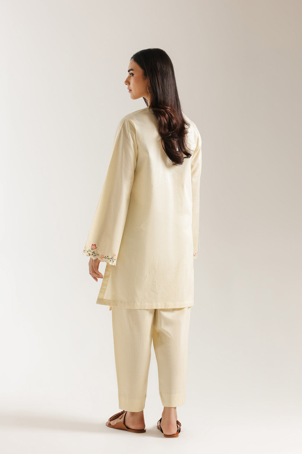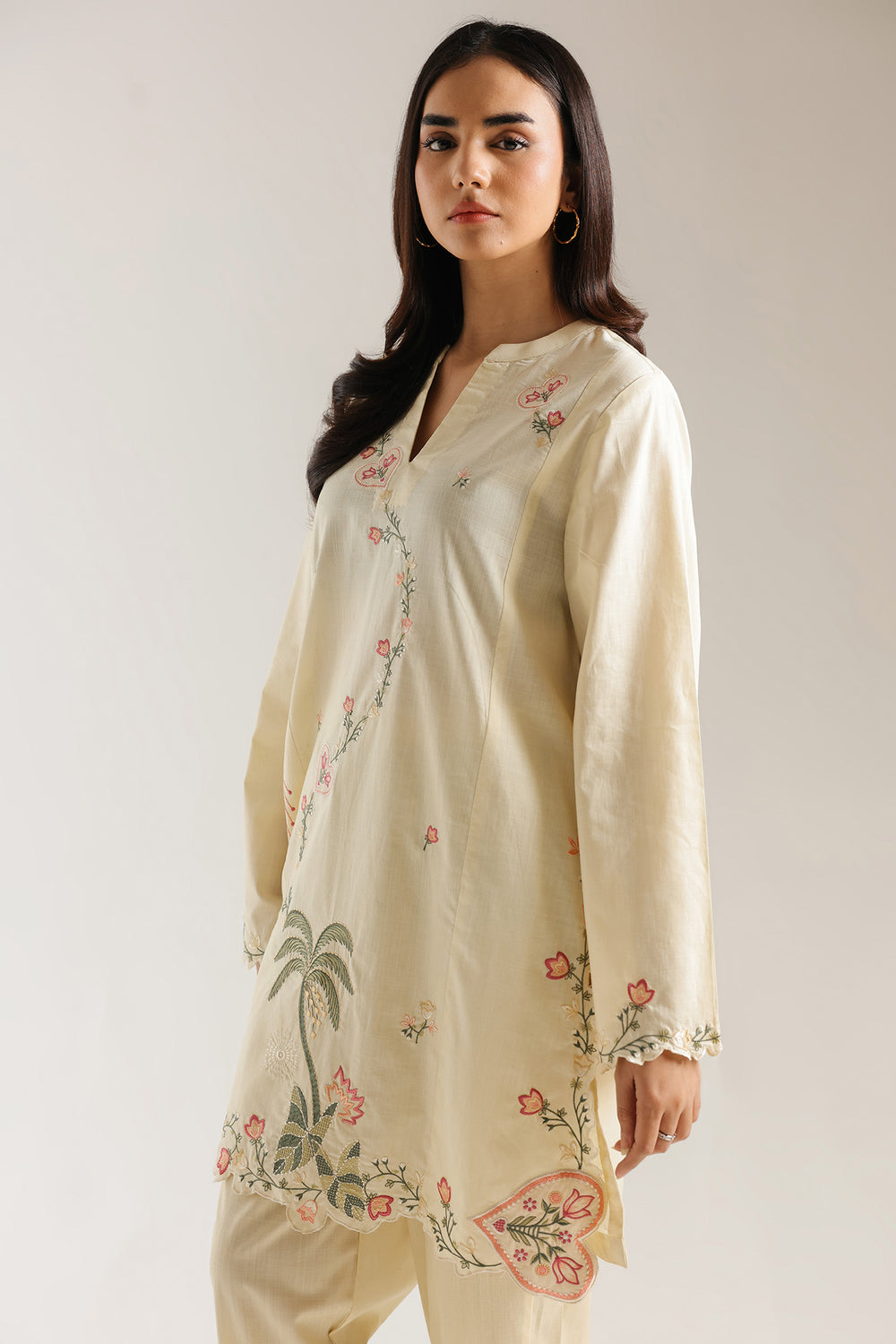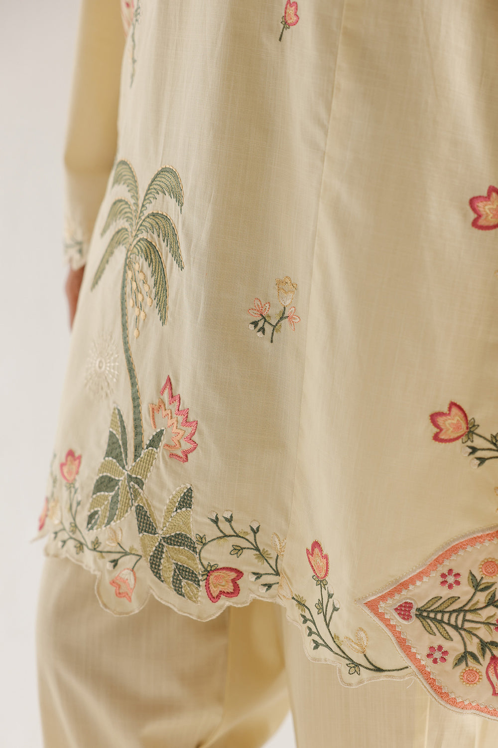Step into a world of serene elegance with this exquisite two-piece ensemble, rendered in a soft buttermilk ivory that radiates a warm, sun-kissed glow. The shirt features a clean ban-style split neckline, offering a modern and minimalist frame for the artisanal storytelling that follows. The bodice is a breathtaking display of nature-inspired artistry, showcasing a towering embroidered palm tree that serves as the centerpiece of a whimsical garden. Delicate trailing vines of peach and rose-toned wildflowers wind gracefully across the front, punctuated by dainty star-like motifs that add a sense of celestial wonder. The voluminous bell sleeves mirror this botanical theme, featuring fine floral sprigs and a feminine scalloped lace border at the cuffs. The shirt is finished with a majestic scalloped hemline, meticulously detailed with intricate floral wreaths and swirling embroidery that provides a luxurious, weighted drape. The look is harmoniously completed with matching straight-fit shalwar in a coordinating ivory hue, ensuring a polished and cohesive silhouette. Perfectly suited for sophisticated daytime festivities or elegant garden soirées, this suit is the premier choice for those who value refined, artisanal beauty.