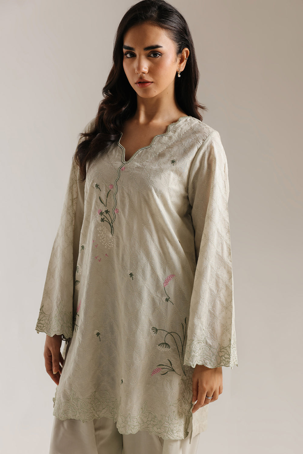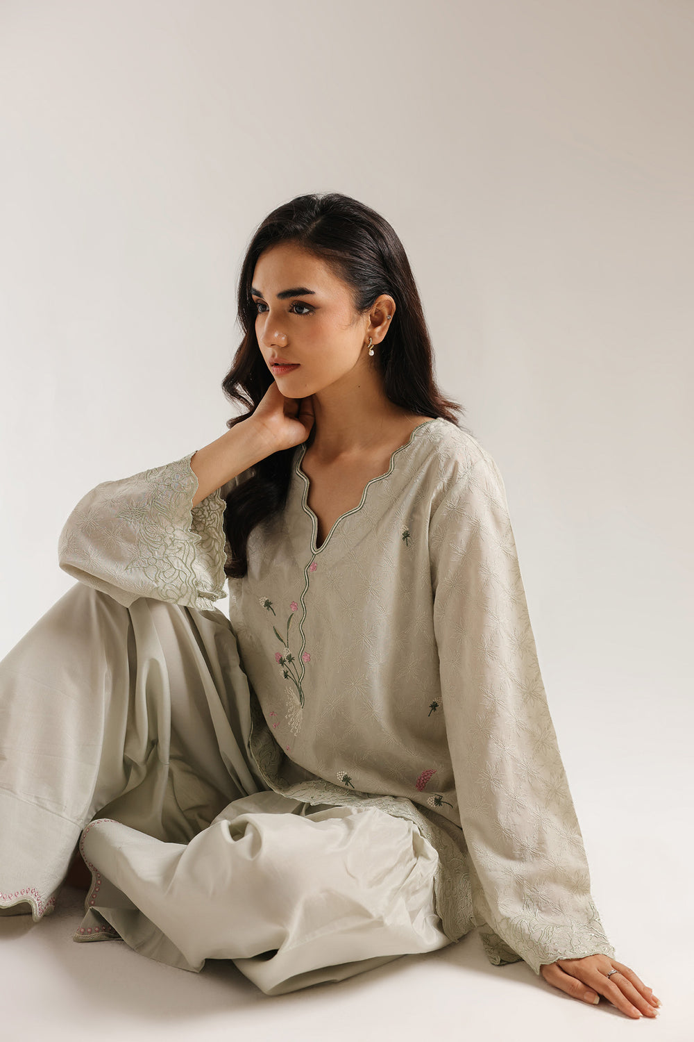 Step into a world of serene, understated luxury with this exquisite two-piece ensemble, rendered in a tranquil sage mist hue. The shirt is crafted from overall embroidered fabric, featuring a tonal diamond-weave pattern that adds a sophisticated, rhythmic depth to the fluid silhouette. The garment is distinguished by its elegant scalloped V-neckline, which serves as a graceful frame for the delicate artisanal storytelling on the bodice. A central vertical spray of fine botanical embroidery—showcasing slender vines and blooming wildflowers in soft shades of rose and emerald—climbs toward the neckline. The shirt is finished with an intricate scalloped hemline, meticulously detailed with swirling tonal embroidery and floral wreaths that provide a luxurious, weighted drape. The look is harmoniously balanced by voluminous wide-leg trousers in a coordinating mist shade, featuring a delicate pink-trimmed scalloped border at the ankles for a polished, head-to-toe finish. Perfect for sophisticated daytime gatherings or intimate festive celebrations, this suit offers a presence that is both ethereal and undeniably refined.