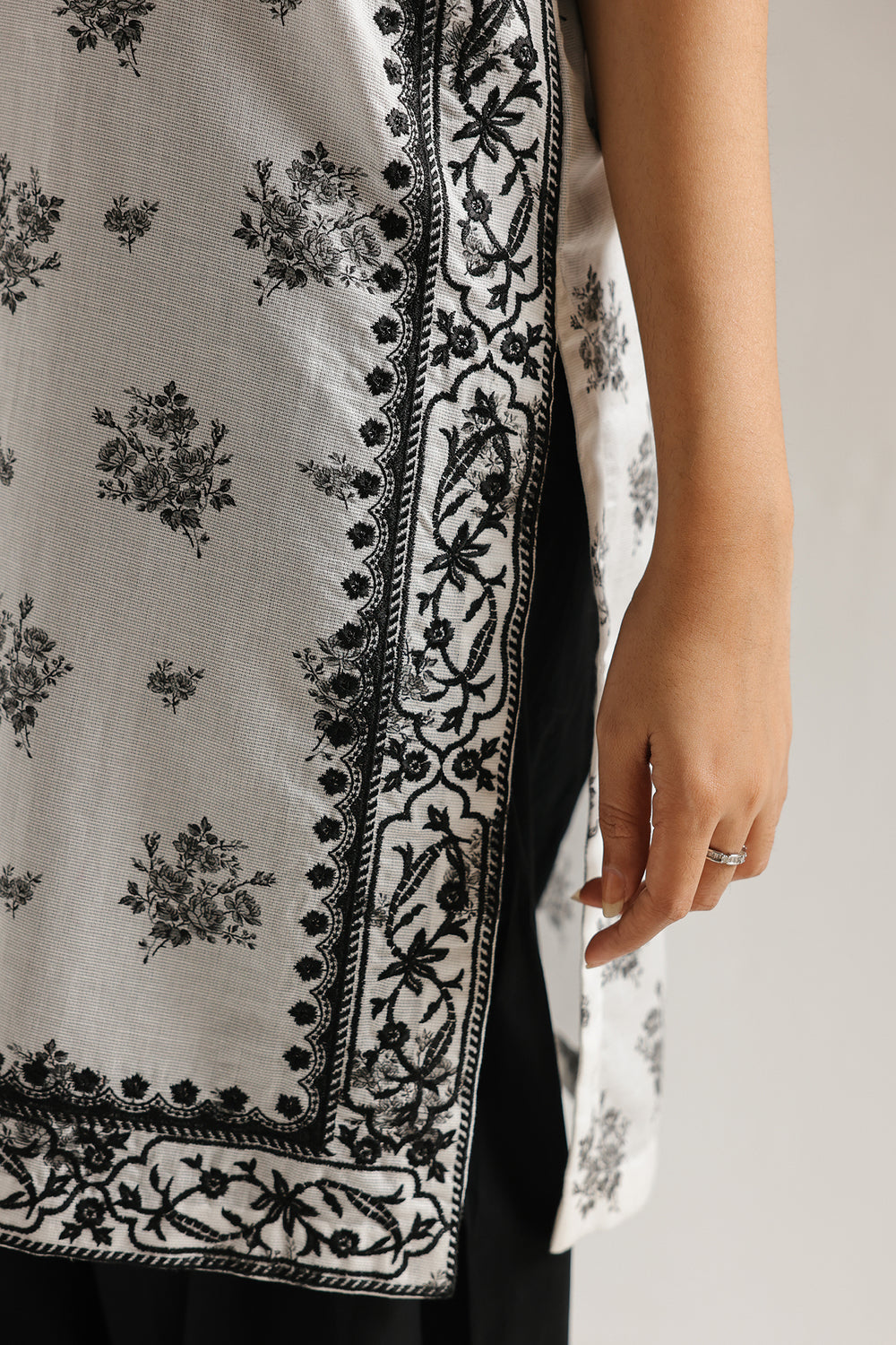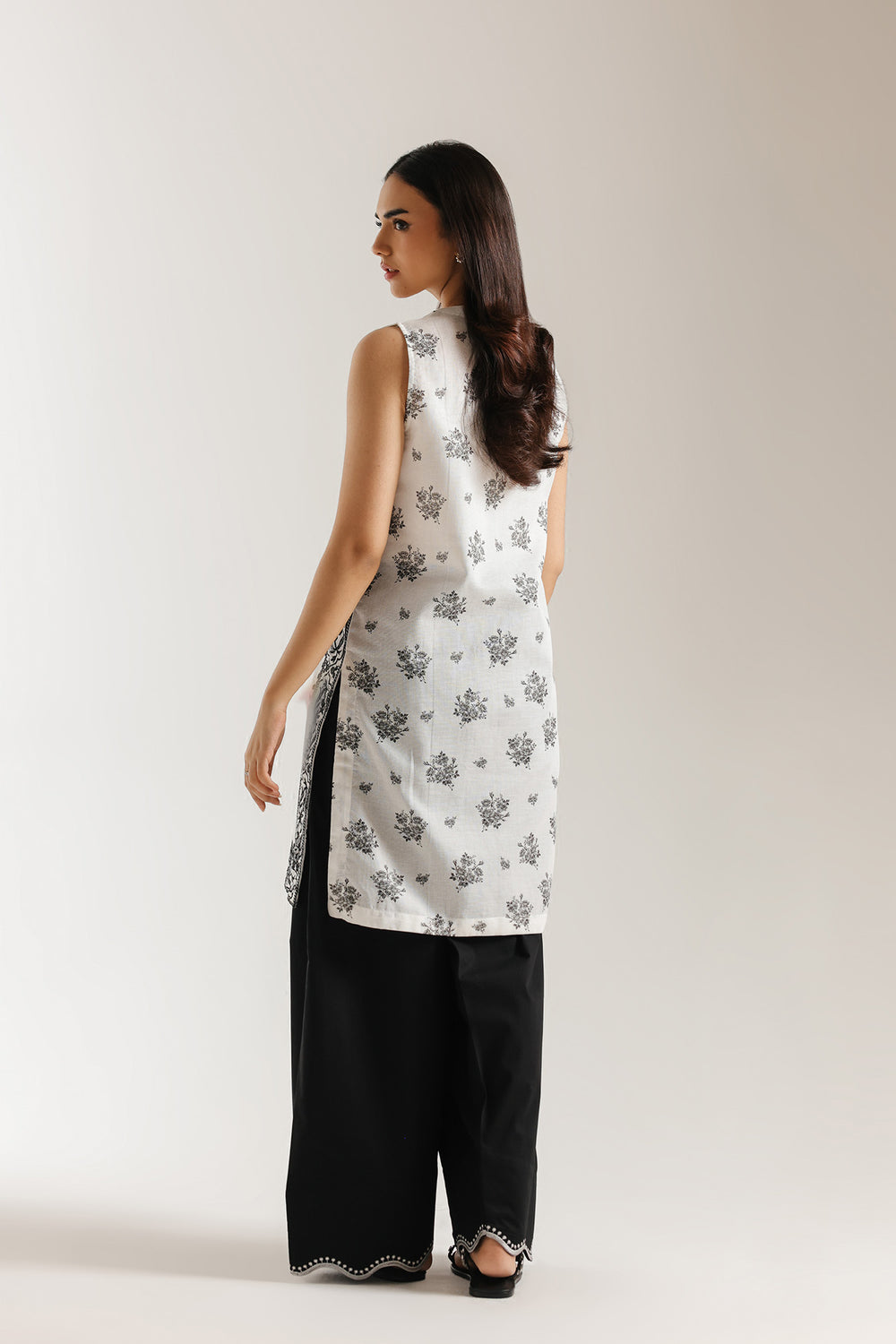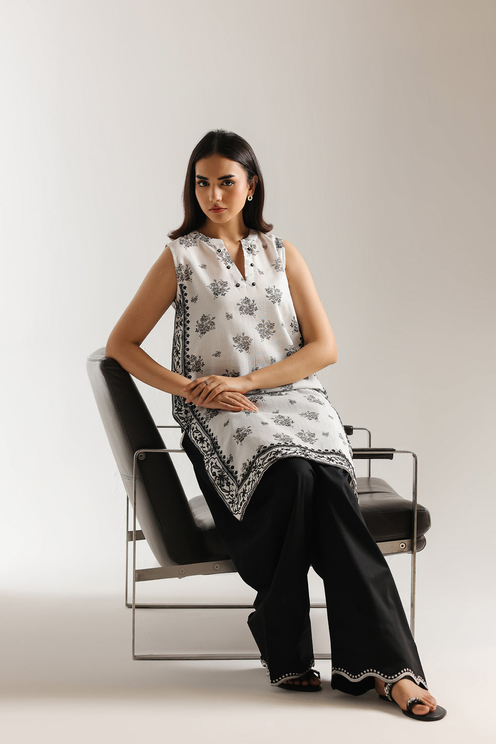 Master the art of high-contrast minimalism with this striking two-piece ensemble, featuring a sleeveless ivory shirt that serves as a pristine canvas for dramatic monochromatic artistry. The design is distinguished by a contemporary notched V-neckline accented with dark contrast buttons and an all-over print of delicate noir botanical sprigs. These floral elements are elegantly framed by a dense, ornate geometric border at the hem and side slits, providing a structured finish to the fluid silhouette. The look is grounded by solid black wide-leg shalwar, which feature a subtle yet refined scalloped embroidery at the ankles to echo the shirt's intricate detailing. Perfect for the modern woman, this suit offers a presence that is both effortlessly bold and undeniably polished for any sophisticated gathering.