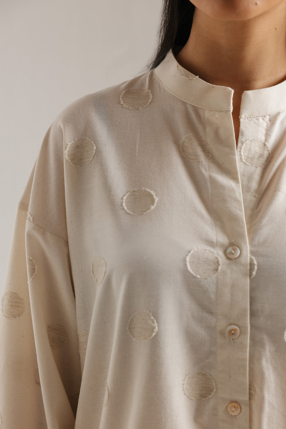 Step into a world of refined serenity with this exquisite two-piece ensemble, rendered in a pristine creamy ivory that radiates soft, understated luxury. The shirt is crafted from a premium textured fabric, featuring a tonal polka-dot embroidery that creates a rhythmic and sophisticated tactile depth across the entire silhouette. This look is harmoniously balanced by matching wide-leg farshi shalwar, providing a relaxed yet polished profile that transitions effortlessly from sun-drenched daytime events to intimate evening social gatherings. Perfectly suited for the modern minimalist, this suit offers a presence that is both timelessly elegant and undeniably fresh.