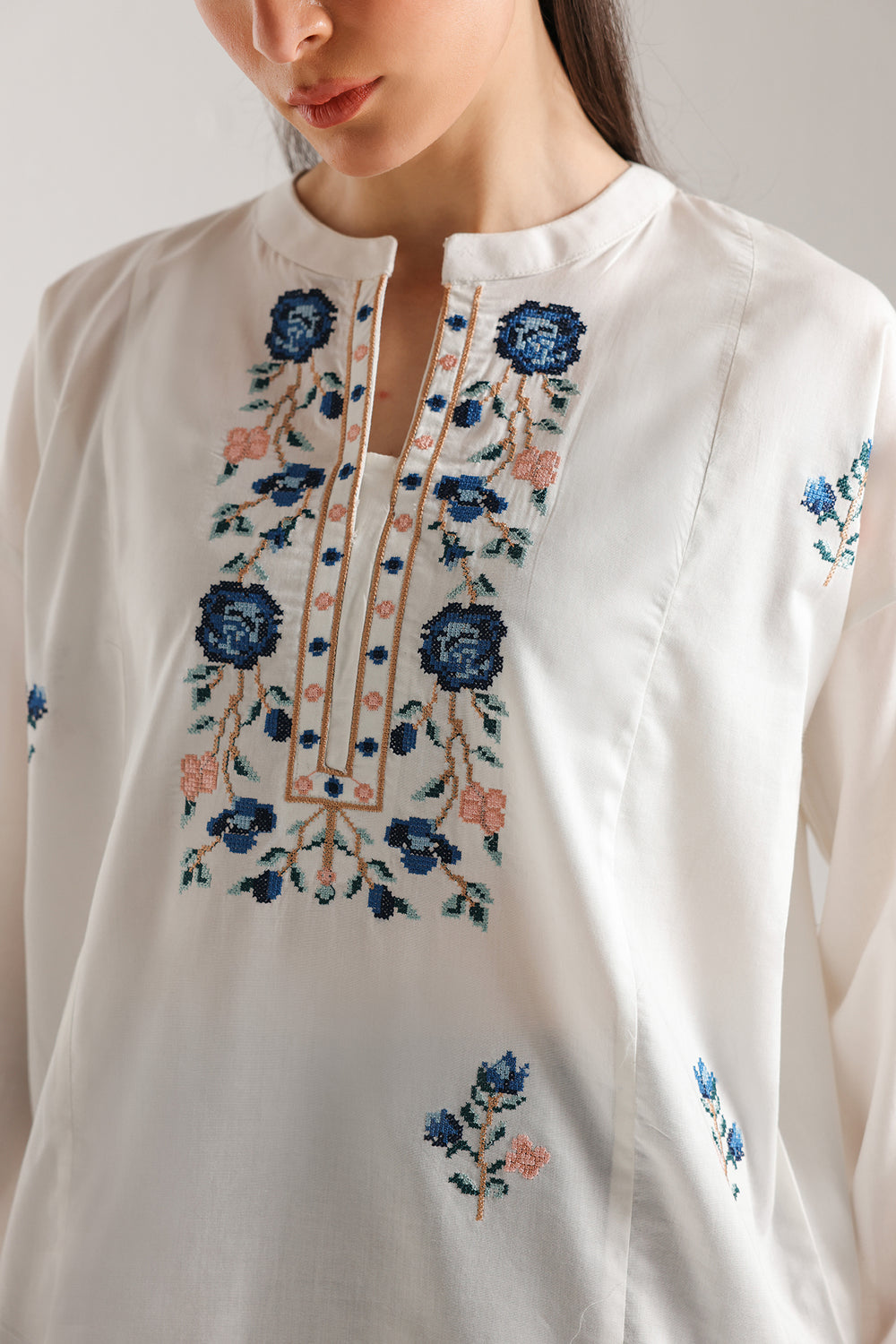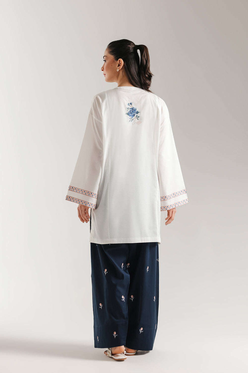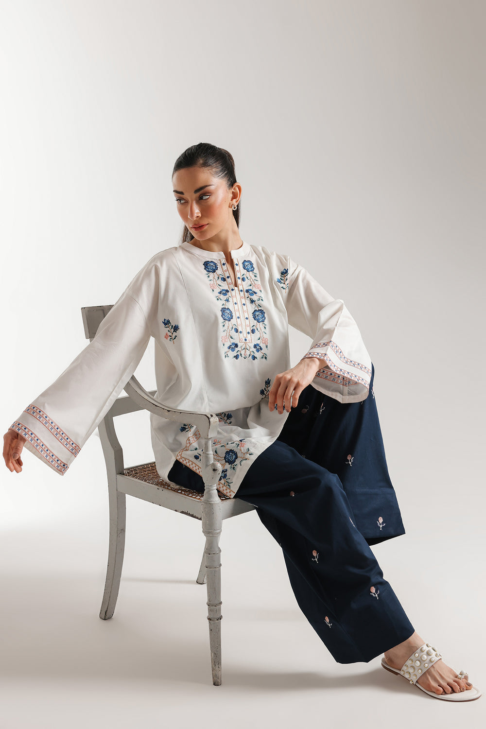 Embrace a refreshing blend of contemporary comfort and traditional artistry with this ivory embroidered suit. The mid-length tunic features a clean band collar and an elegant split neckline, highlighted by intricate blue and coral floral embroidery that creates a stunning focal point. Delicate botanical motifs are artfully scattered across the front and sleeves, leading to a refined geometric border at the cuffs. Paired with deep navy wide-leg shalwar featuring subtle scattered embroidery. This ensemble offers a sophisticated silhouette perfect for elevated daytime gatherings. Experience effortless style with this masterfully detailed two-piece set.