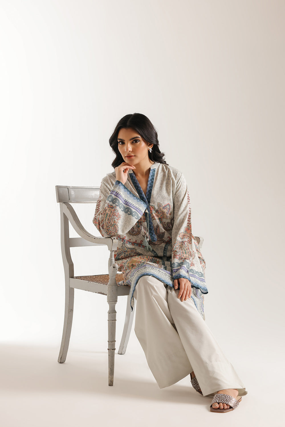 A distinguished printed suit featuring decorative tassel hangings that frame a classic round neckline with an elegant V-slit detail. The knee-length silhouette provides refined proportions, while the full-length sleeves ensure graceful coverage and movement paired with wide leg shalwar. The tassel embellishments add traditional authenticity and visual interest, creating a dynamic focal point at the neckline. This carefully designed ensemble balances timeless ethnic elements with contemporary tailoring.