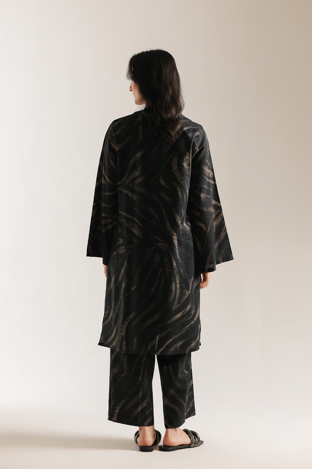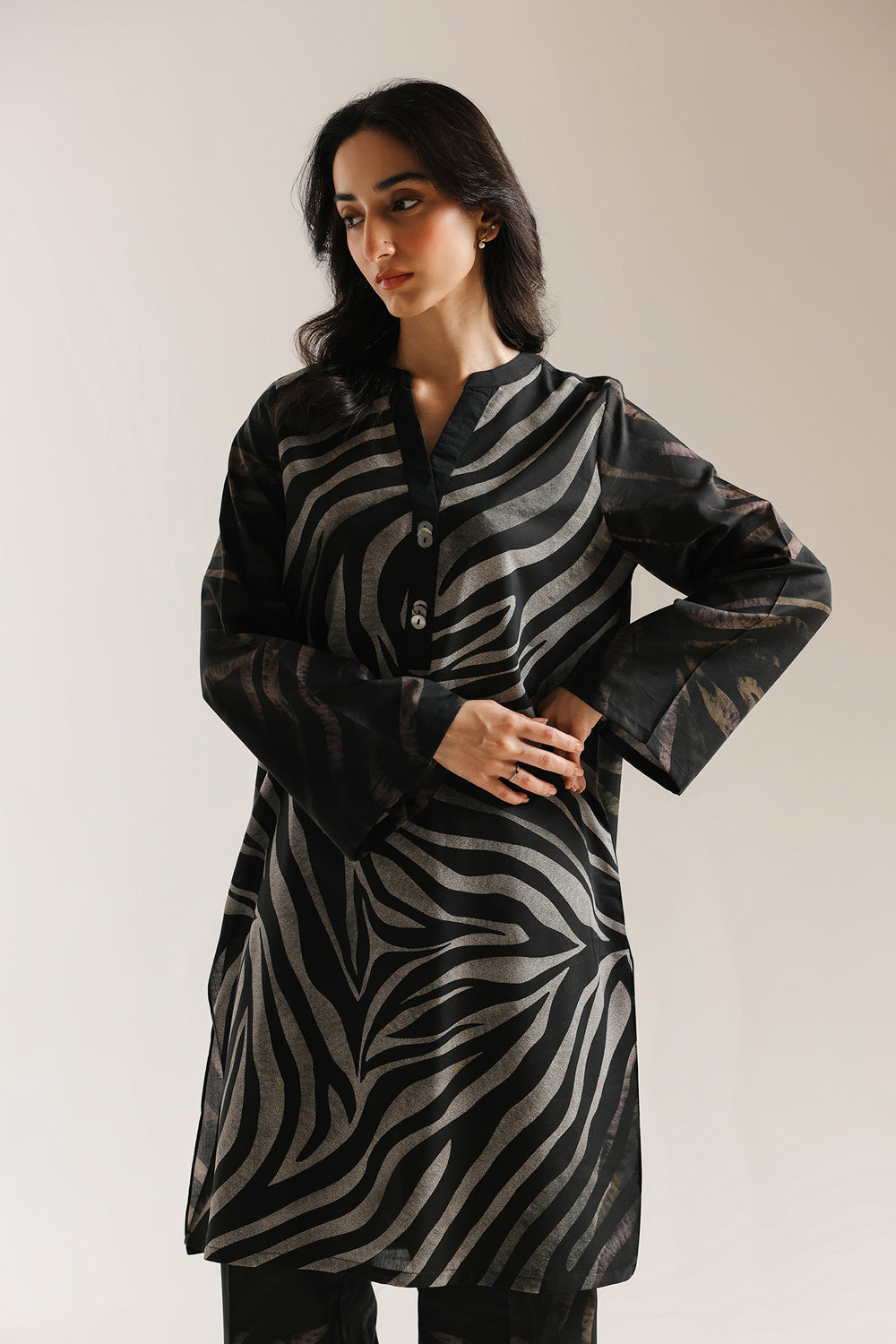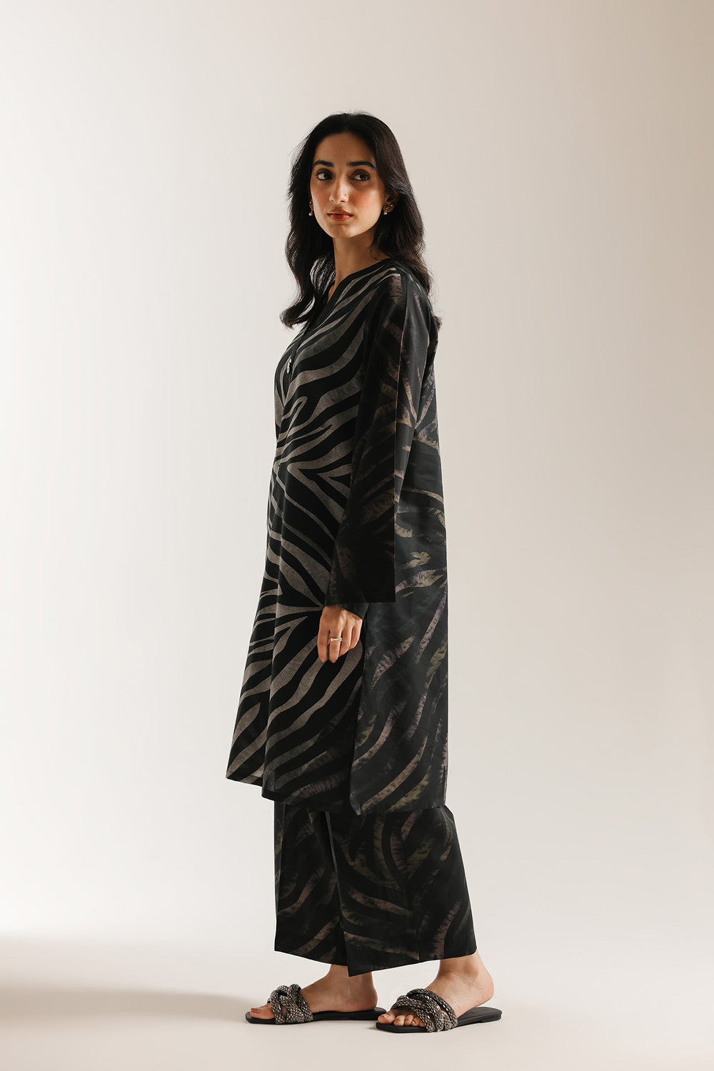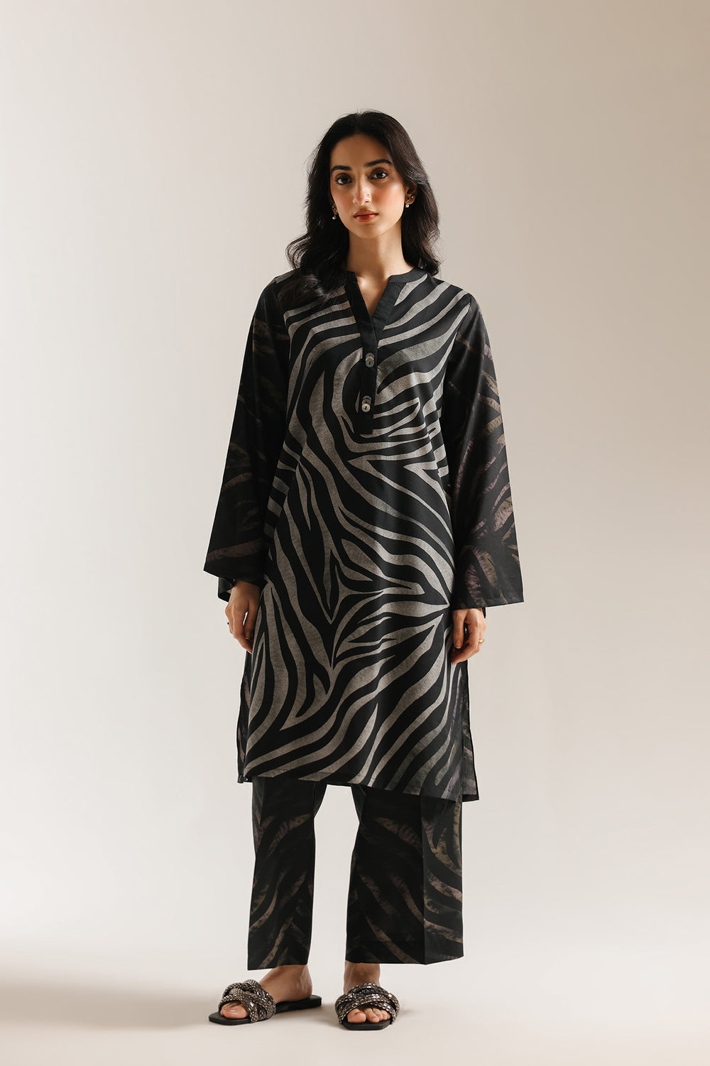 A bold printed suit featuring a striking zebra pattern on a black shirt in standard length with full-coverage sleeves. The coordinating straight-cut trouser maintains the monochromatic palette while providing clean, contemporary lines. This two-piece ensemble showcases confident design through its distinctive animal print motif, creating visual impact without sacrificing sophistication, while the straight trouser silhouette ensures a polished appearance.