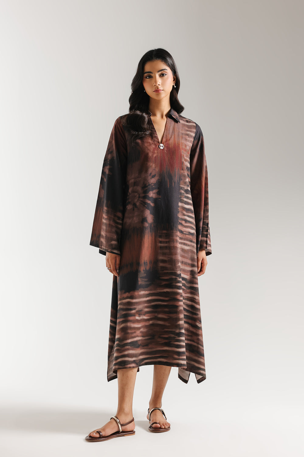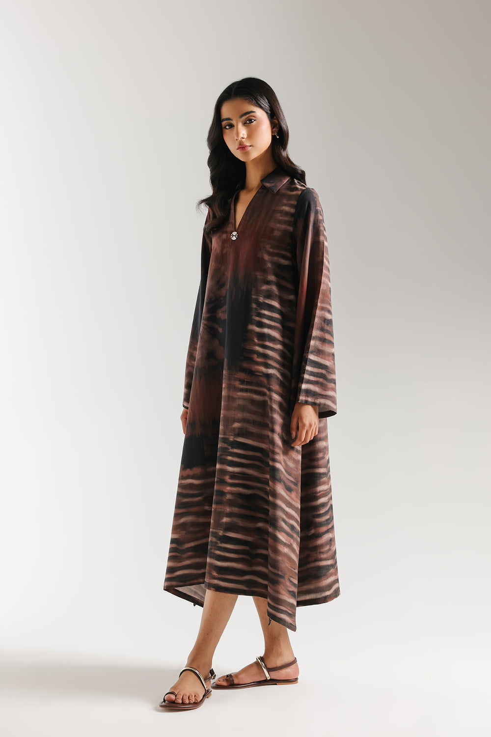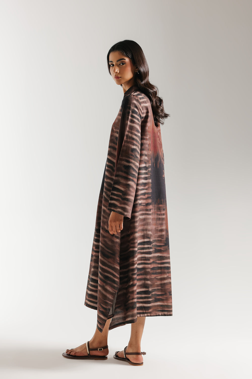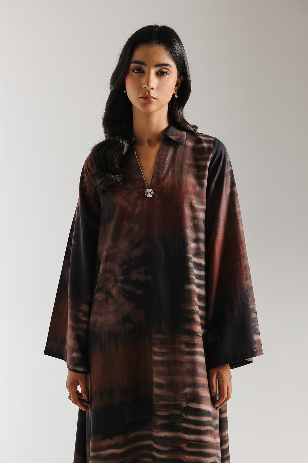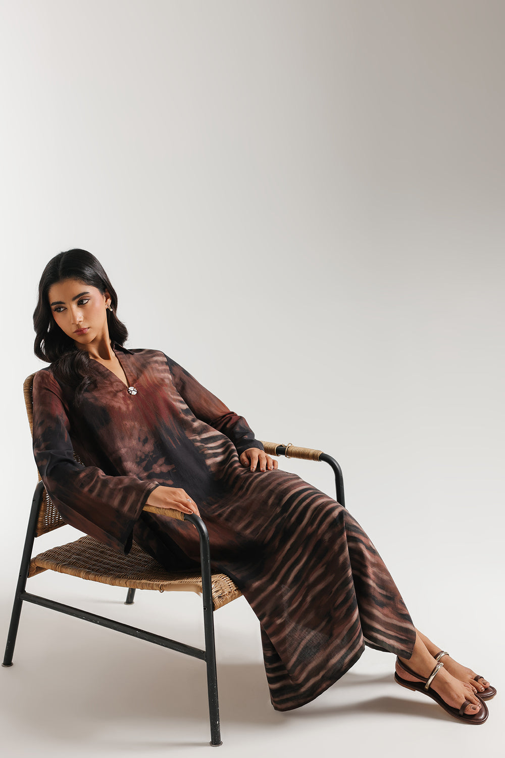 Make a modern and expressive statement with this multi-toned printed shirt, featuring a bold, abstract tie-dye-inspired design. The garment is saturated in deep earthy hues of mahogany, charcoal, and burnt sienna, with horizontal streaks and sunburst patterns that create a dynamic sense of movement. A refined V-neckline is accented by a small standing collar and a single decorative silver-toned button, providing a structured contrast to the relaxed, long-line silhouette. With its wide straight sleeves and asymmetric high-low hem featuring side slits, this shirt offers a graceful, airy drape that is perfect for a sophisticated yet effortless ensemble.