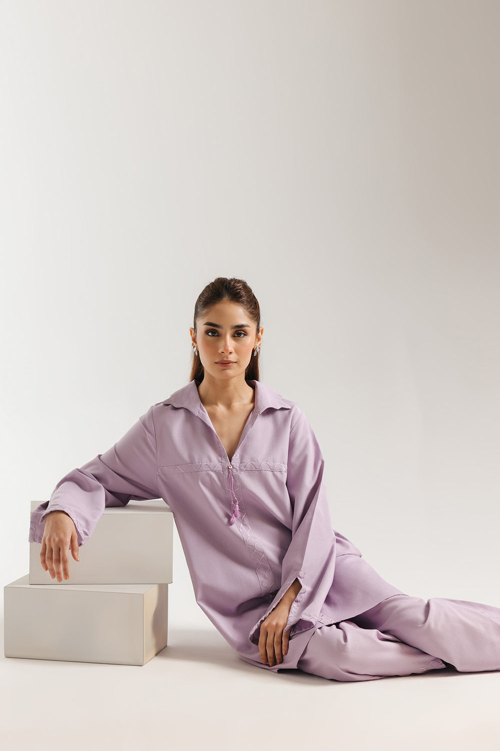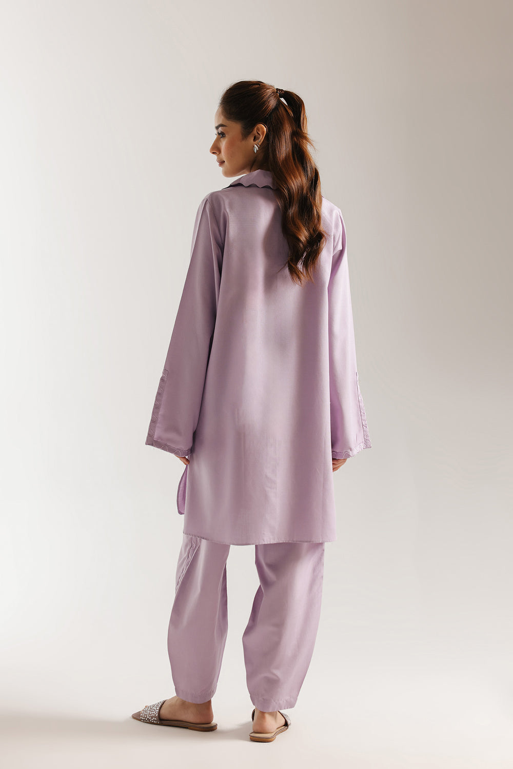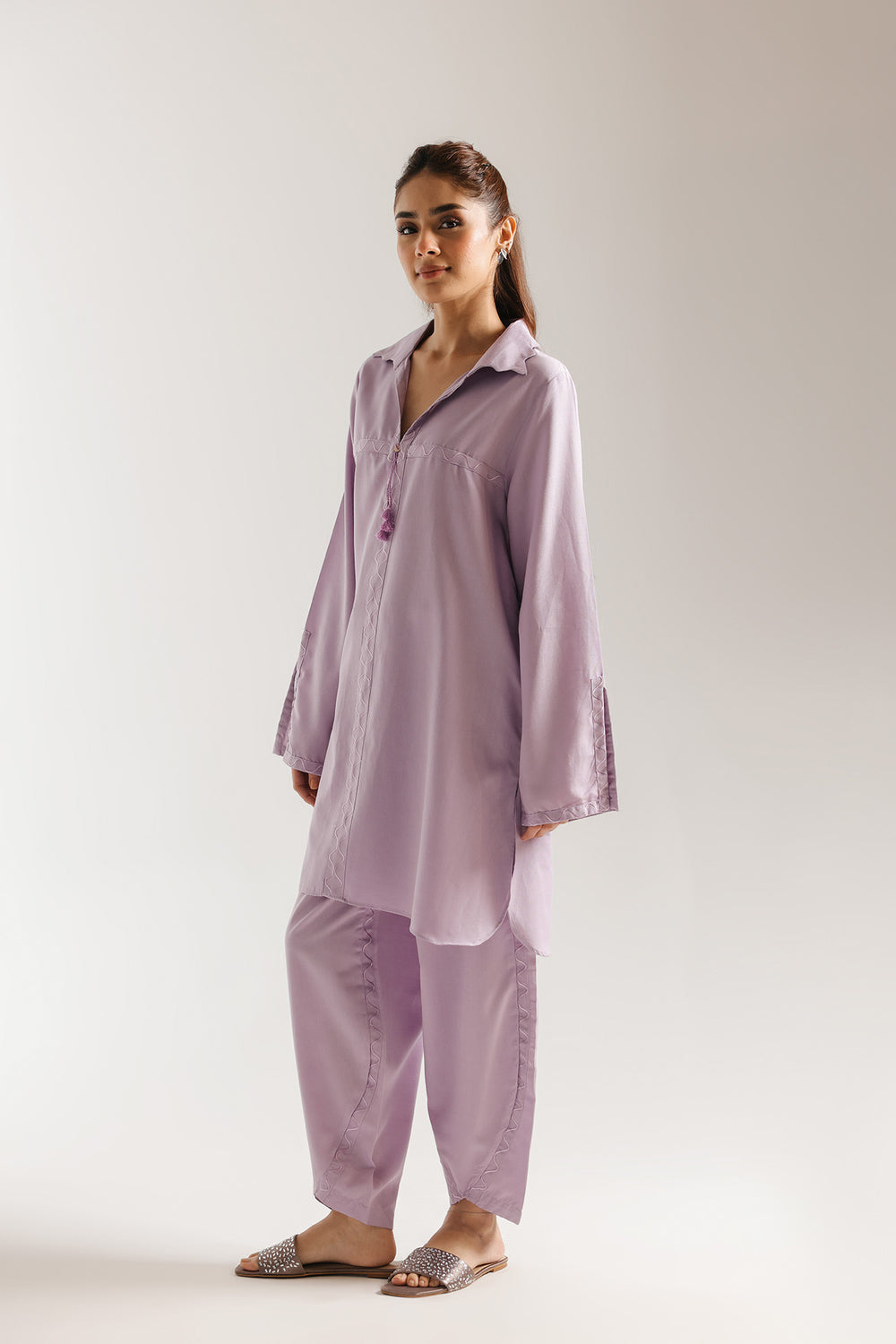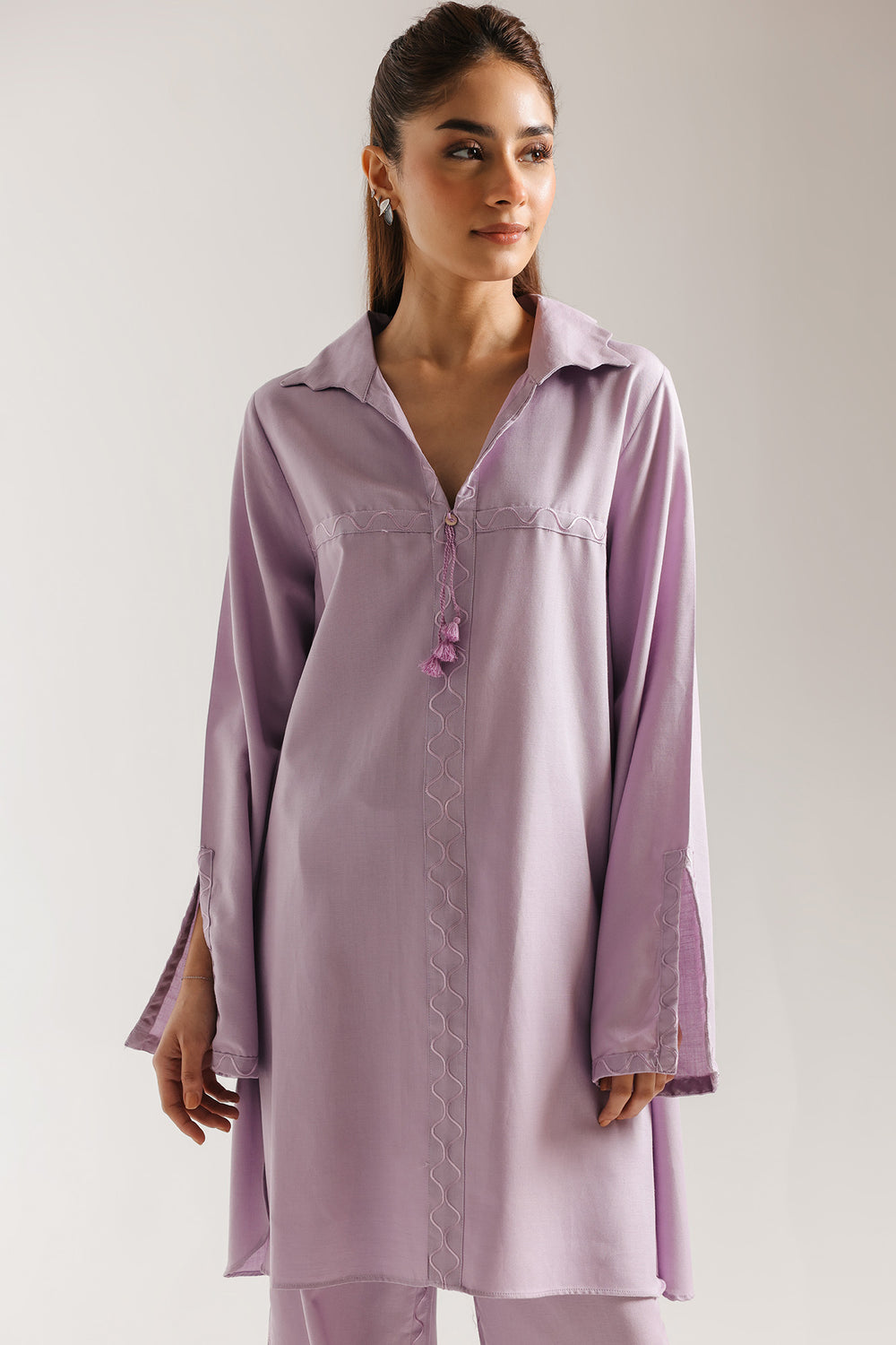 Experience the ultimate in understated luxury with this luminous two-piece ensemble, rendered in a soothing pastel lilac palette. The shirt features a modern collared neckline with a delicate split front, accented by a dainty hanging tassel that adds a touch of whimsical movement. Refined, tonal geometric embroidery frames the bodice and follows the center, offering a subtle architectural texture to the fluid fabric. The wide sleeves mirror this minimalist artistry, featuring a unique split cuff detailed with coordinating tonal threadwork. This ensemble is perfectly paired with contemporary tulip-style shalwar, which showcase a signature curved hemline accented with matching wavy embroidery for a polished, head-to-toe look. Effortlessly chic and breathable, this suit is an ideal choice for sophisticated daytime gatherings or elegant casual wear.