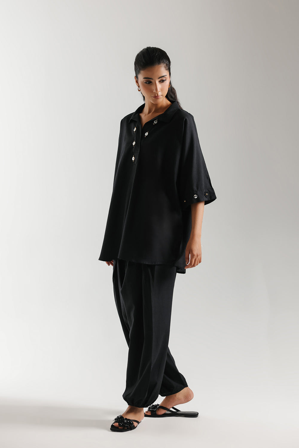 Discover contemporary ease with this refined black coordinated set, designed for the modern individual who values both comfort and style. The oversized boxy shirt features a classic collar and refined placket closure accented with lustrous pearl-toned buttons, while elbow-length sleeves are finished with subtle metallic detailing at the cuffs. Paired with generously cut harem pants that gather elegantly at the ankles, this ensemble embraces volume and movement for an effortlessly sophisticated silhouette.