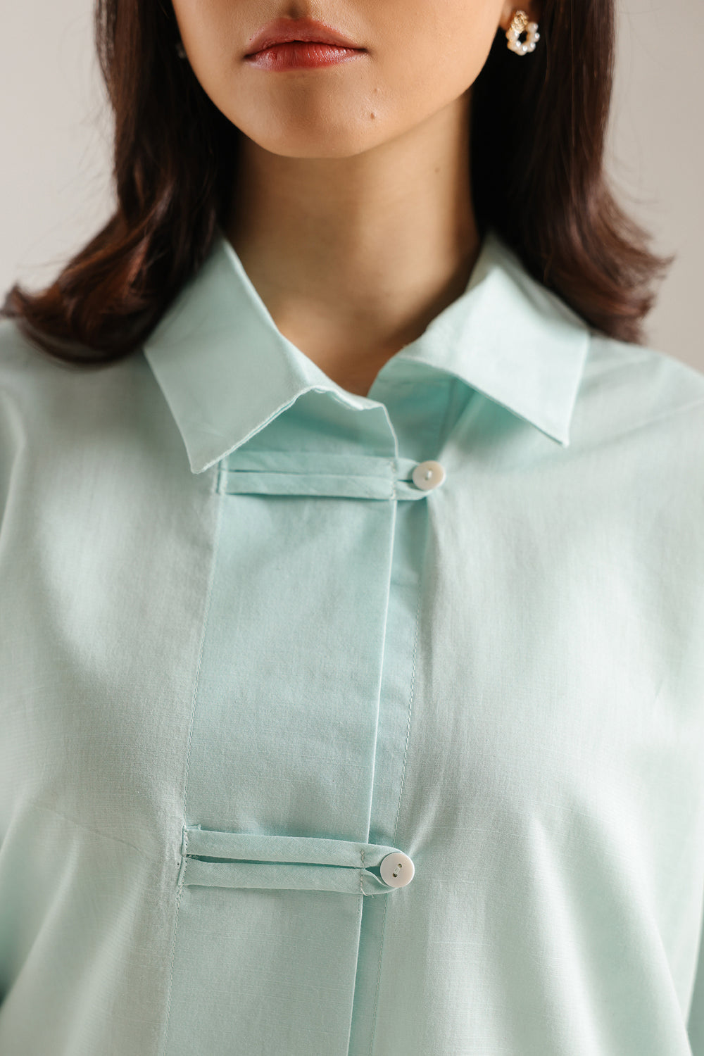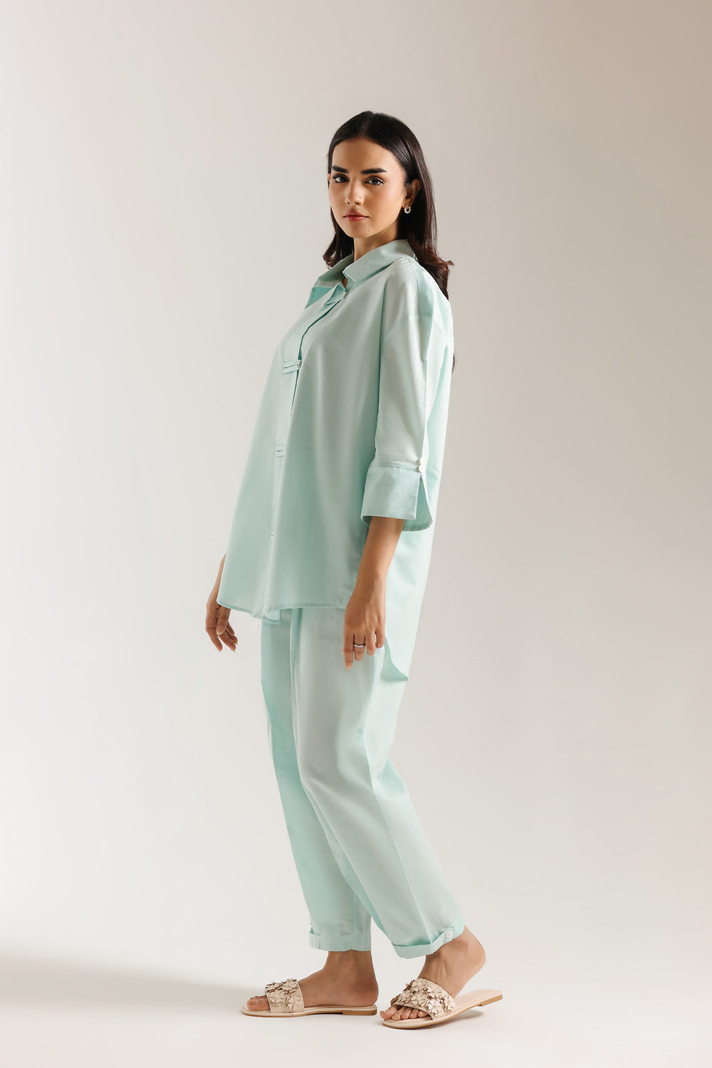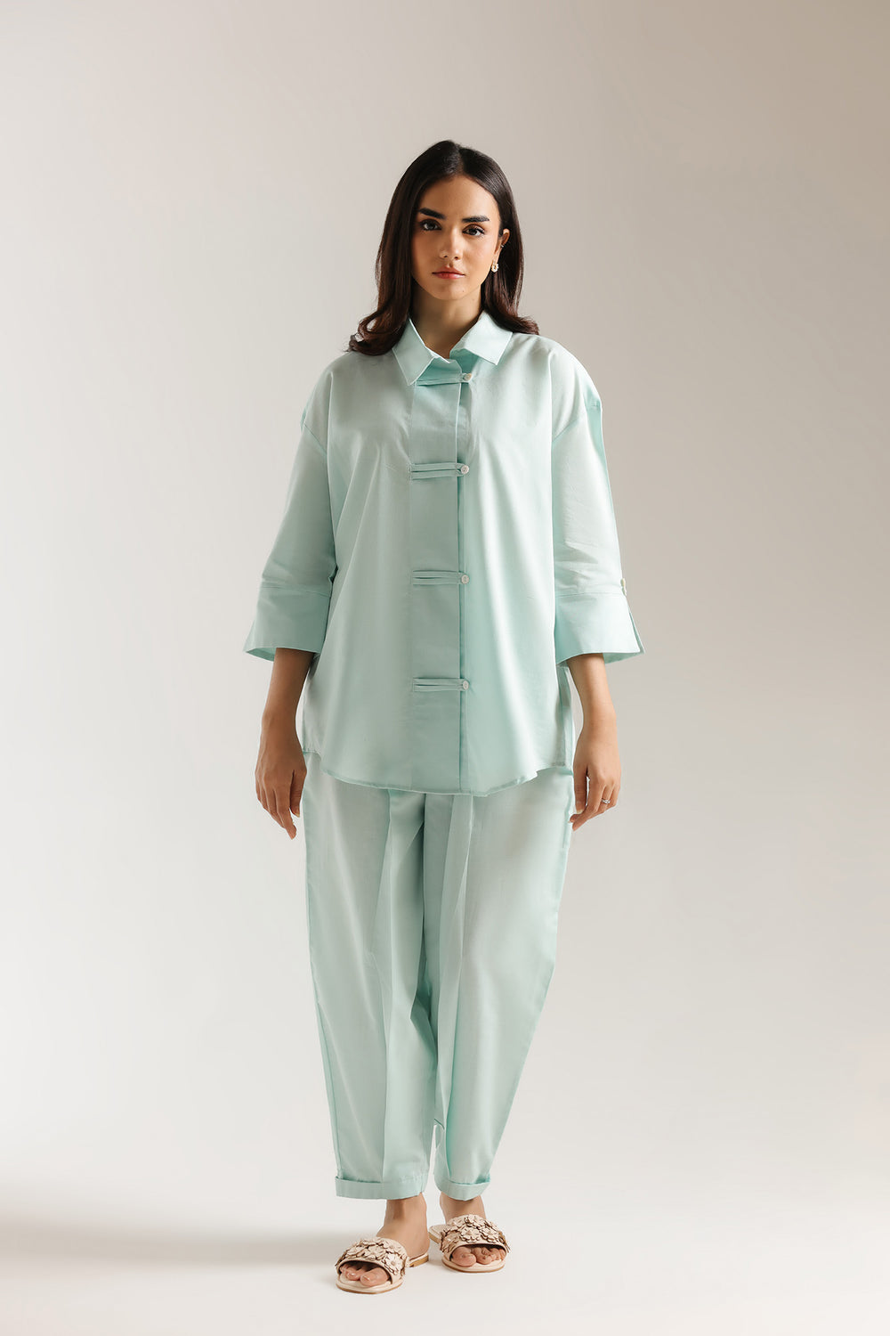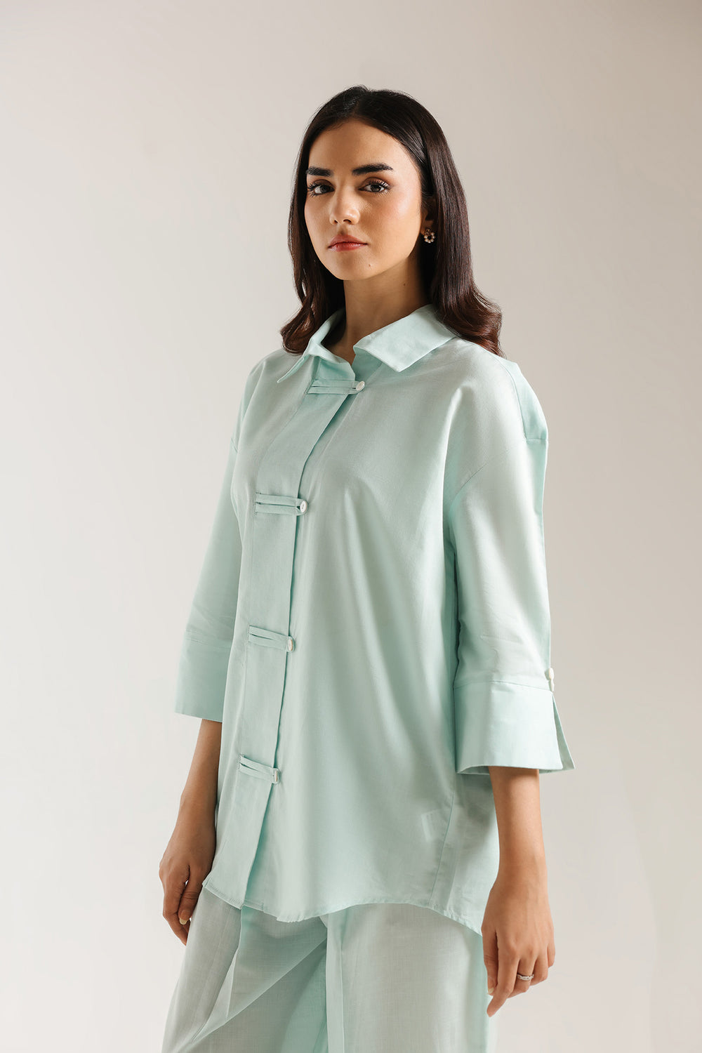 Embrace a cool, contemporary aesthetic with this striking two-piece ensemble, rendered in a refreshing mint aqua that radiates modern serenity. This suit is a masterclass in structured minimalism, offering a unique silhouette that blends traditional influences with avant-garde tailoring. The shirt features a sharp classic collar and a distinctive central placket detailed with horizontal fabric-loop fasteners, creating a clean and rhythmic visual interest. Designed with a relaxed, slightly oversized fit, it includes structured three-quarter sleeves with wide cuffs and a subtle high-low curved hemline for a fluid, graceful drape. The look is harmoniously completed with coordinating tailored trouser, featuring a tapered fit and crisp cuffed ankles that anchor the voluminous top. Crafted for the woman who values bold simplicity and clean lines, this suit is the premier choice for professional gallery openings, sophisticated luncheons, or chic daytime events.