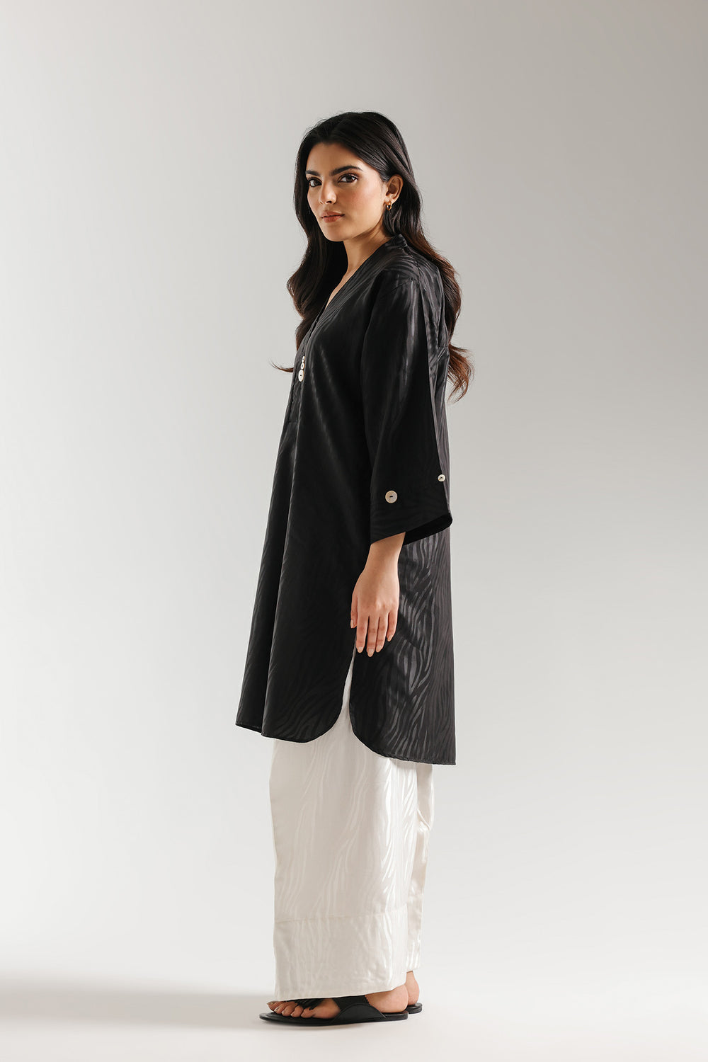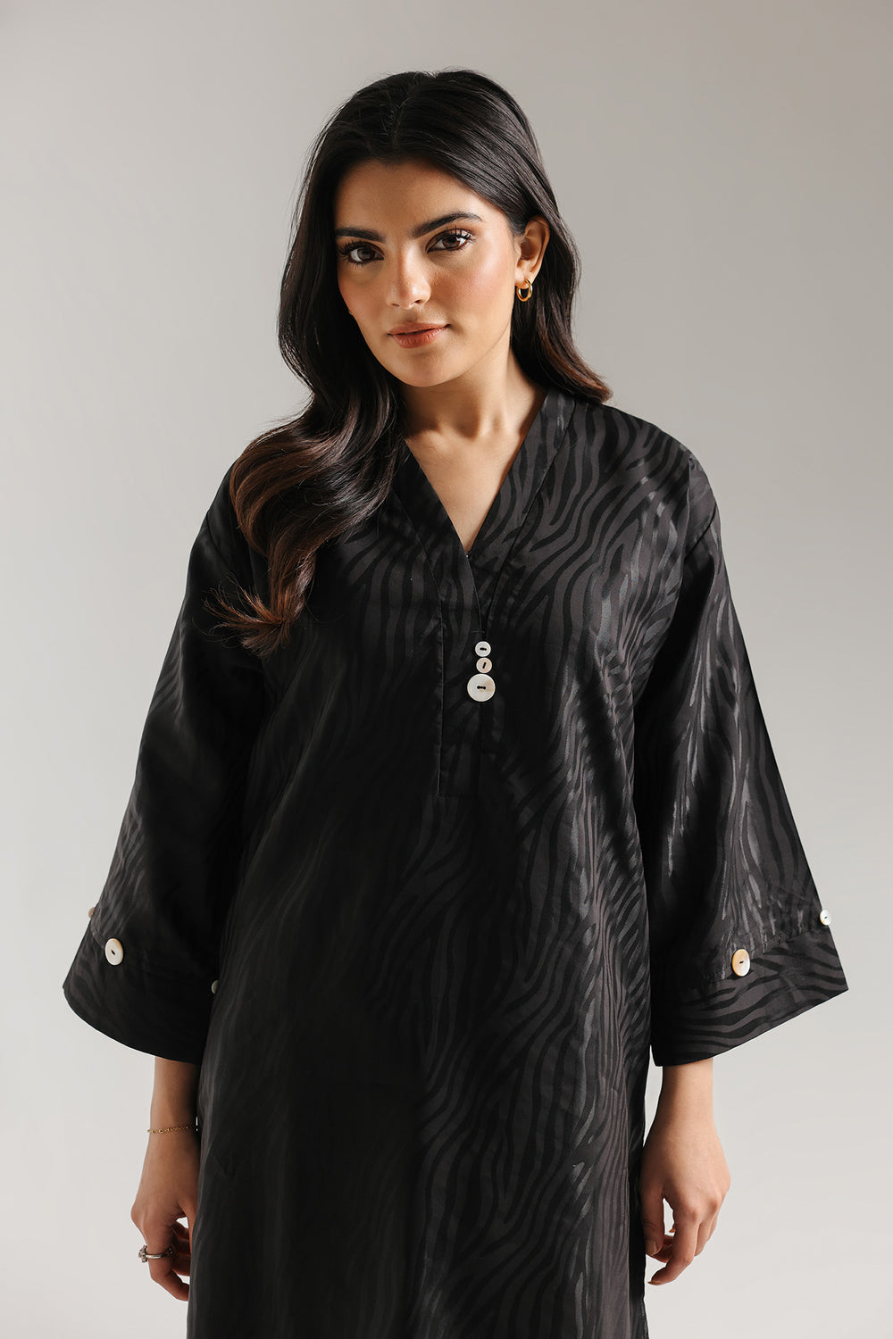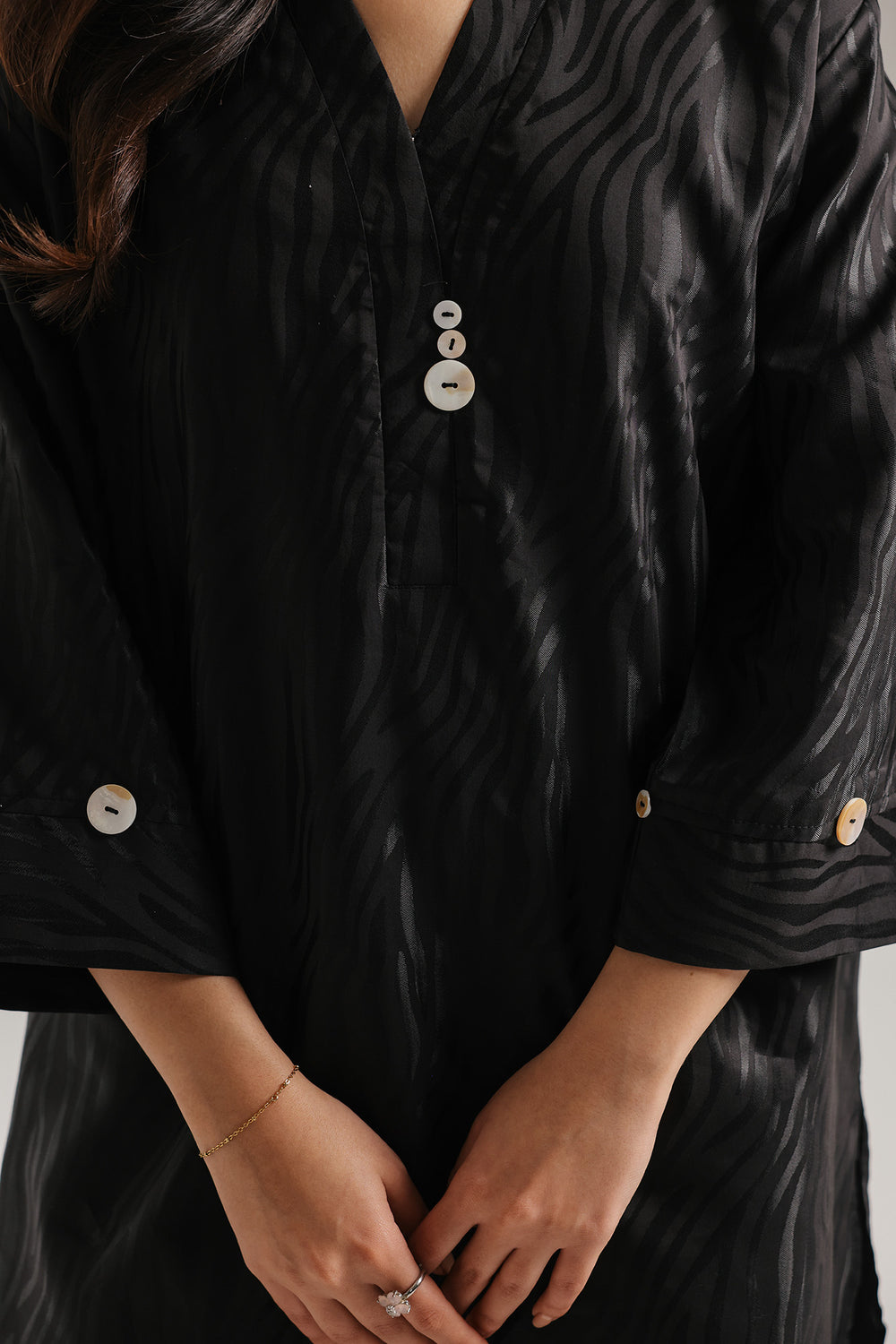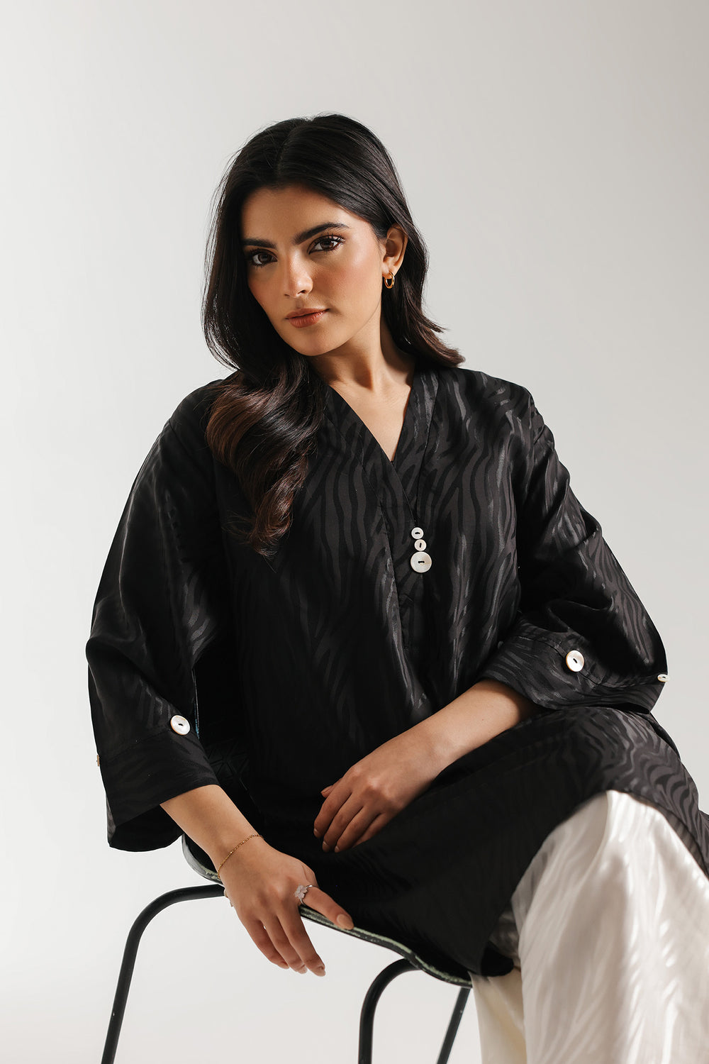 Elevate your contemporary wardrobe with this striking solid shirt, rendered in a classic black that captures a sense of modern mystery. The garment is a masterclass in textile innovation, featuring an all-over ripple-effect texture that creates a dynamic, liquid-like sheen as it catches the light. Designed with a sleek, minimalist V-neckline accented by delicate white button detail, this top offers a polished yet artistic profile. Whether paired with voluminous white textured trousers for a high-contrast look or styled for a refined evening social, this shirt ensures a presence that is both daringly unique and undeniably sophisticated.