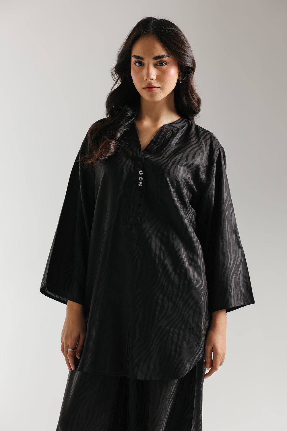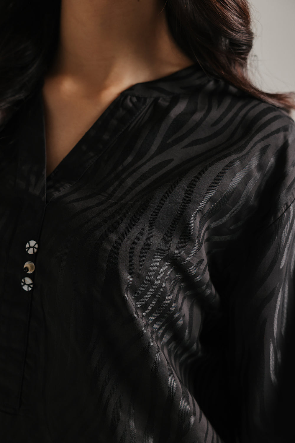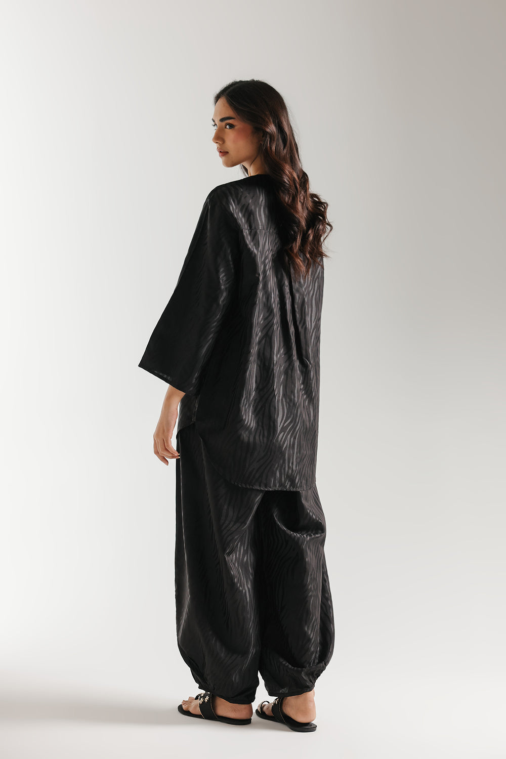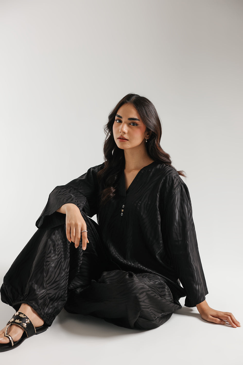 Step into effortless glamour with this ethereal two-piece ensemble, rendered in a classic black that radiates soft luminosity. The suit is distinguished by a sophisticated, all-over zebra-stripe texture, adding a contemporary tactile dimension to the fluid, shimmering fabric. The shirt features a refined V-neckline and relaxed full-length sleeves, creating a polished silhouette that flows seamlessly into voluminous balloon-style shalwar. Whether attending an intimate daytime gathering or an elegant evening social, this suit ensures a presence that is both gracefully feminine and undeniably chic.