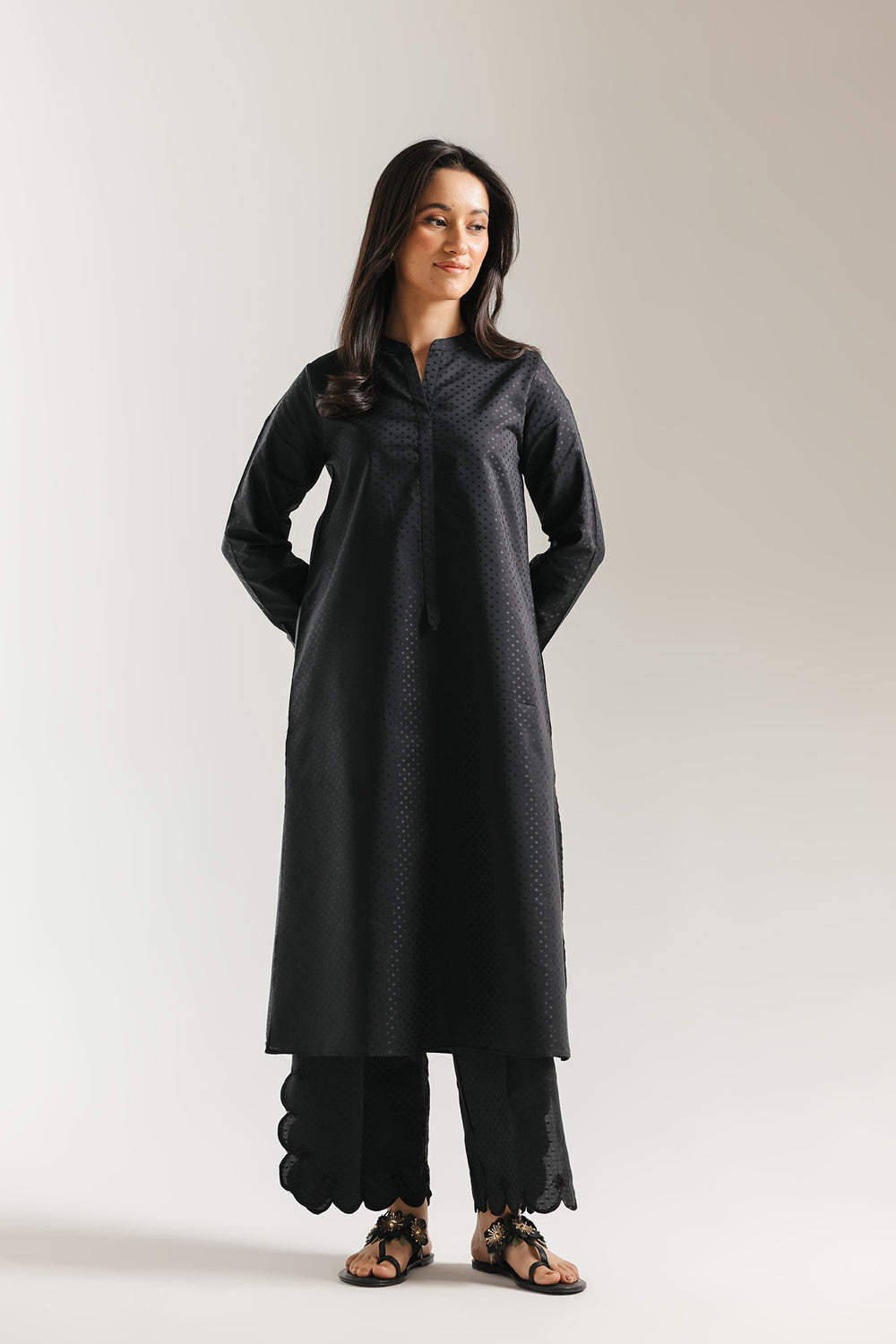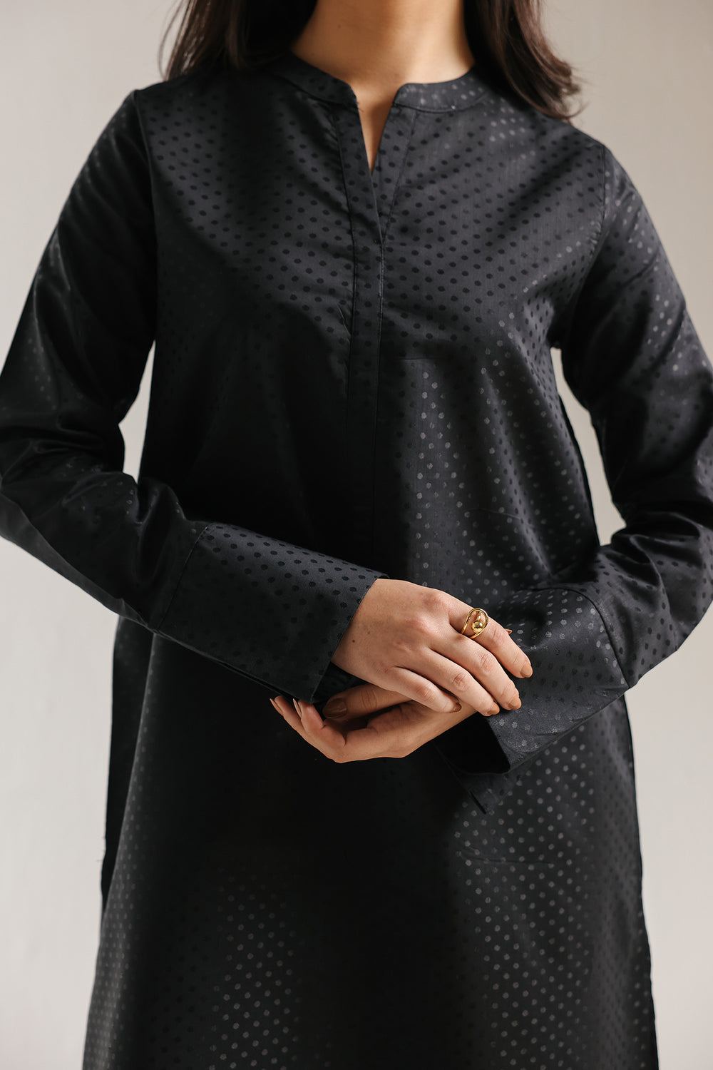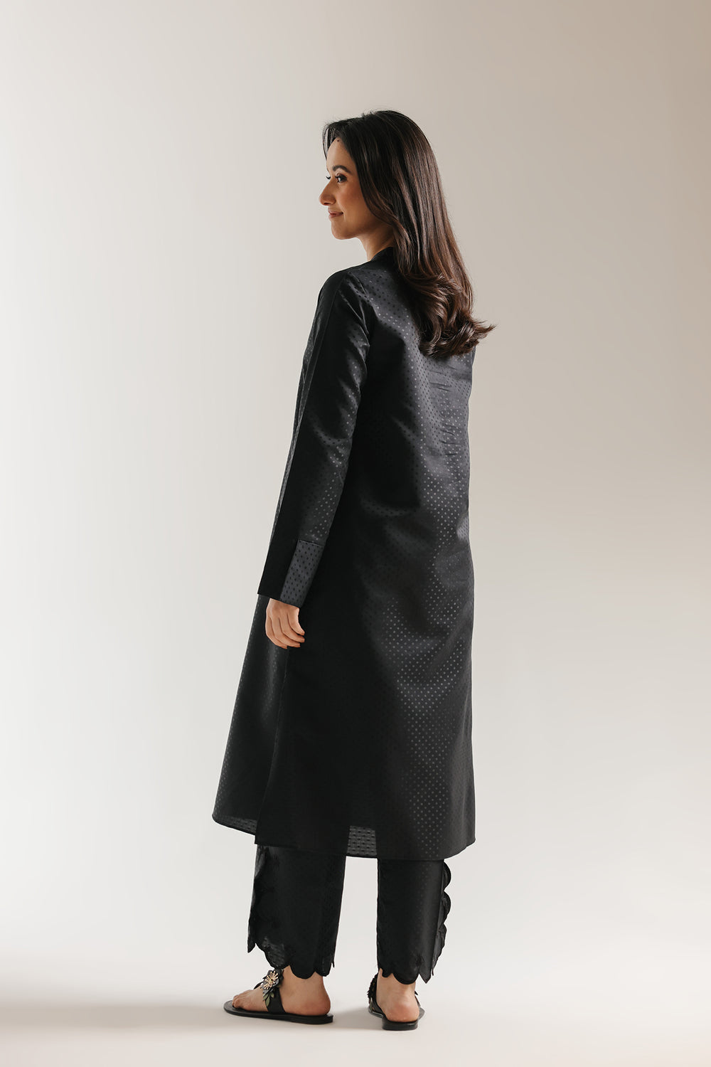 This jet black two-piece suit is an exquisite exercise in monochromatic texture, offering a sleek, contemporary update to a timeless classic. The shirt is crafted from a premium fabric featuring a subtle, all-over self-jacquard dot pattern that catches the light for a multi-dimensional finish. It is designed with a modern V-neckline and a relaxed, straight-cut silhouette that hits just below the knee, providing a statuesque and elegant drape. The long, structured sleeves are finished with clean-cut cuffs, mirroring the polished aesthetic of the coordinating straight-leg trousers. A standout feature of this ensemble is the dramatic scalloped embroidery at the trouser hems, adding a touch of feminine intricacy to an otherwise minimalist look. Perfect for evening soirées or elevated formal wear, this suit exudes quiet confidence and high-end sophistication.