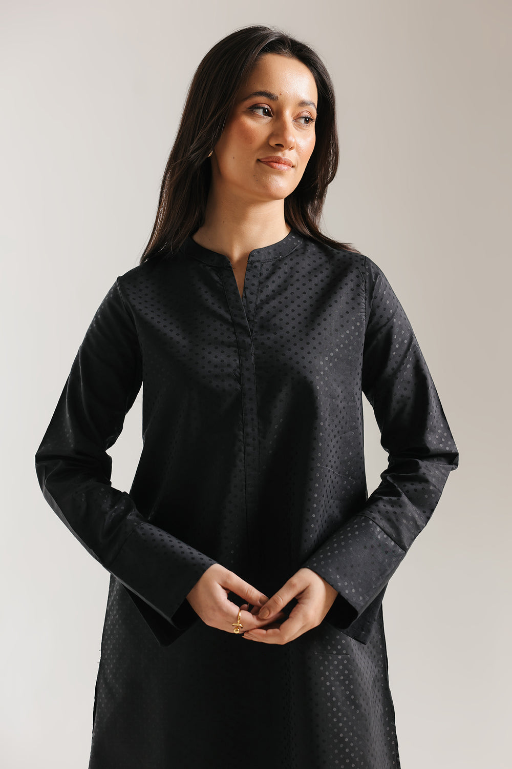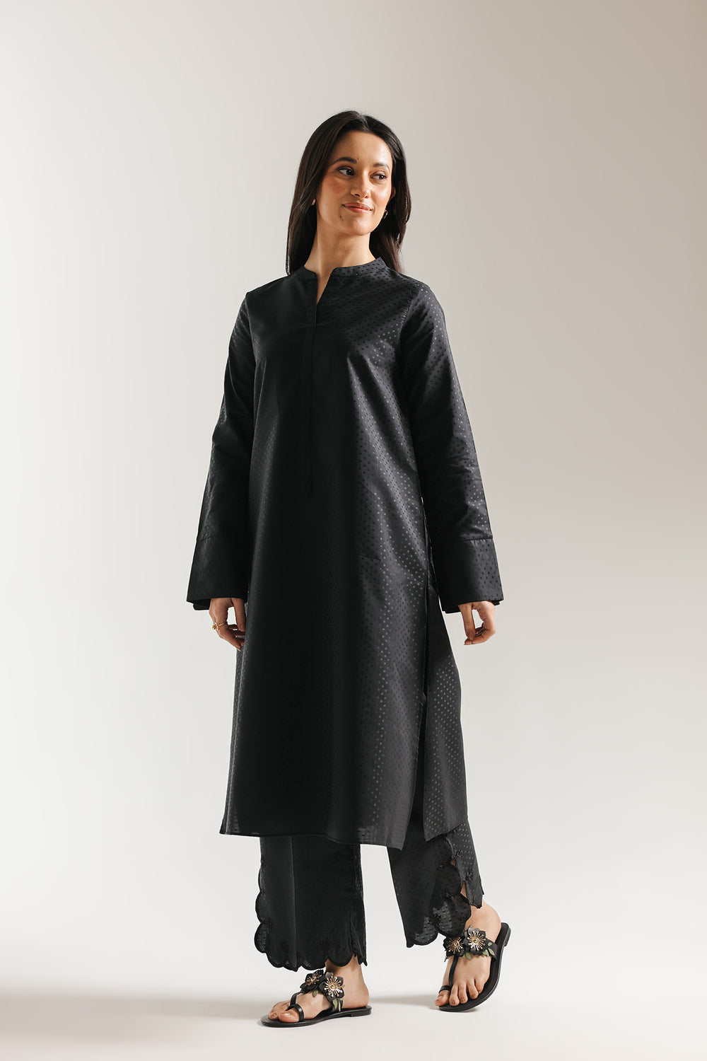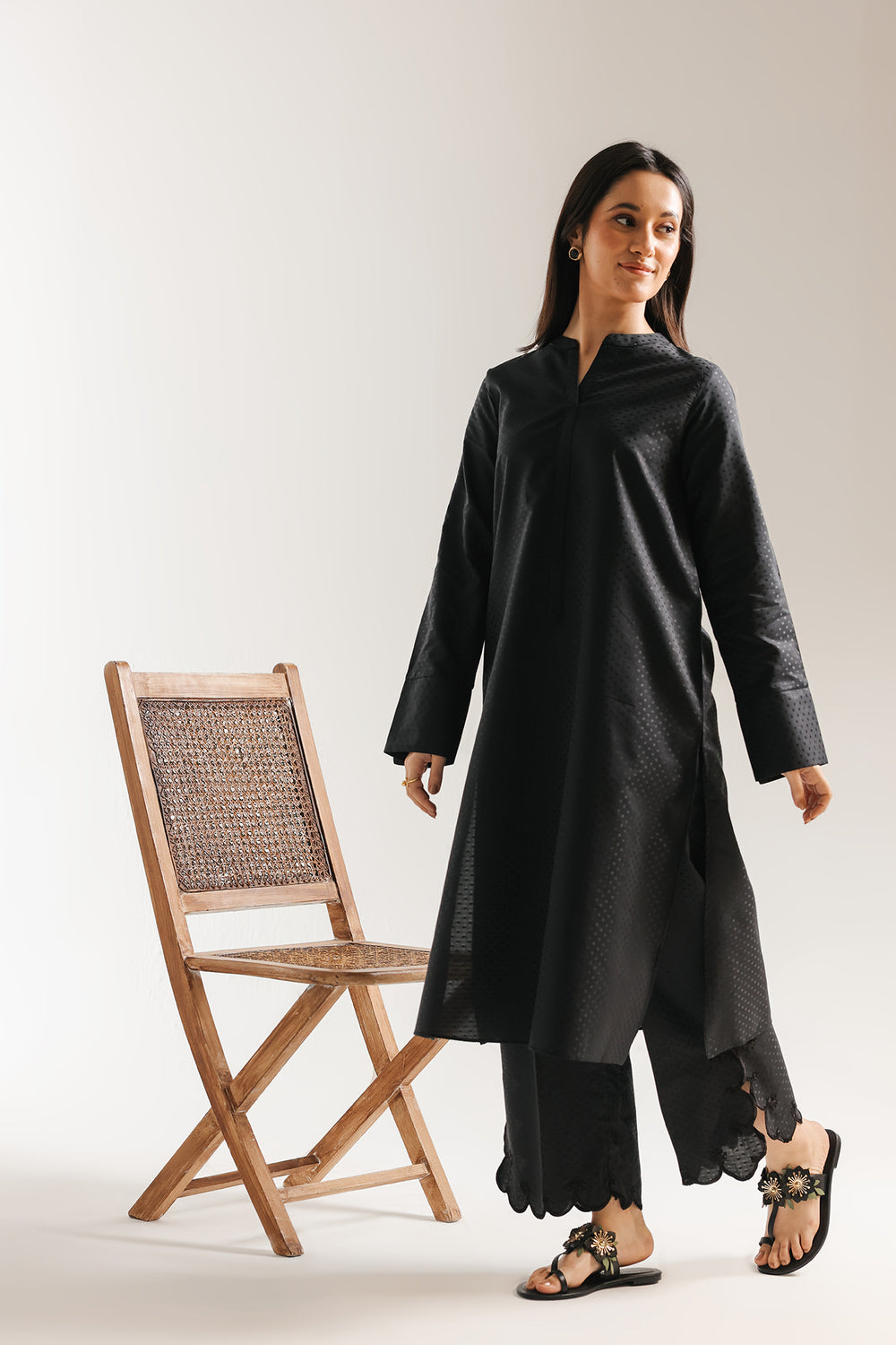 This jet black two-piece suit is an exquisite exercise in monochromatic texture, offering a sleek, contemporary update to a timeless classic. The shirt is crafted from a premium fabric featuring a subtle, all-over self-jacquard dot pattern that catches the light for a multi-dimensional finish. It is designed with a modern V-neckline and a relaxed, straight-cut silhouette that hits just below the knee, providing a statuesque and elegant drape. The long, structured sleeves are finished with clean-cut cuffs, mirroring the polished aesthetic of the coordinating straight-leg trousers. A standout feature of this ensemble is the dramatic scalloped embroidery at the trouser hems, adding a touch of feminine intricacy to an otherwise minimalist look. Perfect for evening soirées or elevated formal wear, this suit exudes quiet confidence and high-end sophistication.