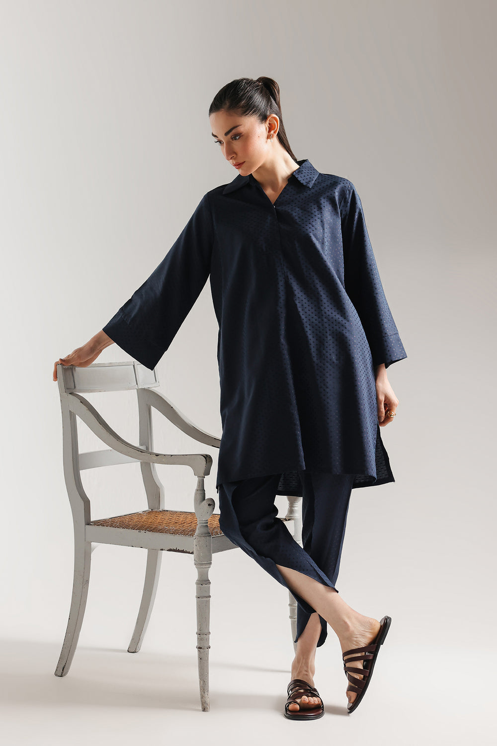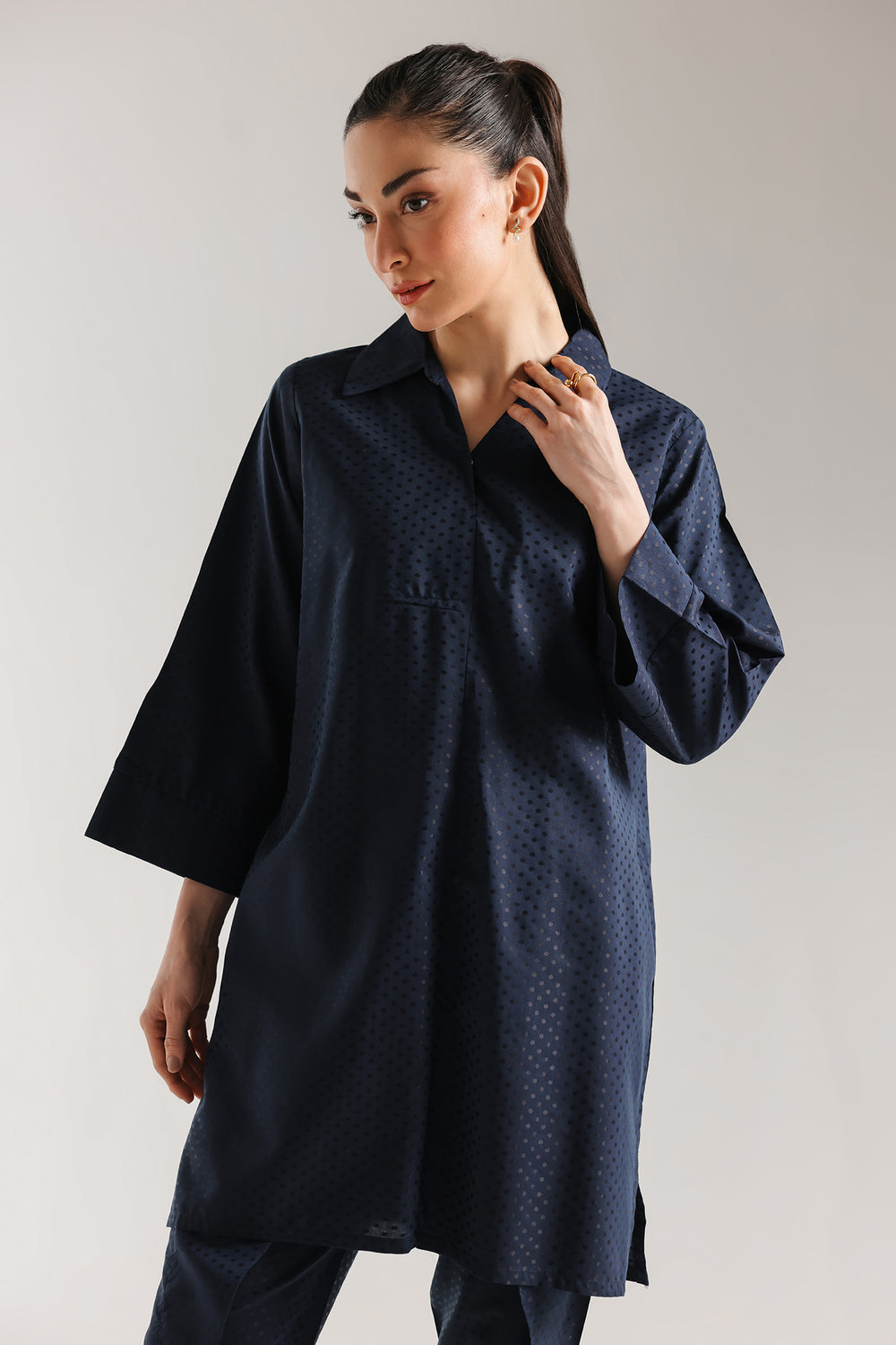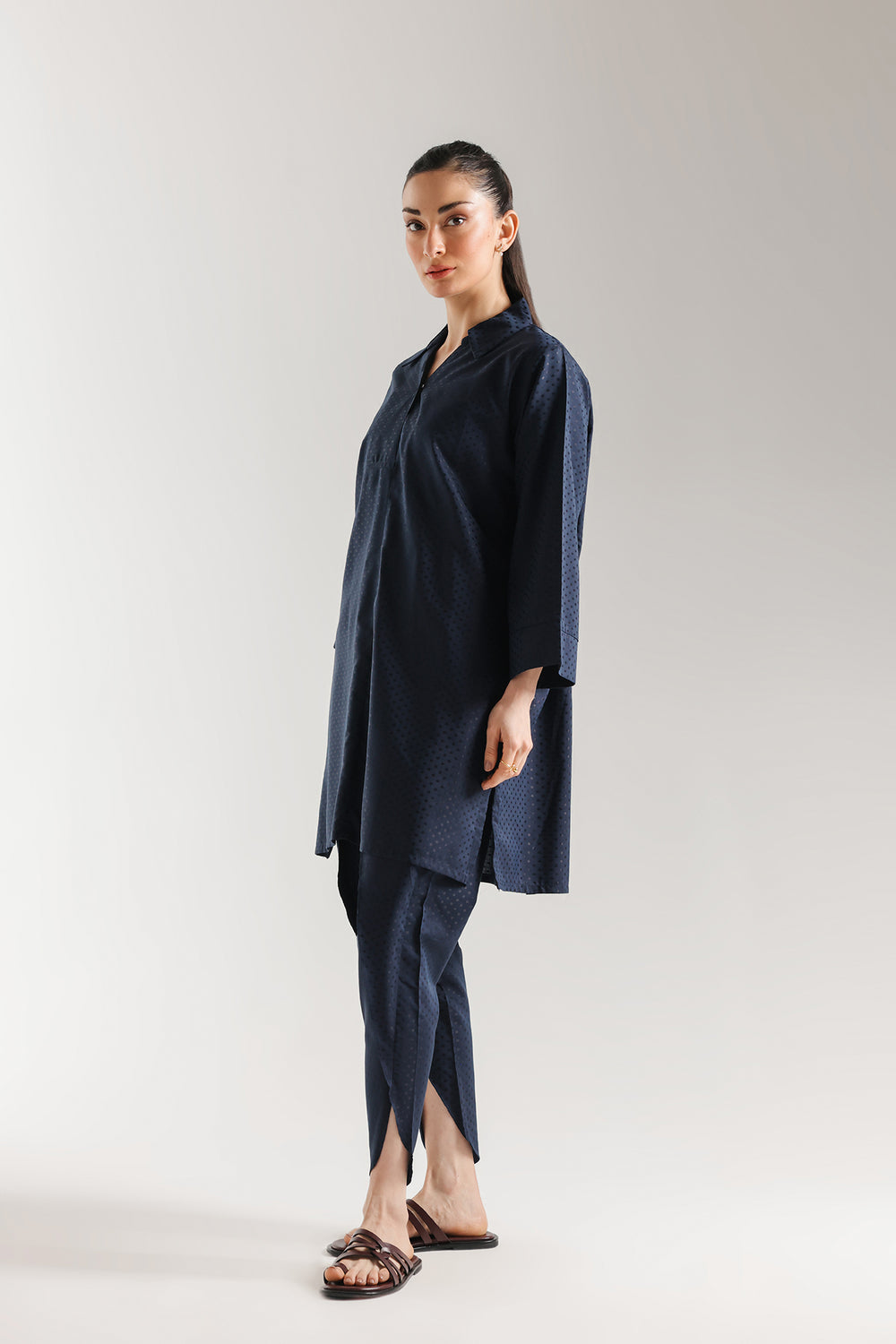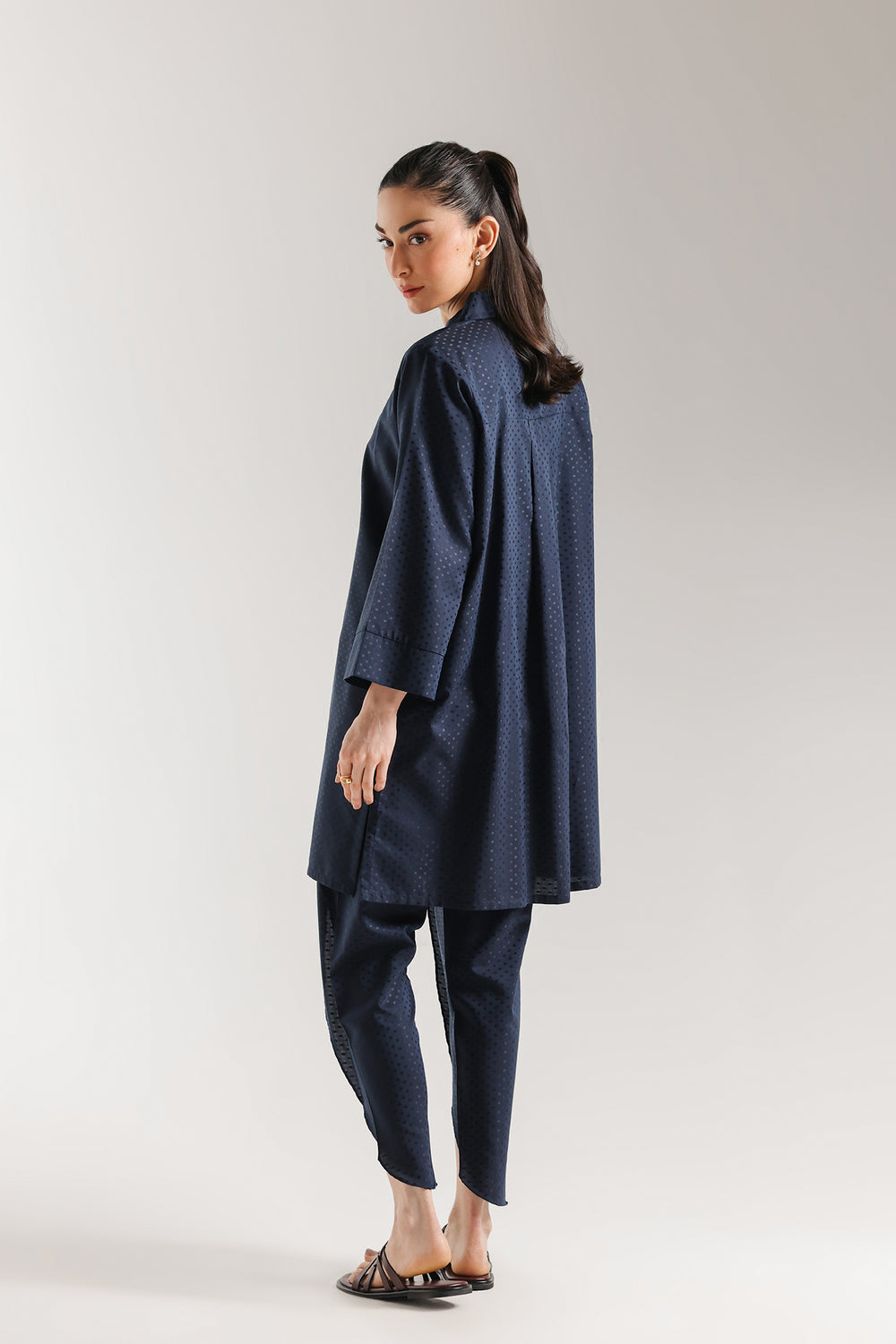 Infuse your wardrobe with a touch of radiant luxury with this sophisticated two-piece ensemble, rendered in a luminous navy blue. The suit is crafted from a premium jacquard fabric, featuring an all-over micro-polka-dot pattern that catches the light to create a subtle, rhythmic shimmer. Perfectly suited for sophisticated evening social gatherings or high-profile daytime events, this suit offers a presence that is both effortlessly chic and undeniably opulent.