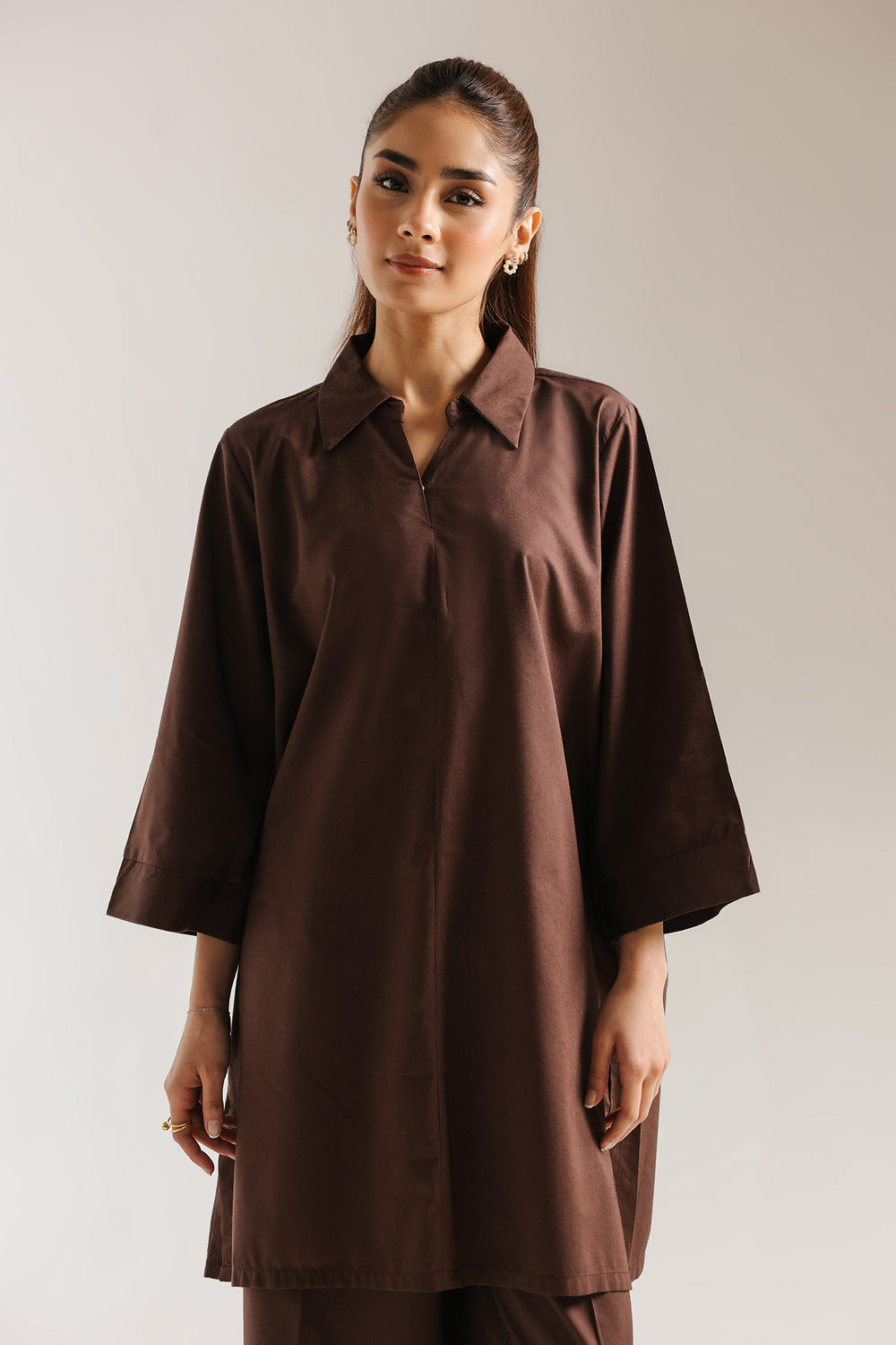 This dark oatmeal two-piece set is a masterclass in rich, monochromatic styling, offering a deep, earthy tone that serves as a versatile cornerstone for the modern wardrobe. Crafted from premium, structured fabric, the shirt features a sophisticated oversized silhouette with an effortless V-neckline and a classic pointed collar. The design is elevated by wide, dropped sleeves with clean-finished cuffs and a straight hemline with side slits for a contemporary drape. Paired with matching straight-leg trousers featuring a structured hem, this ensemble delivers a polished, streamlined look that transitions seamlessly from professional settings to relaxed, chic outings. Whether worn as a coordinated set or styled as separates, this suit exudes understated luxury and timeless style.