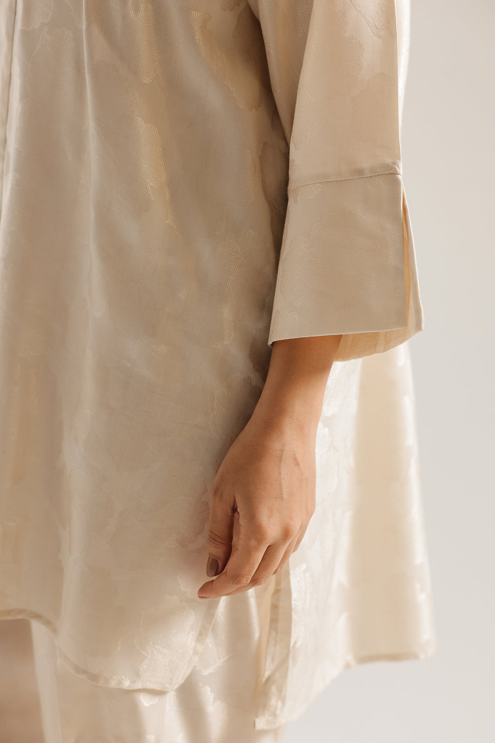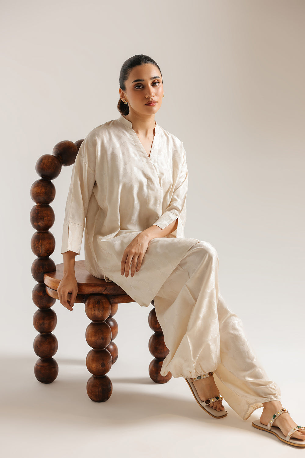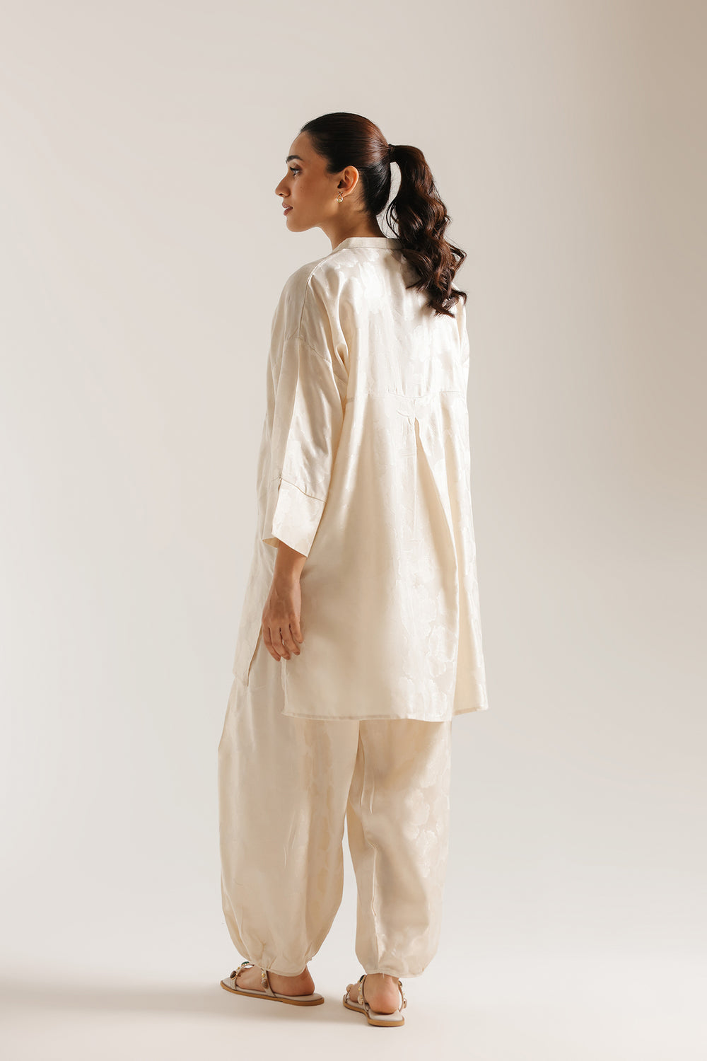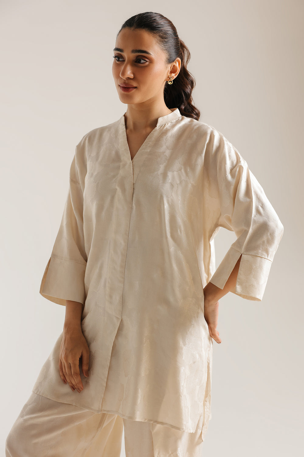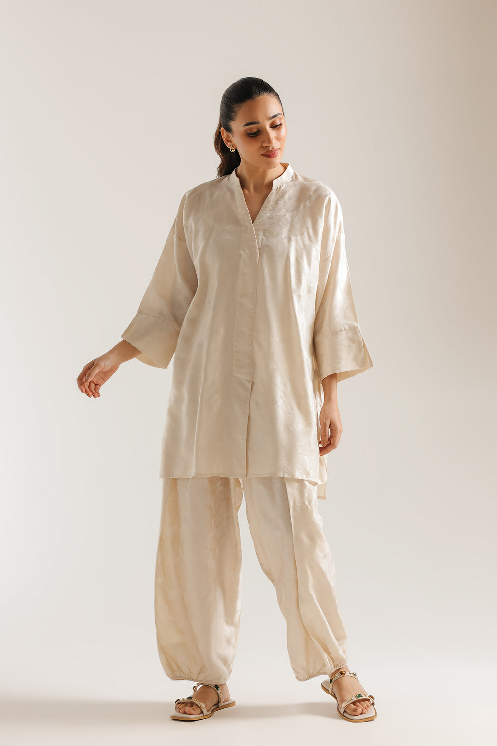 Exude a sense of effortless luxury with this off white suit. Crafted with a subtle, tonal jacquard finish, the tunic features a refined V-neckline and relaxed sleeves for a modern silhouette. Paired with coordinating voluminous balloon fit shalwar that gather gracefully at the ankles, this monochromatic ensemble offers a sophisticated and luminous look, perfect for elevated daytime wear or understated evening elegance.