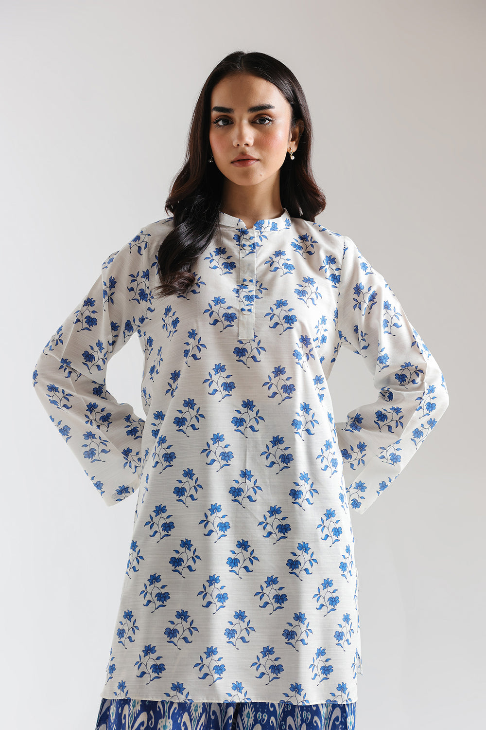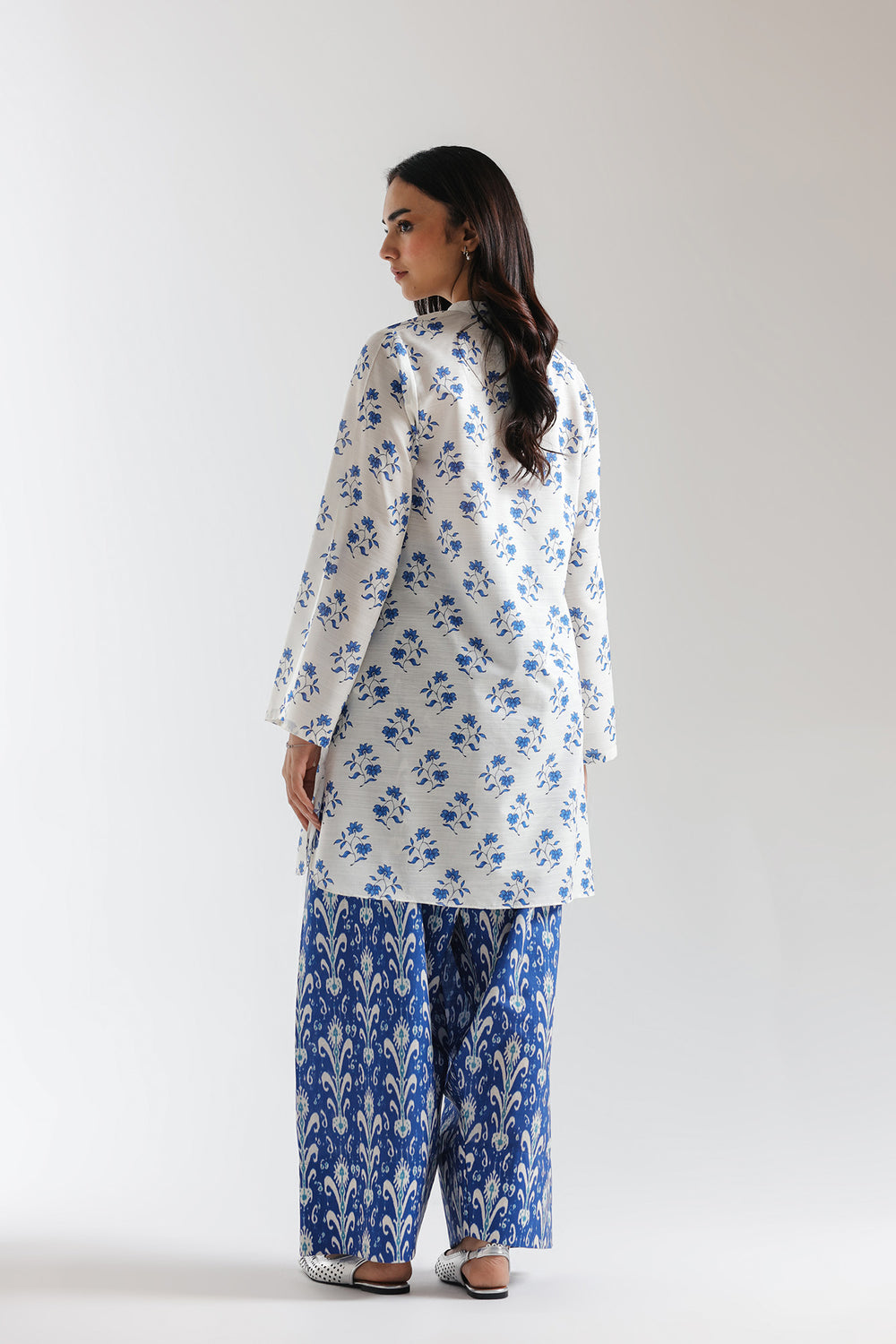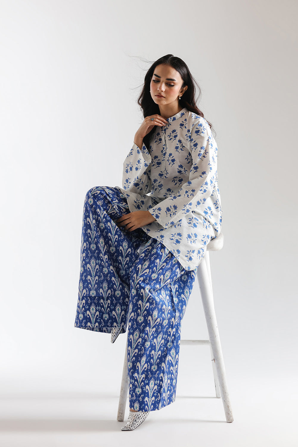 This thoughtfully coordinated printed suit merges traditional aesthetics with contemporary ease, featuring a harmonious interplay of complementary hues and patterns. The crisp white shirt showcases a delicate blue floral print, anchored by a refined mandarin collar with subtle placket detailing and cuff trim that adds polished finishing touches. Full-length sleeves maintain the elegant silhouette while the mid-thigh length offers versatile styling options. The coordinating palazzo trousers in rich, saturated blue feature an intricate block-printed ethnic motif that creates striking visual contrast while maintaining design cohesion. The generously cut wide-leg silhouette ensures comfortable movement and effortless drape.