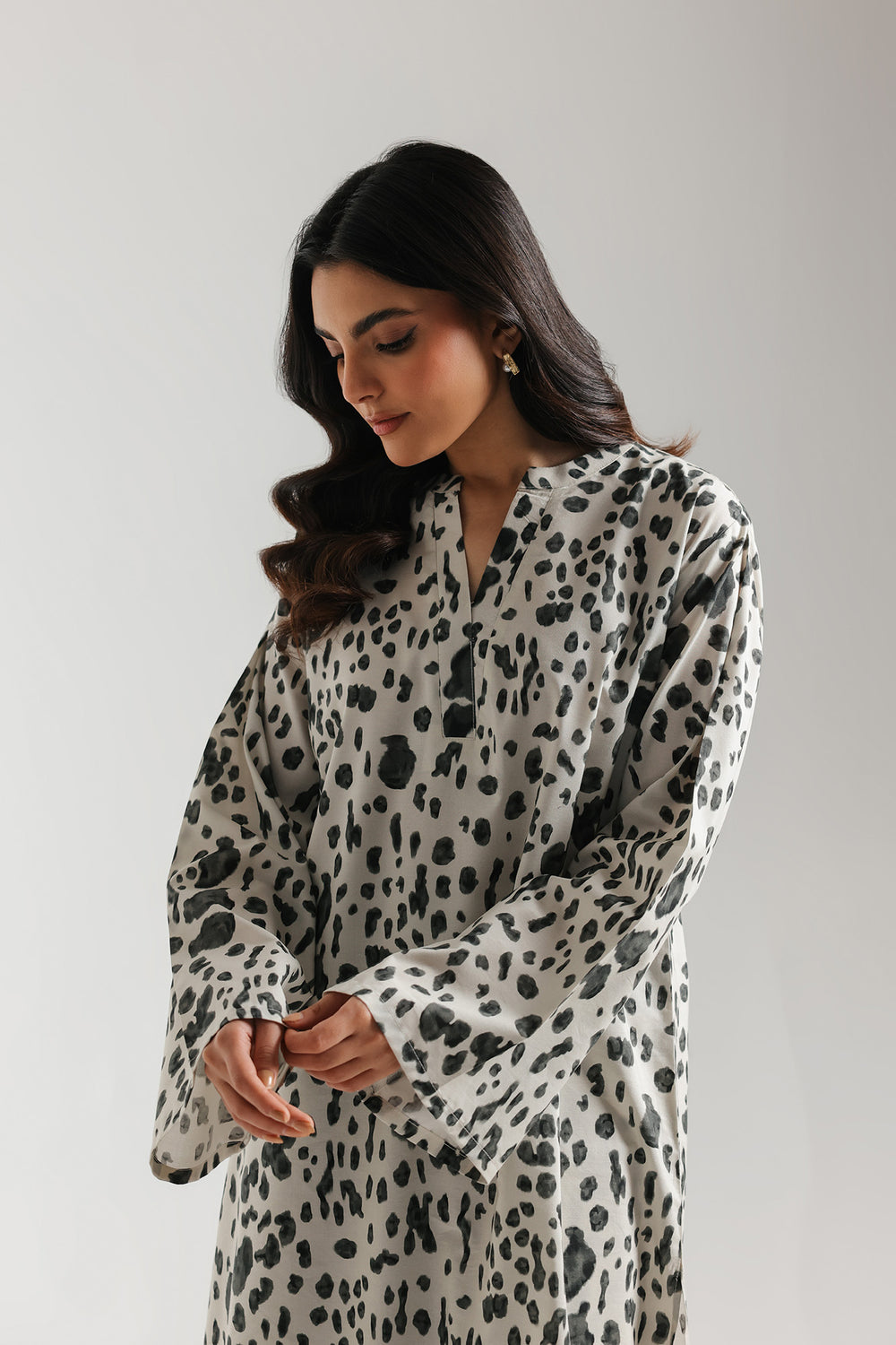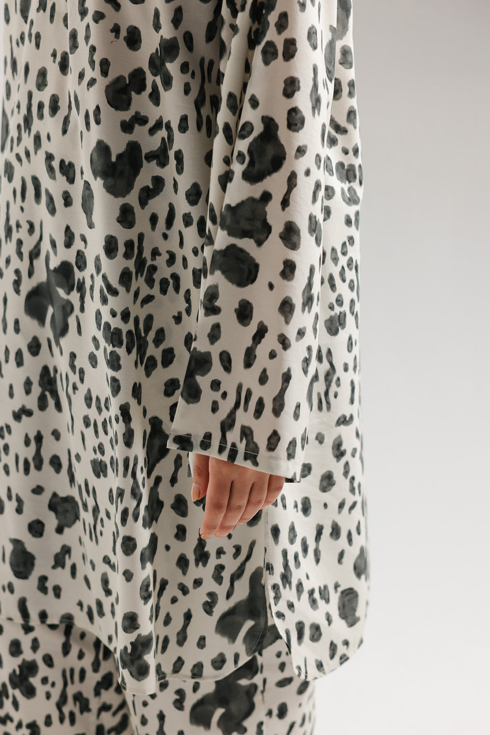 Make a bold and chic statement in this monochromatic printed co-ord suit, featuring a straight-cut tunic with a relaxed and fluid silhouette. The design is centered on a clean split V-neckline, offering a modern and minimalist aesthetic that perfectly complements the dynamic pattern. The ensemble is defined by an all-over abstract animal-inspired print in shades of charcoal black and soft grey against a crisp ivory background. The tunic features long, wide sleeves and a straight hemline for an effortless, contemporary drape. It is perfectly coordinated with matching wide-leg trouser, creating a cohesive and high-fashion look.